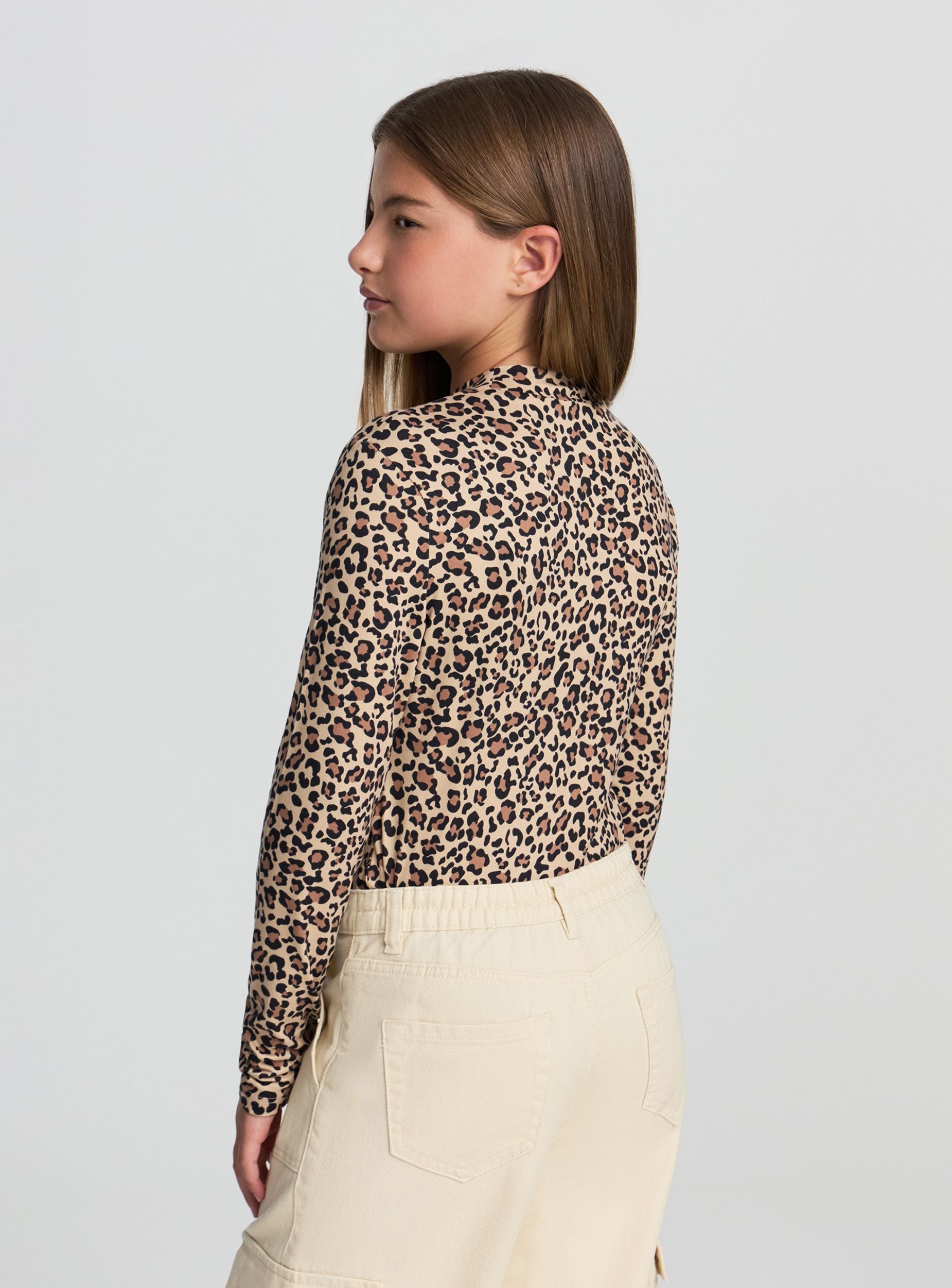 Long-sleeved girl's bodysuit with animal print. Ideal for creating casual and fashionable outfits, this garment stands out for its fitted design and practical closure. Perfect to pair with trousers or skirts, it offers a comfortable fit and an original look. A versatile piece to enrich the wardrobe with style.
