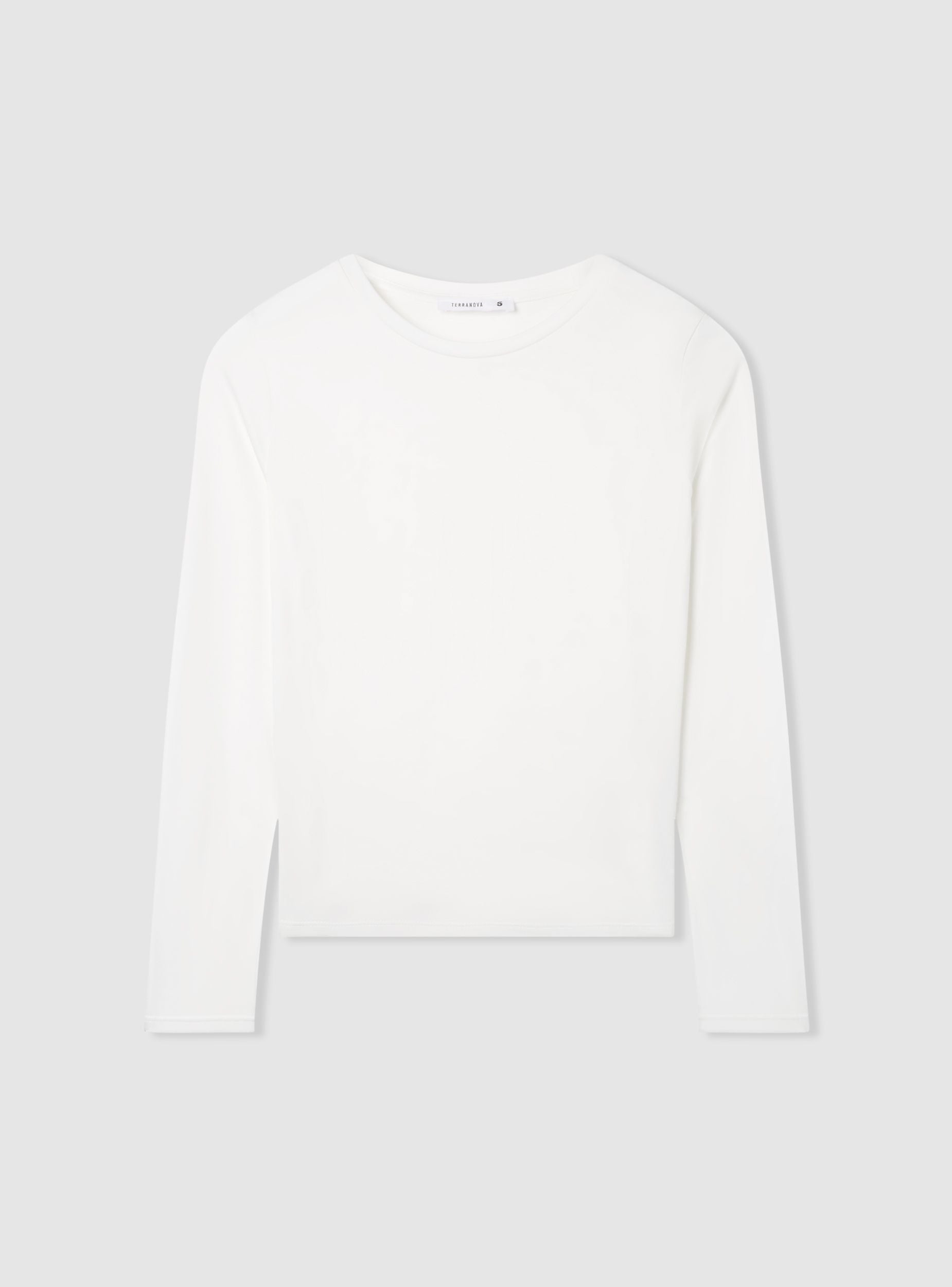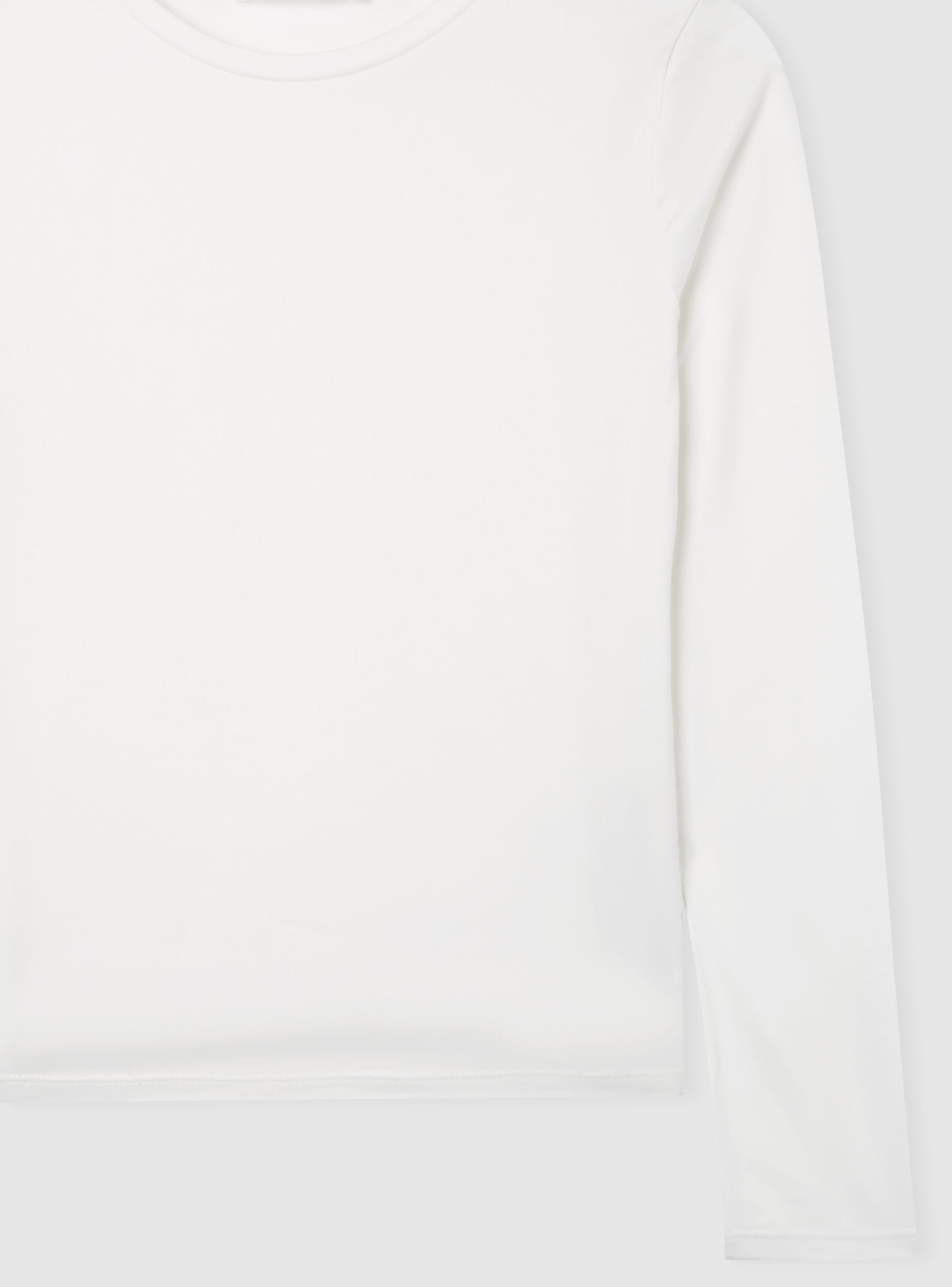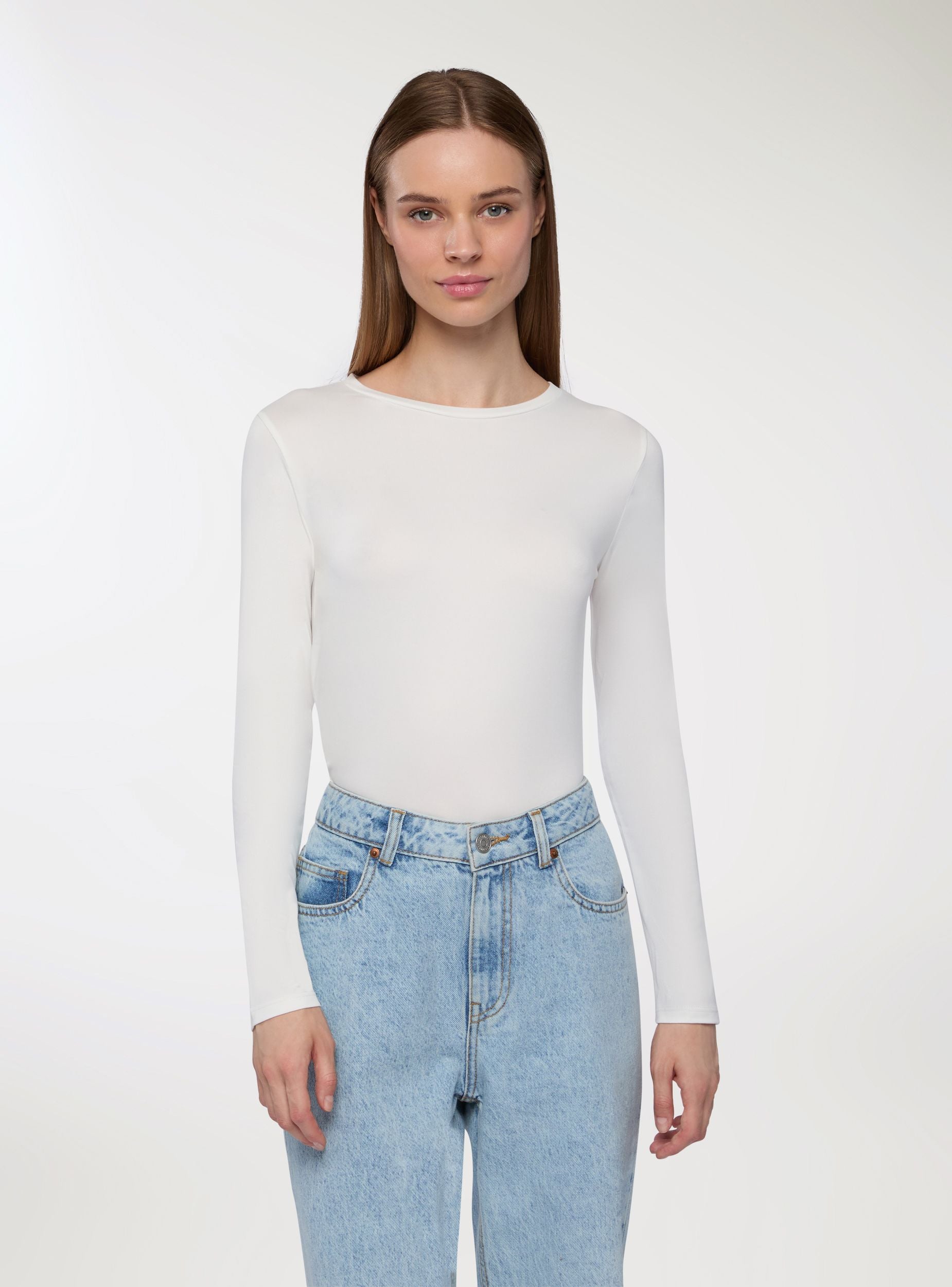 Women's basic long-sleeve top in stretch fabric. Perfect for every season, this top is a must-have in your wardrobe. Characterised by a minimalist design and solid colour, it features long sleeves and a comfortable crew neck. The stretch fabric ensures a snug and comfortable fit, naturally following the lines of the body. Ideal for wearing alone in casual looks or as a layer under jackets, blazers, or cardigans during the colder months, it easily adapts to any occasion, from the office to leisure time. A versatile piece that combines simplicity and practicality for a consistently polished style.