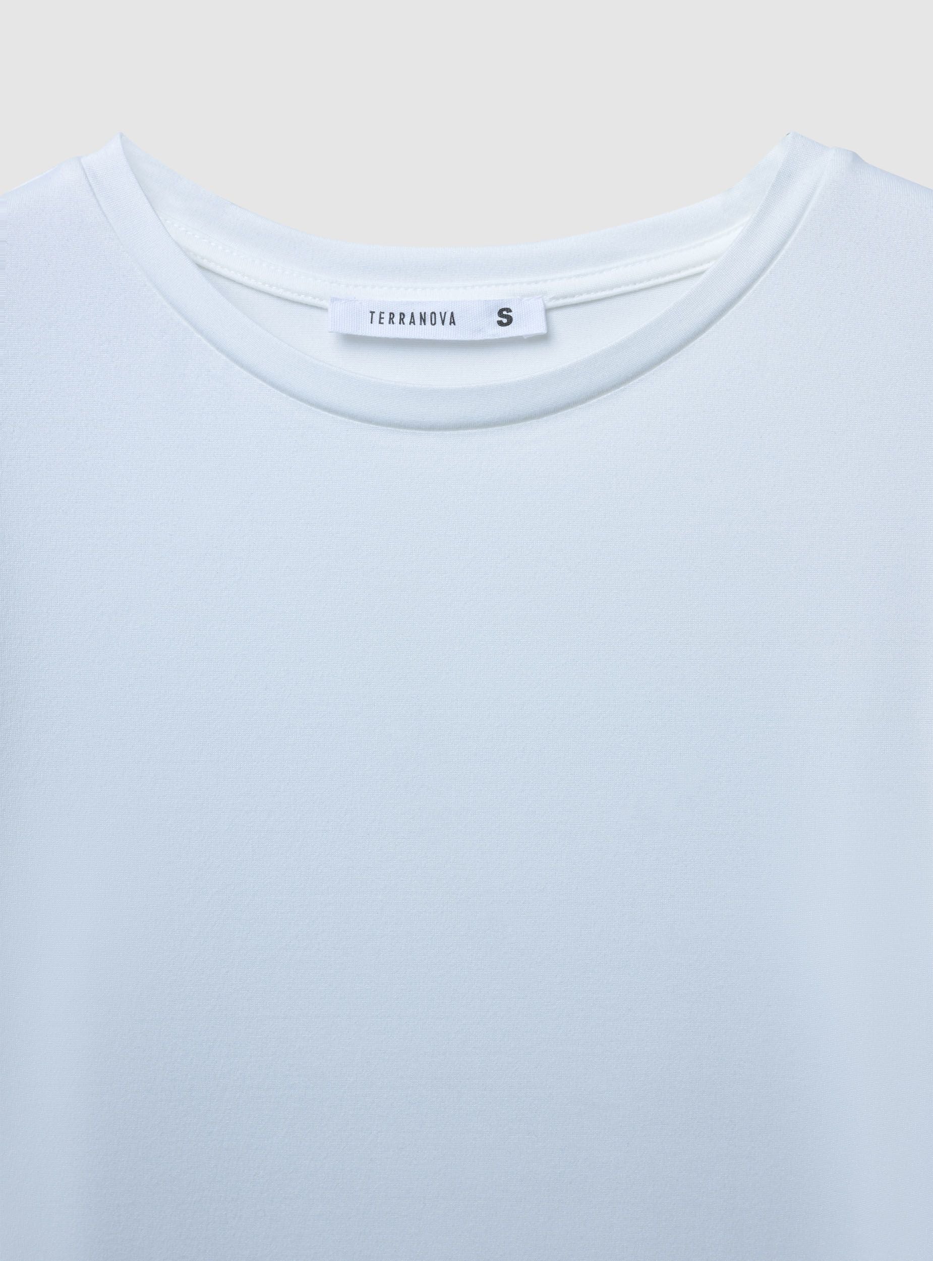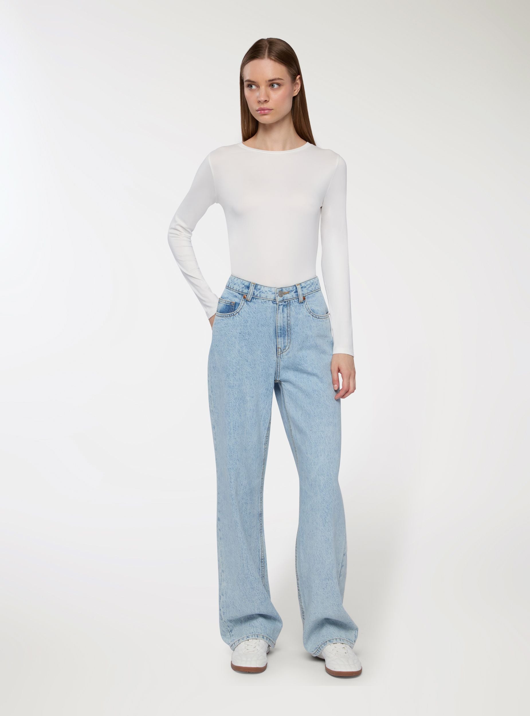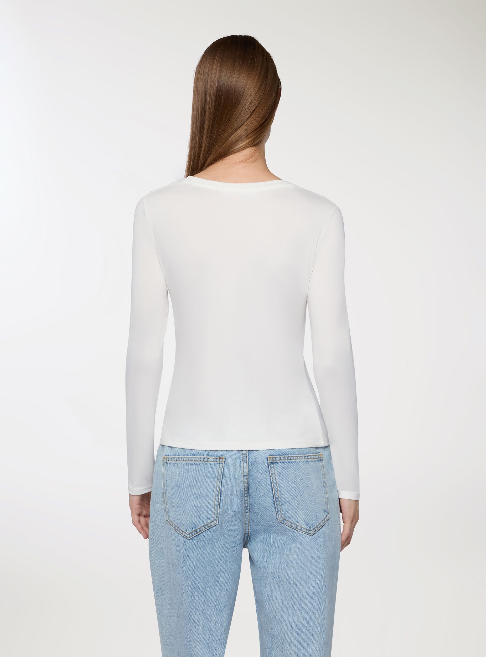 Women's basic long-sleeve top in stretch fabric. Perfect for every season, this top is a must-have in your wardrobe. Characterised by a minimalist design and solid colour, it features long sleeves and a comfortable crew neck. The stretch fabric ensures a snug and comfortable fit, naturally following the lines of the body. Ideal for wearing alone in casual looks or as a layer under jackets, blazers, or cardigans during the colder months, it easily adapts to any occasion, from the office to leisure time. A versatile piece that combines simplicity and practicality for a consistently polished style.