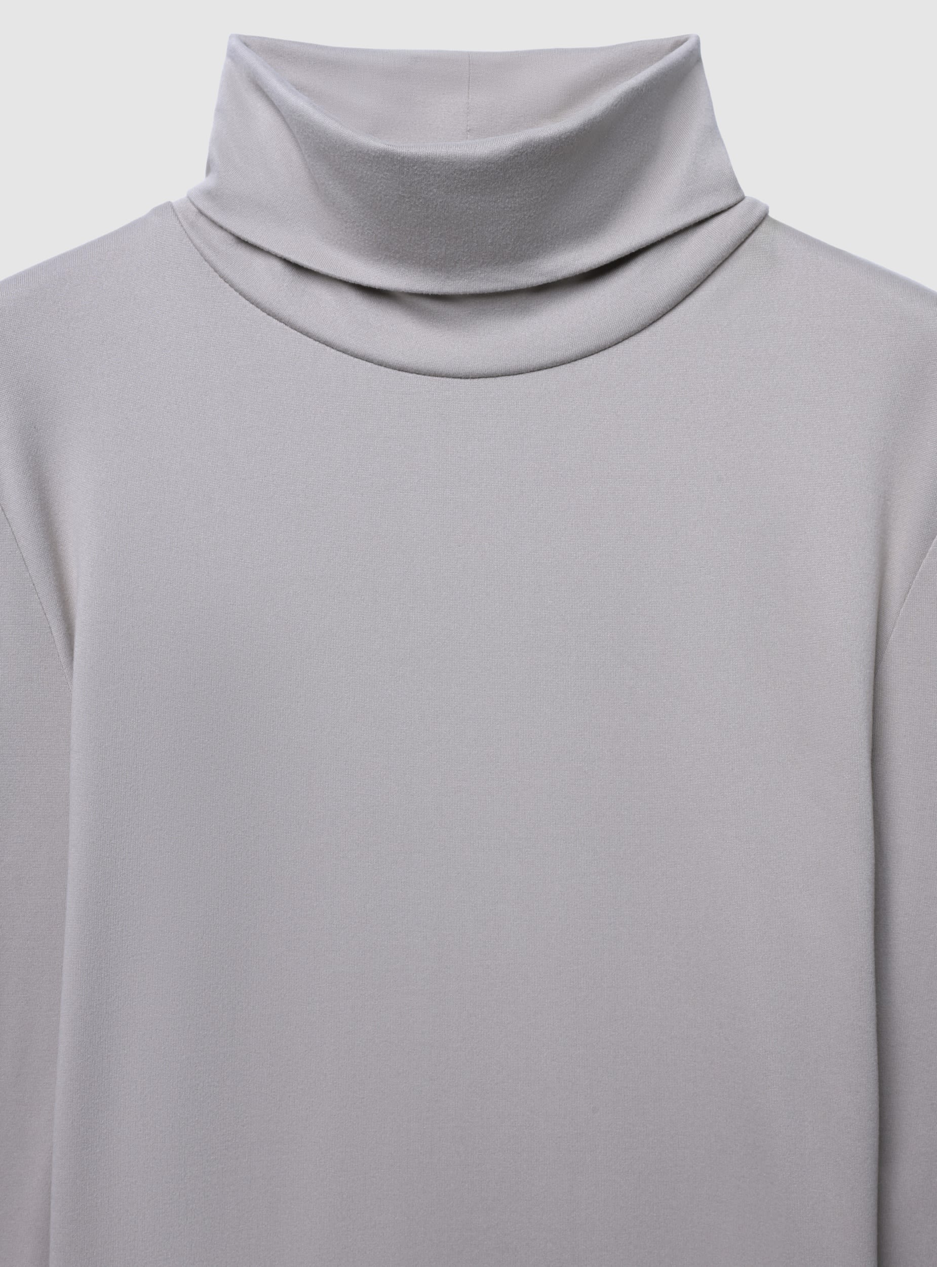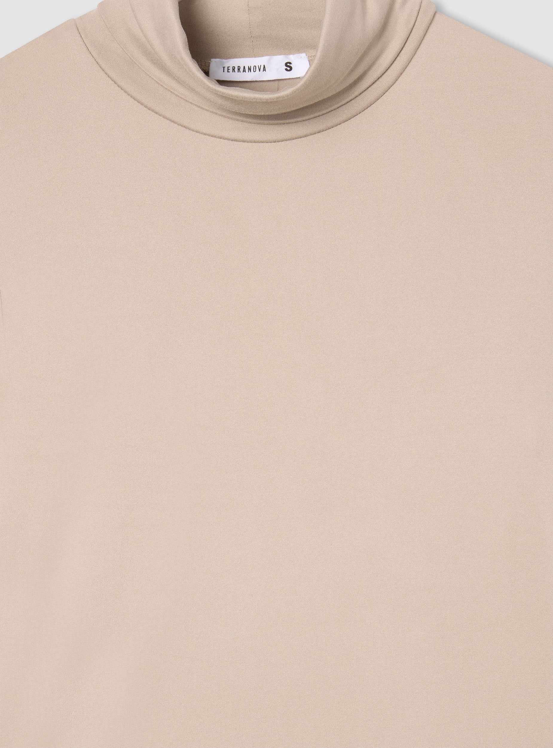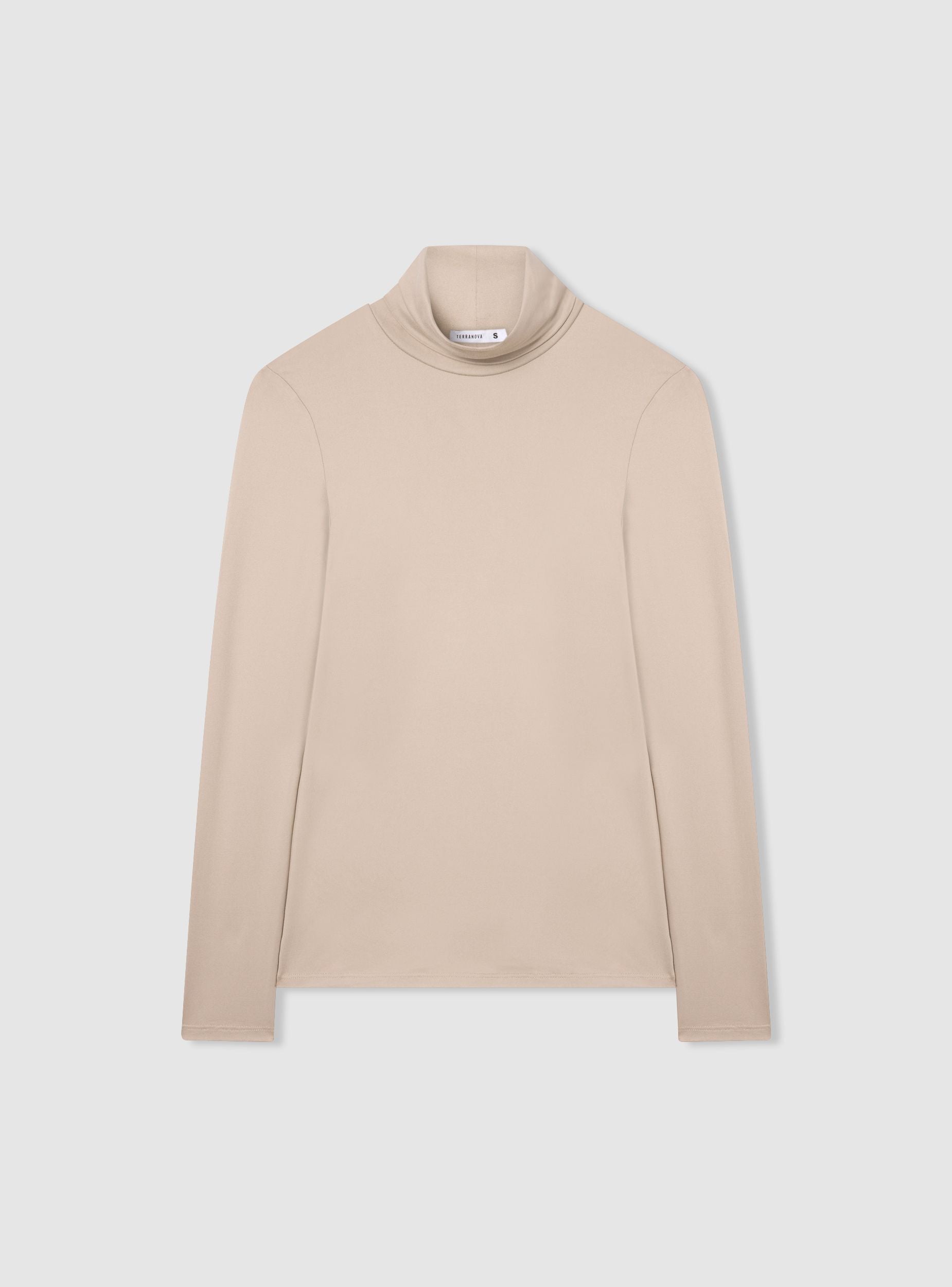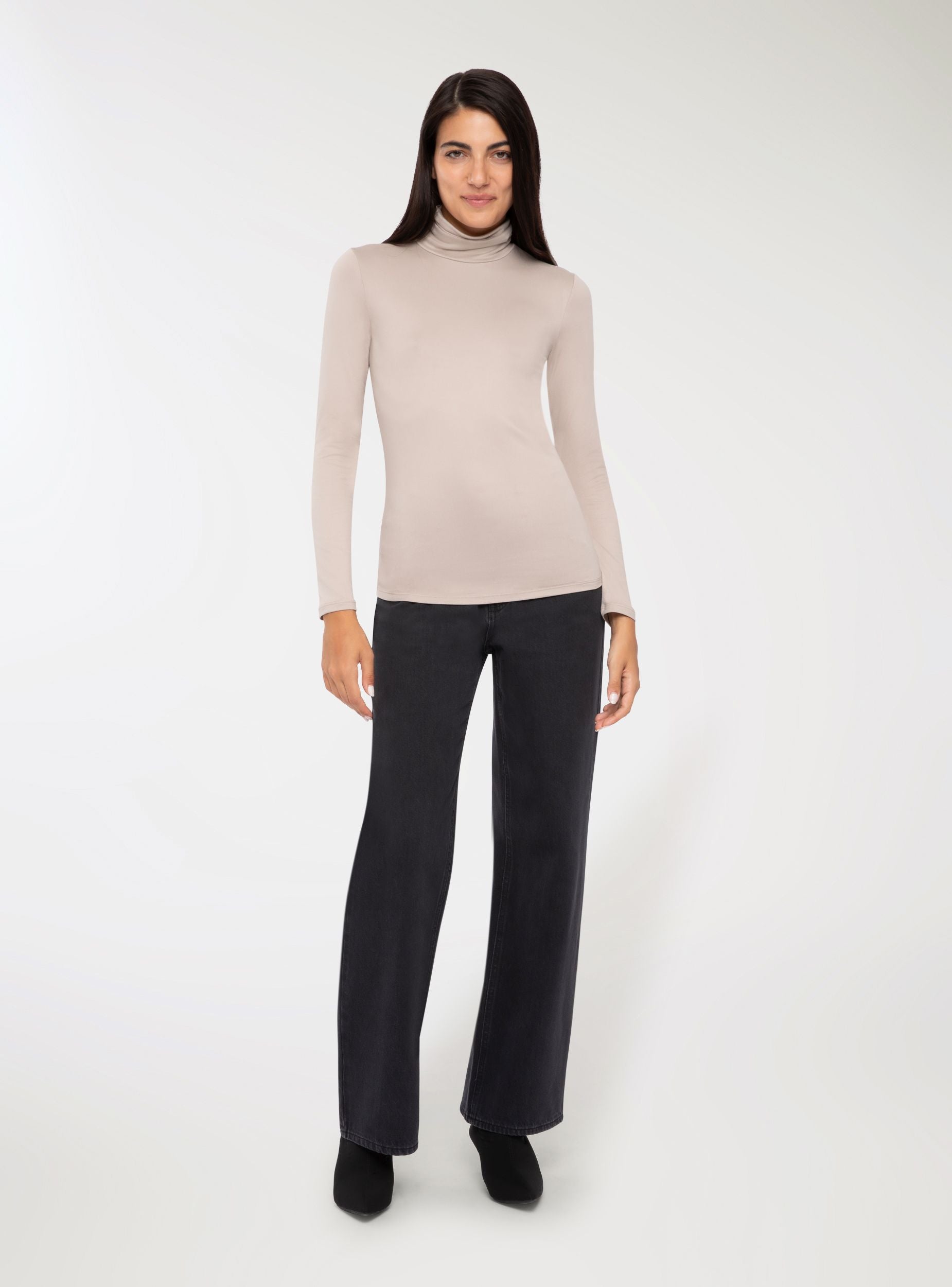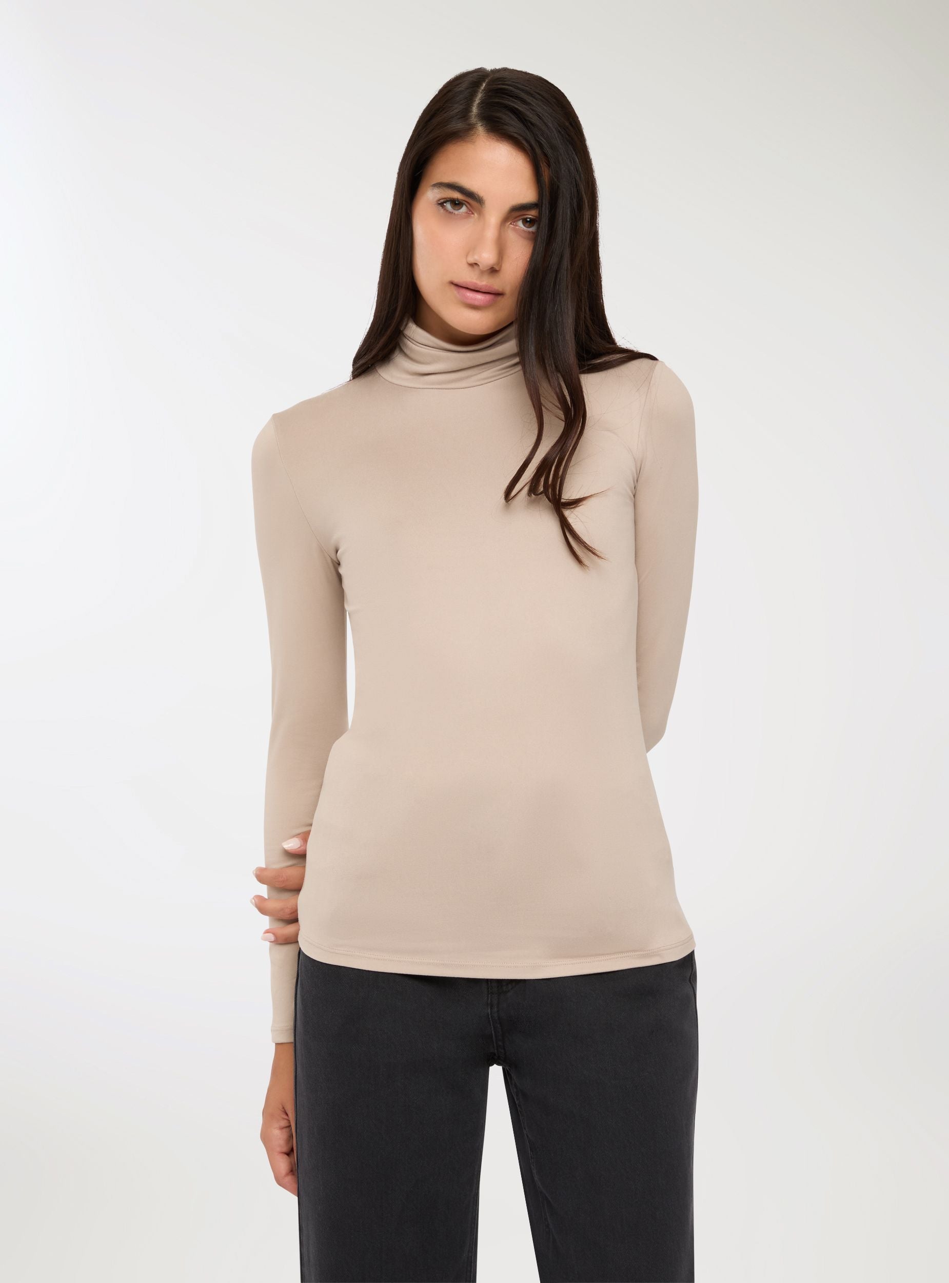 Women's long-sleeved turtleneck top, basic and essential. This top is the ideal piece for those seeking a sober and versatile style. The solid colour design and the fitted silhouette enhance the figure without compromising on comfort, while the turtleneck adds a refined and contemporary touch, perfect for stylishly tackling the cooler days. The long sleeves and stretchy fabric make it comfortable to wear on any occasion, whether on its own or as a first layer under jackets or cardigans. Perfect for the office, leisure time, or a minimal chic look, it is an essential basic top to always have on hand in your wardrobe.Details