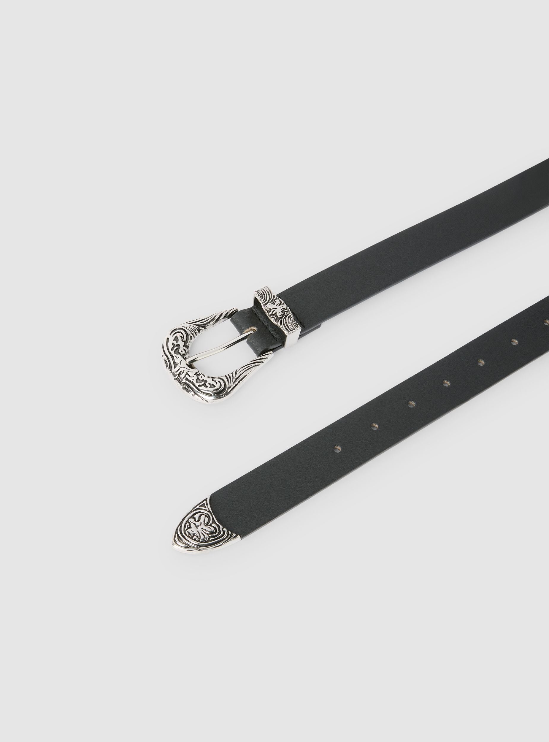 Ideal women's belt to complete casual outfits. Perfect for enhancing the silhouette, it easily pairs with trousers, skirts, or dresses. The design featuring a decorated western-style buckle adds a unique touch, making it a versatile accessory for various occasions. An essential item to enrich the wardrobe with a refined and functional detail.Details