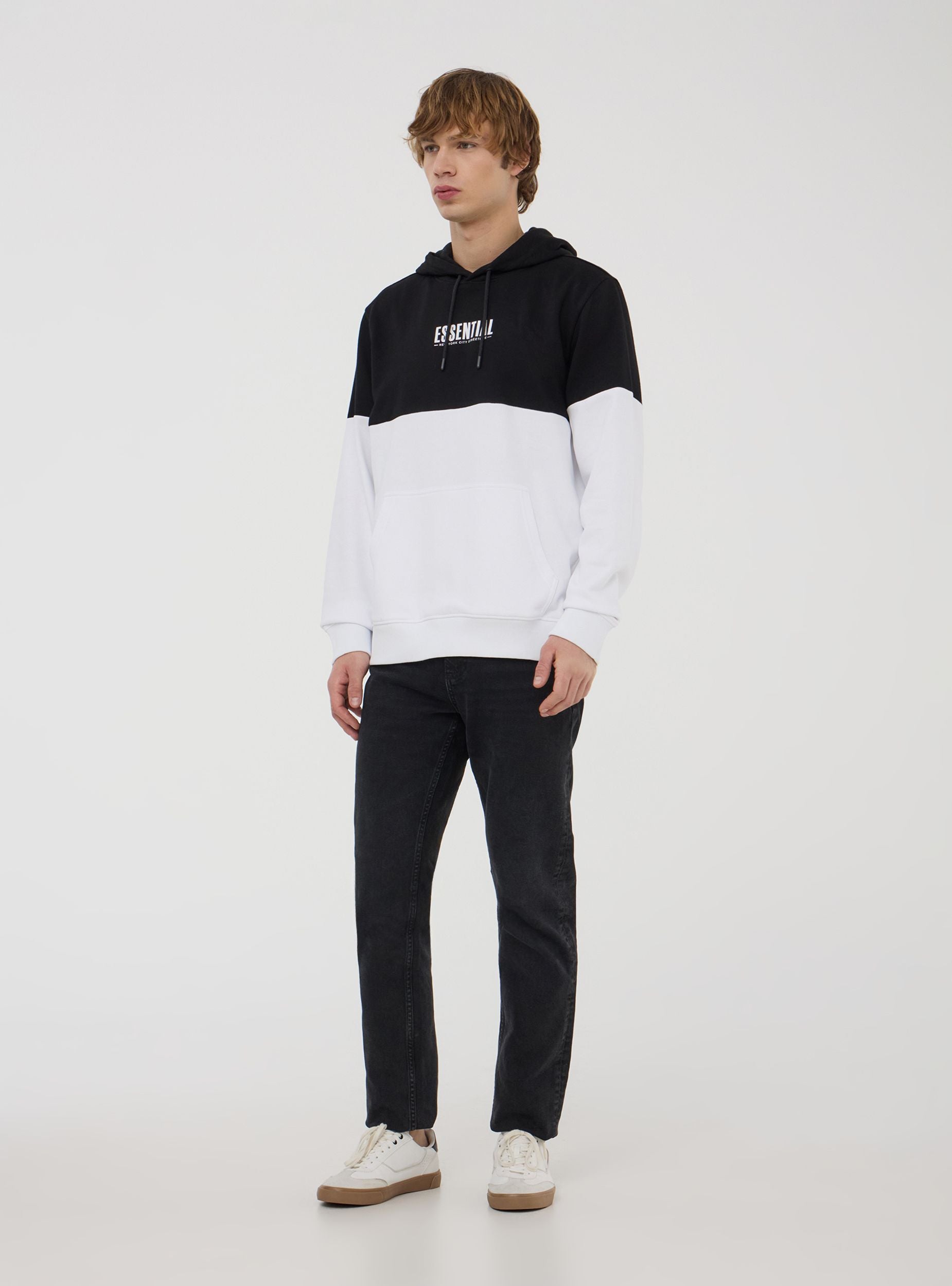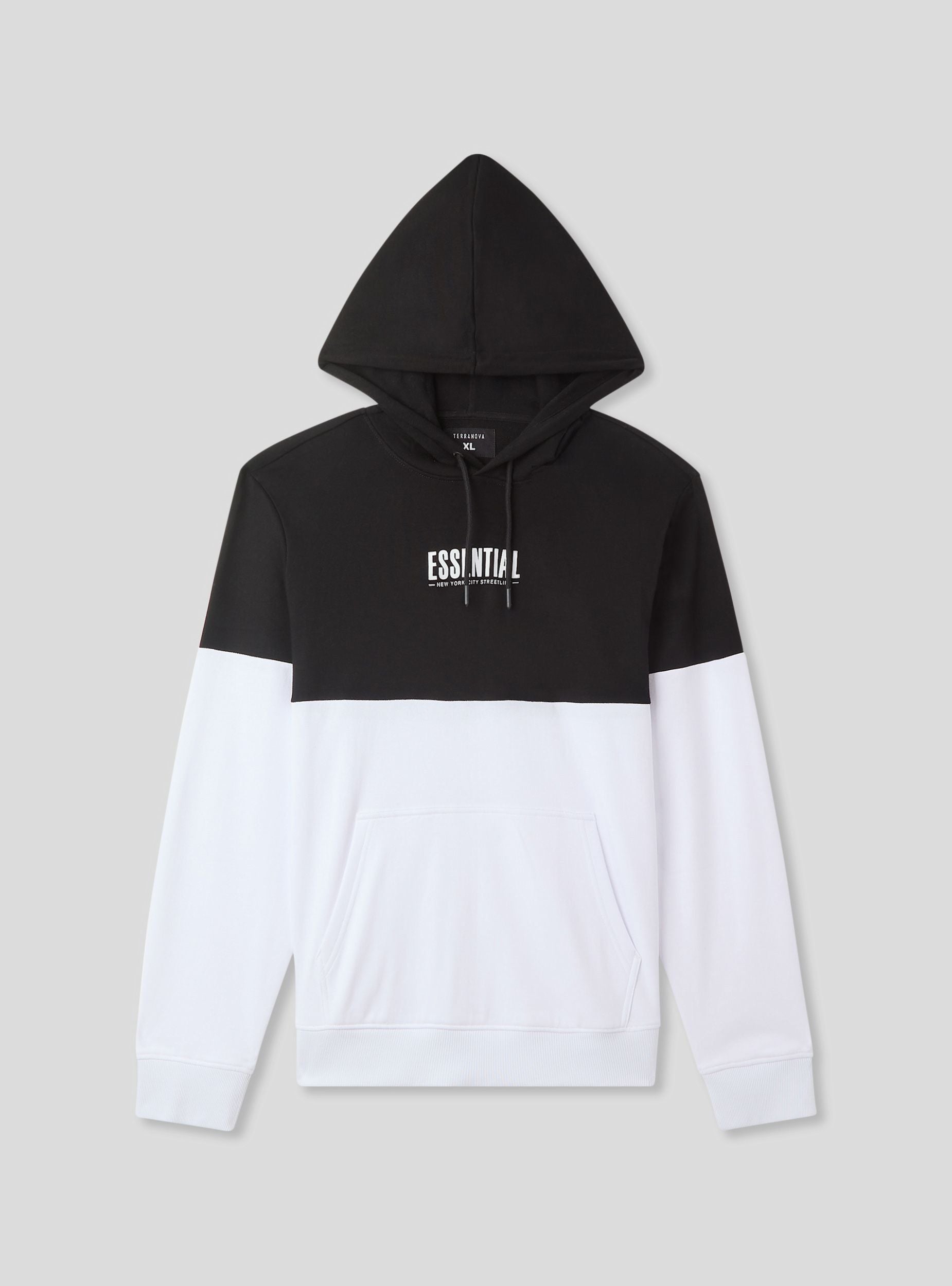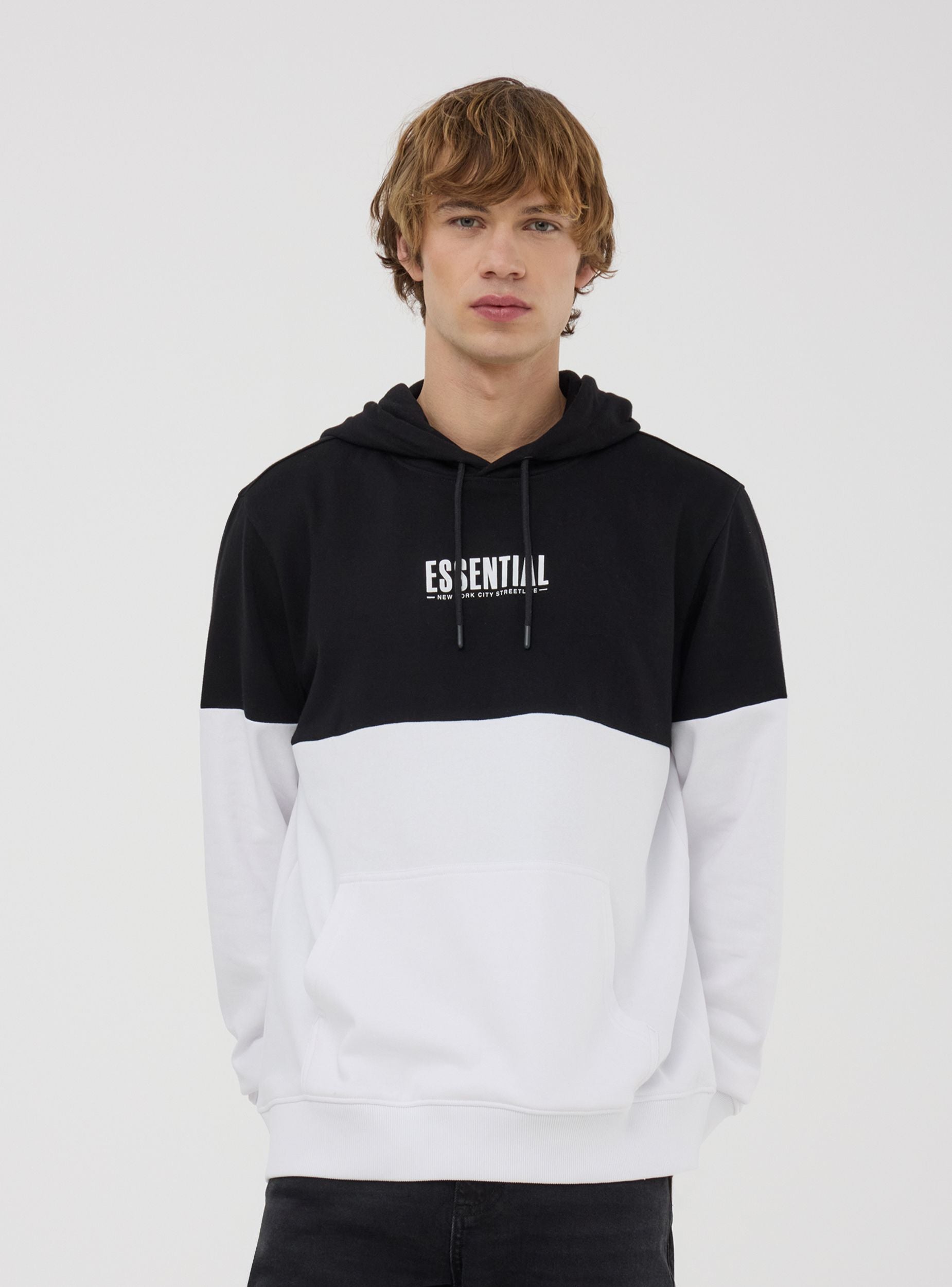 Lightweight men's long-sleeved sweatshirt, without a zip, featuring an adjustable hood with drawstring and a practical kangaroo pocket. The two-tone design and front lettering add a modern and edgy touch. Perfect for a casual and sporty look, it pairs easily with jeans, joggers, or cargo trousers, making it ideal for leisure time, outings with friends, or more relaxed days.