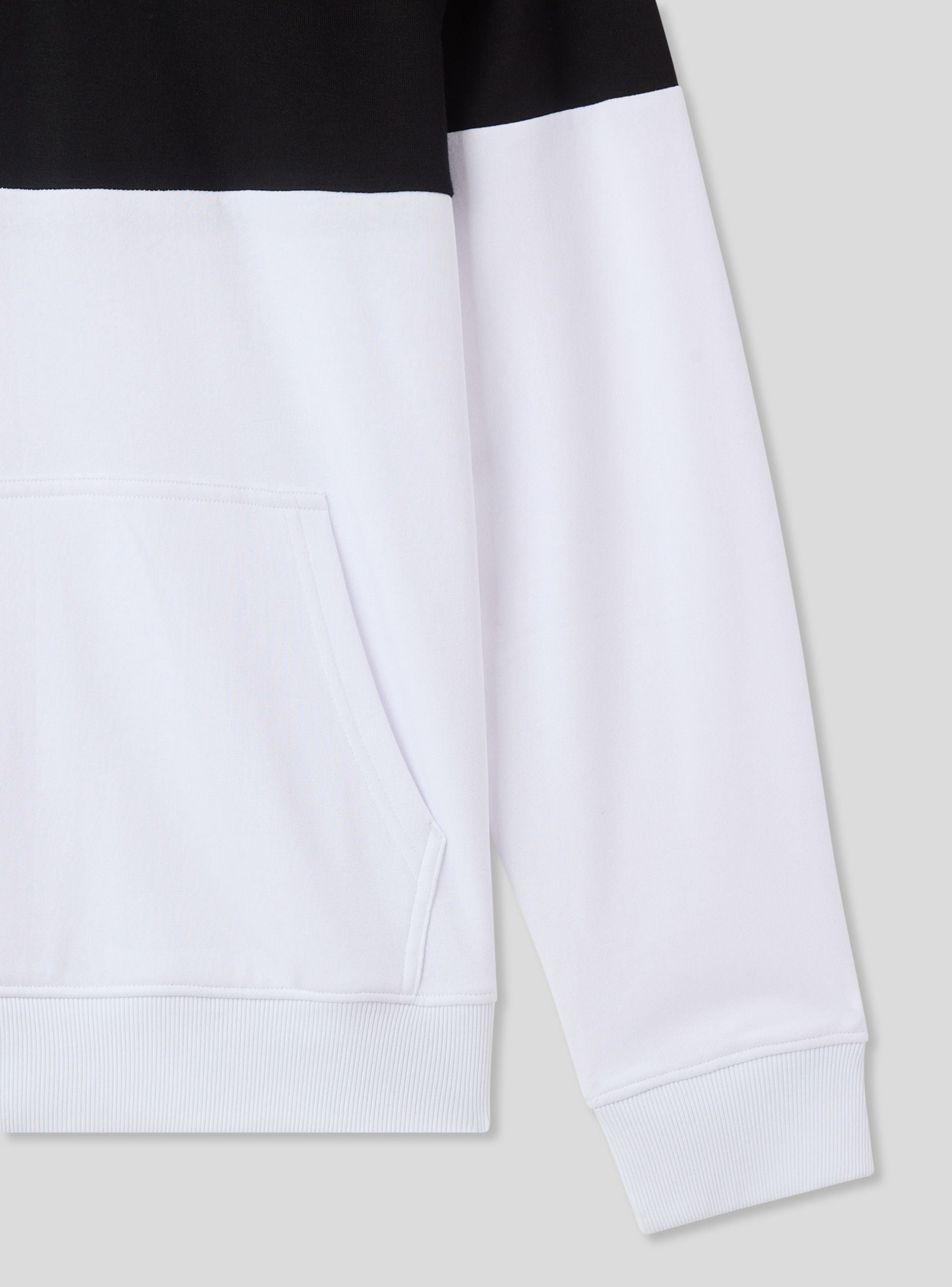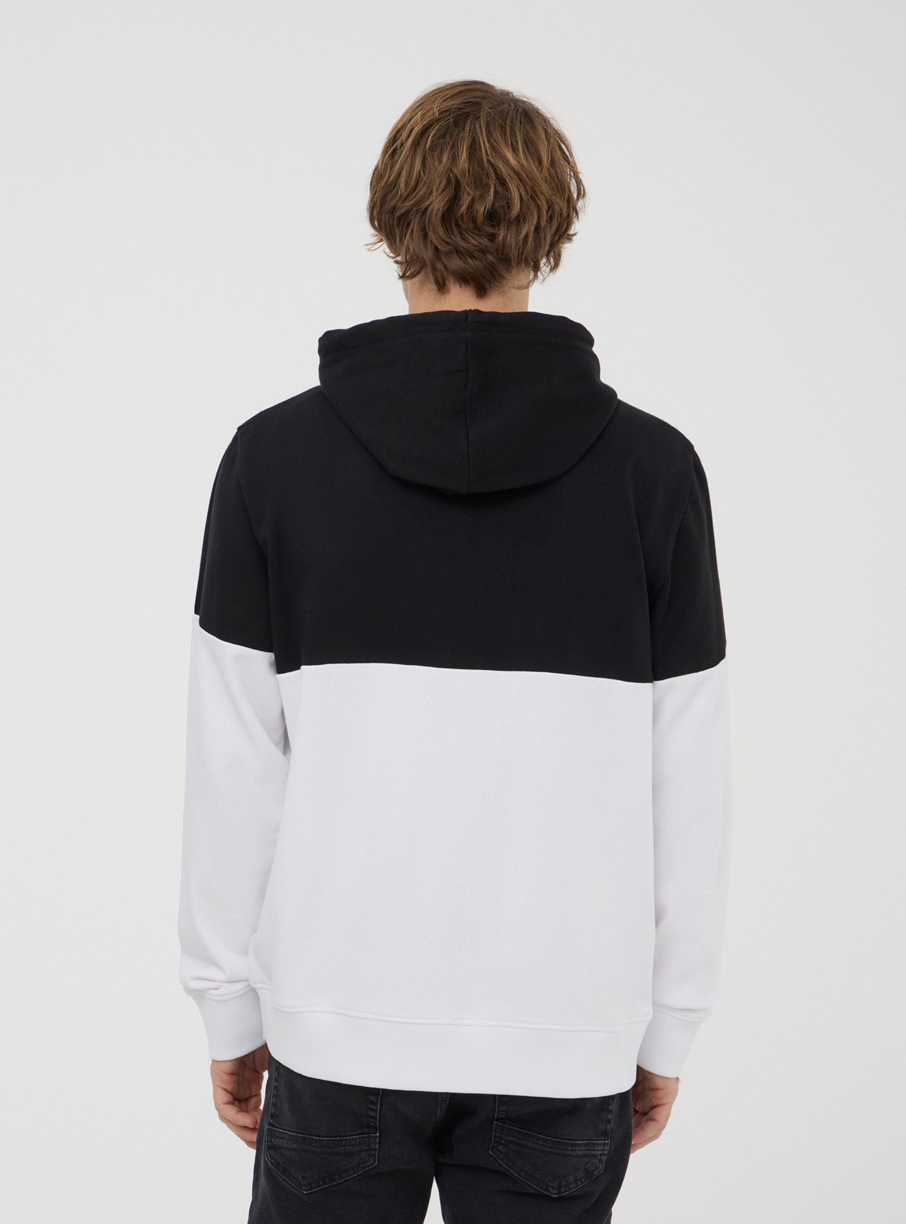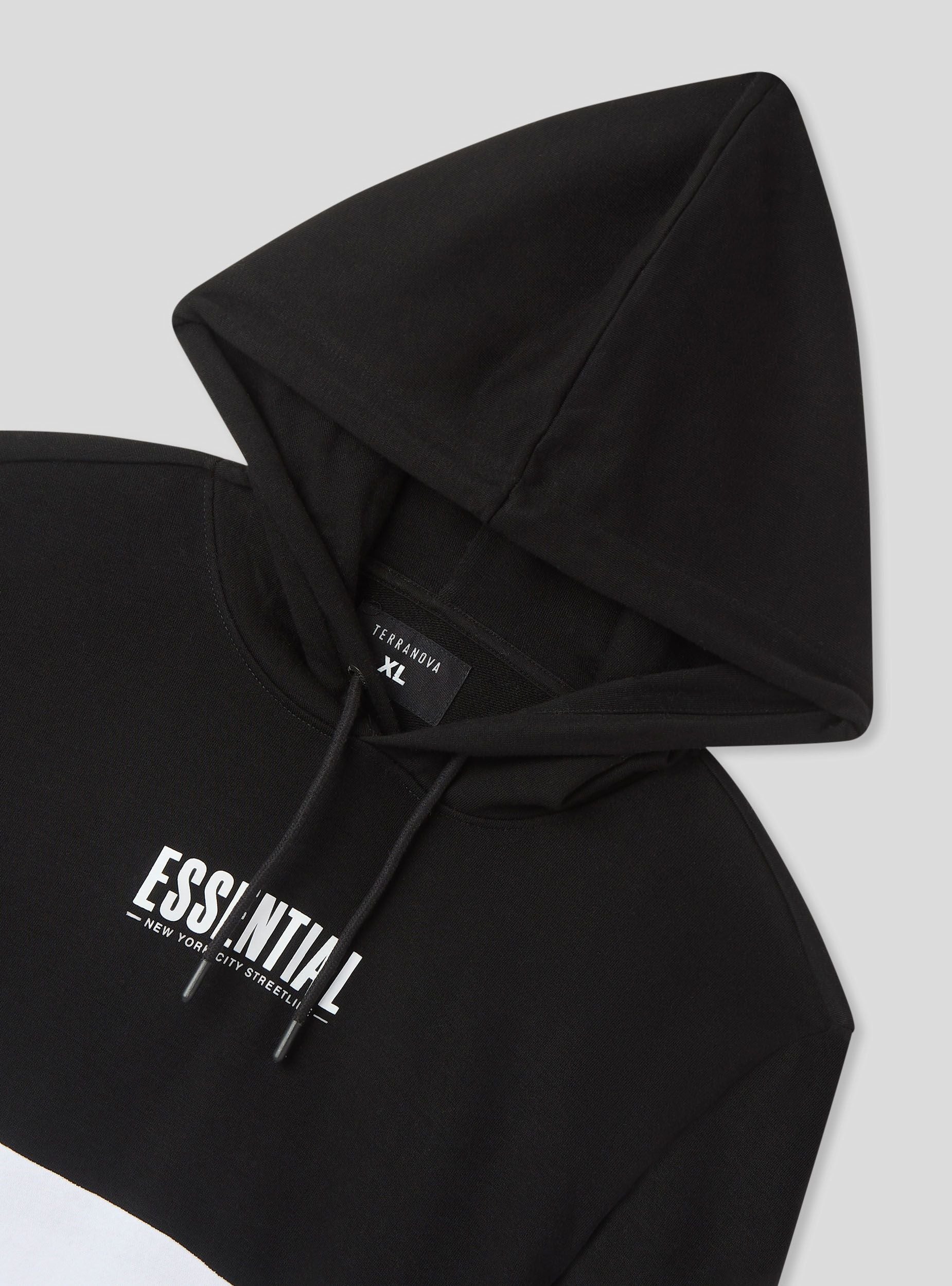 Lightweight men's long-sleeved sweatshirt, without a zip, featuring an adjustable hood with drawstring and a practical kangaroo pocket. The two-tone design and front lettering add a modern and edgy touch. Perfect for a casual and sporty look, it pairs easily with jeans, joggers, or cargo trousers, making it ideal for leisure time, outings with friends, or more relaxed days.