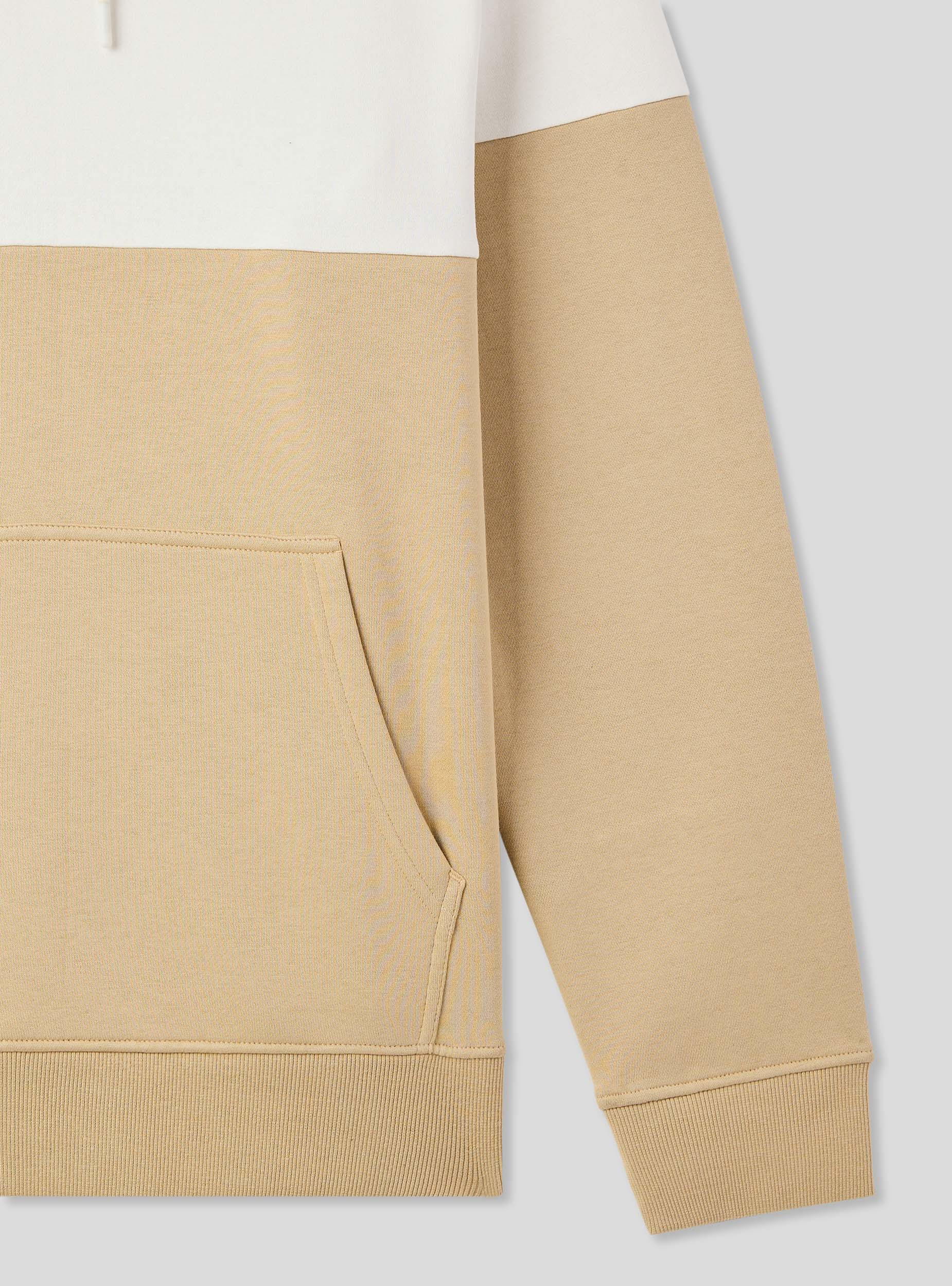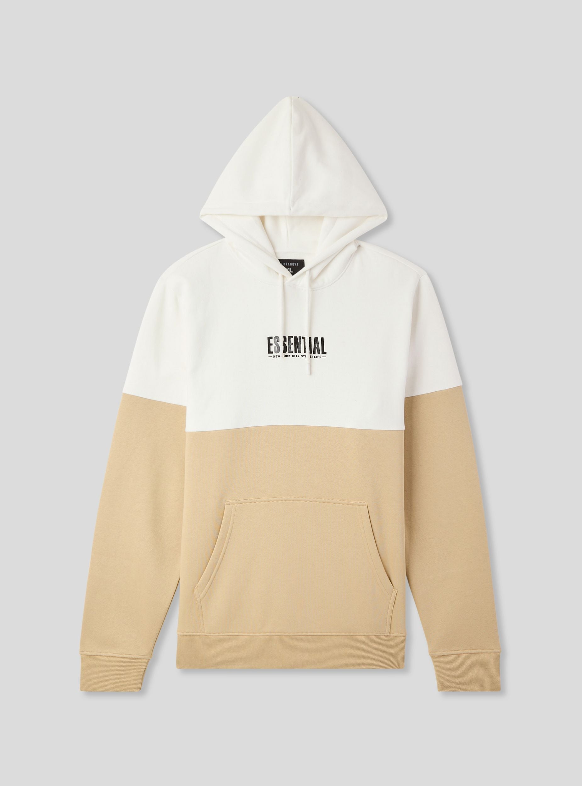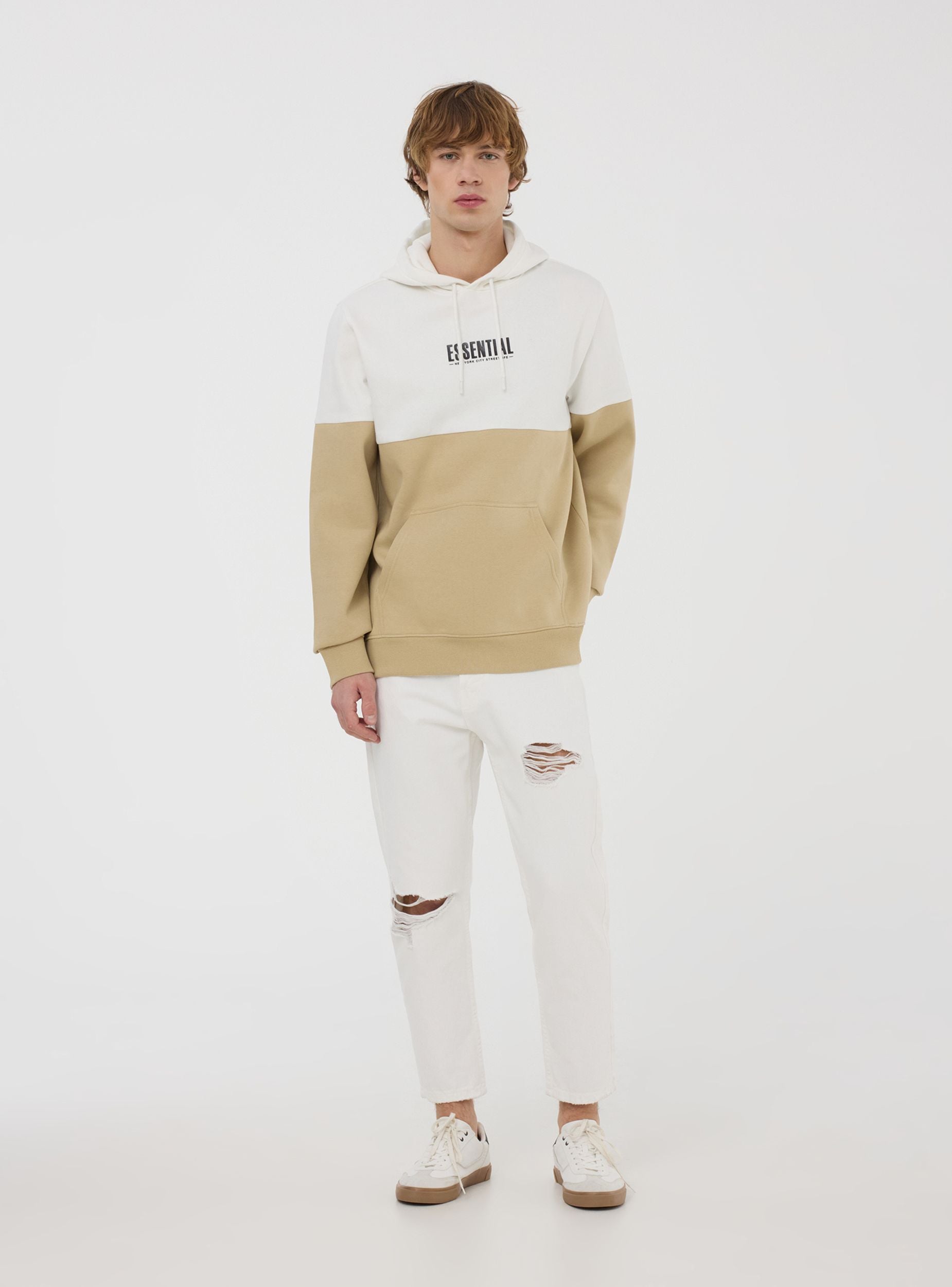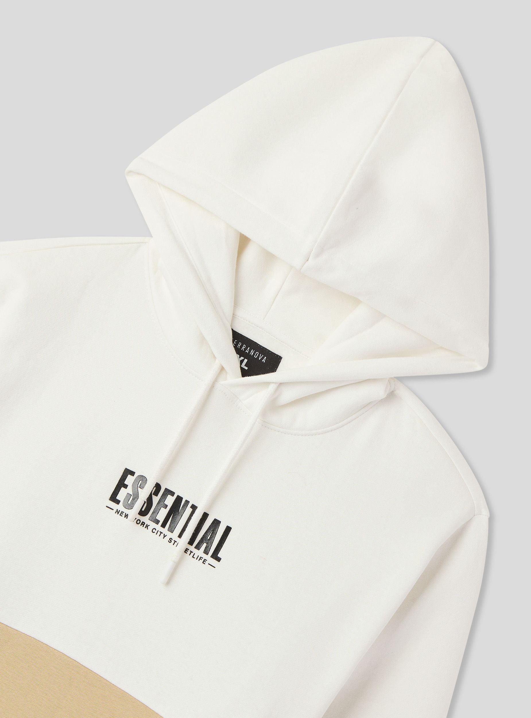 Lightweight men's long-sleeve sweatshirt, without a zip, featuring an adjustable hood with drawstring and a practical kangaroo pocket. The two-tone design and the front lettering add a modern and edgy touch. Perfect for a casual and sporty look, it pairs easily with jeans, joggers, or cargo trousers, ideal for leisure time, outings with friends, or more relaxed days.Details