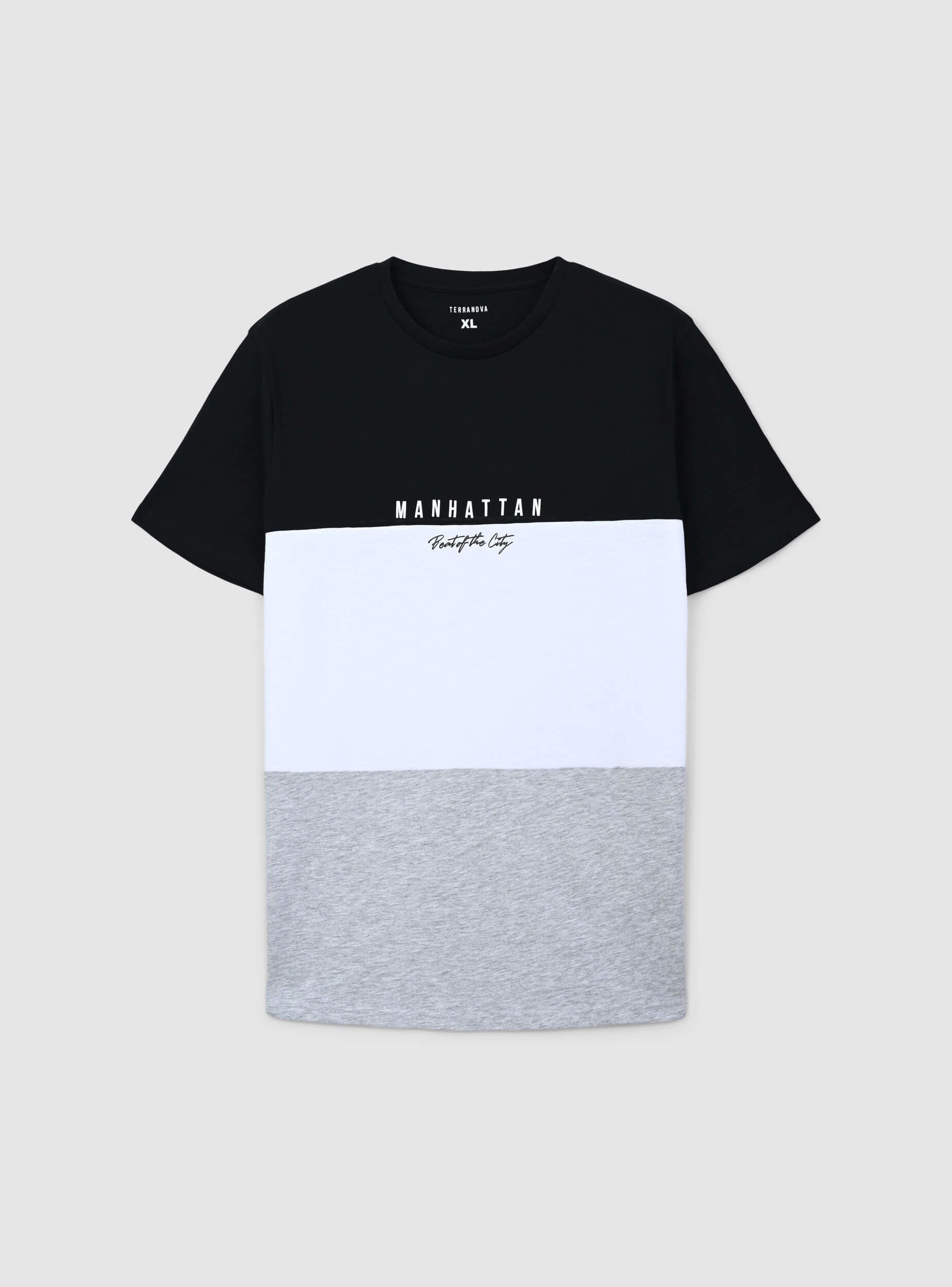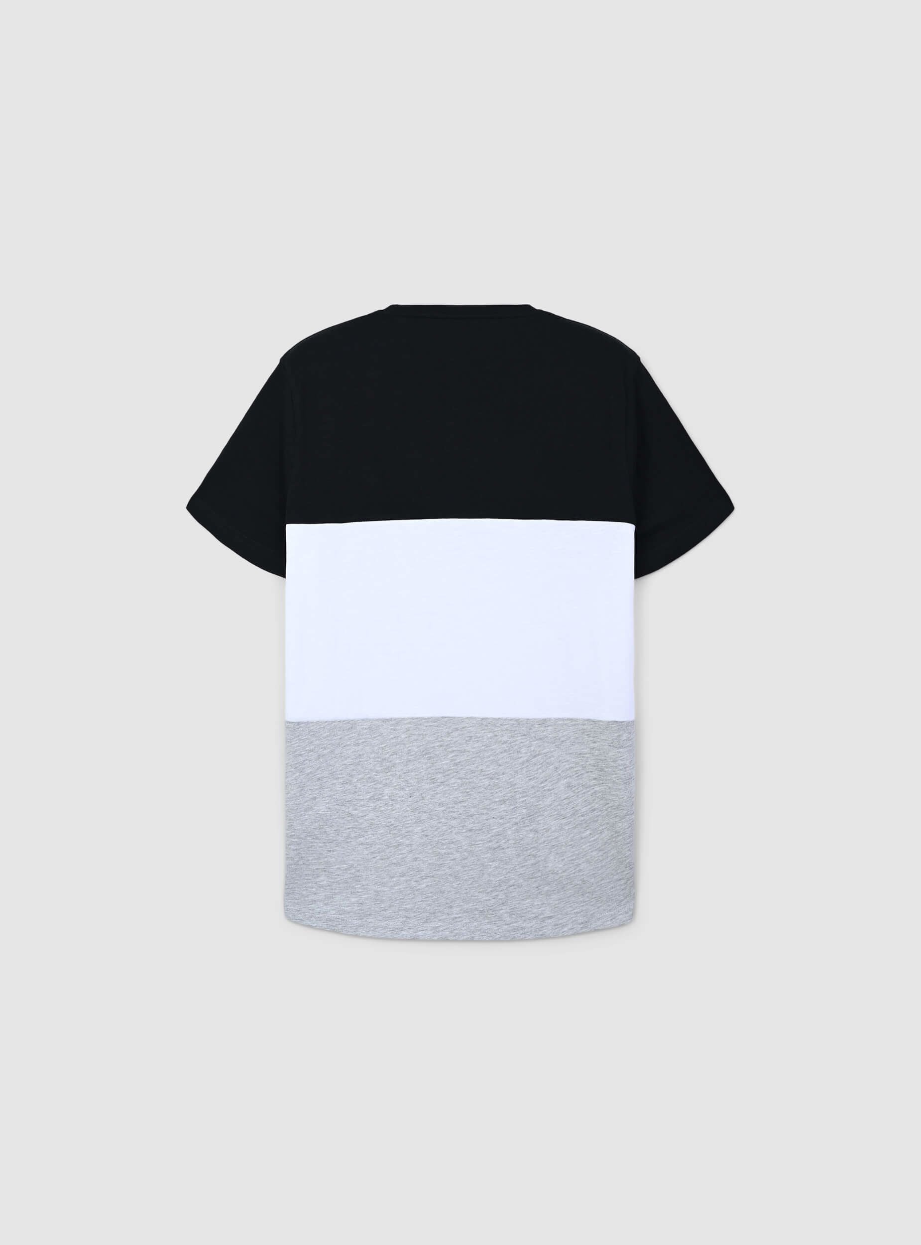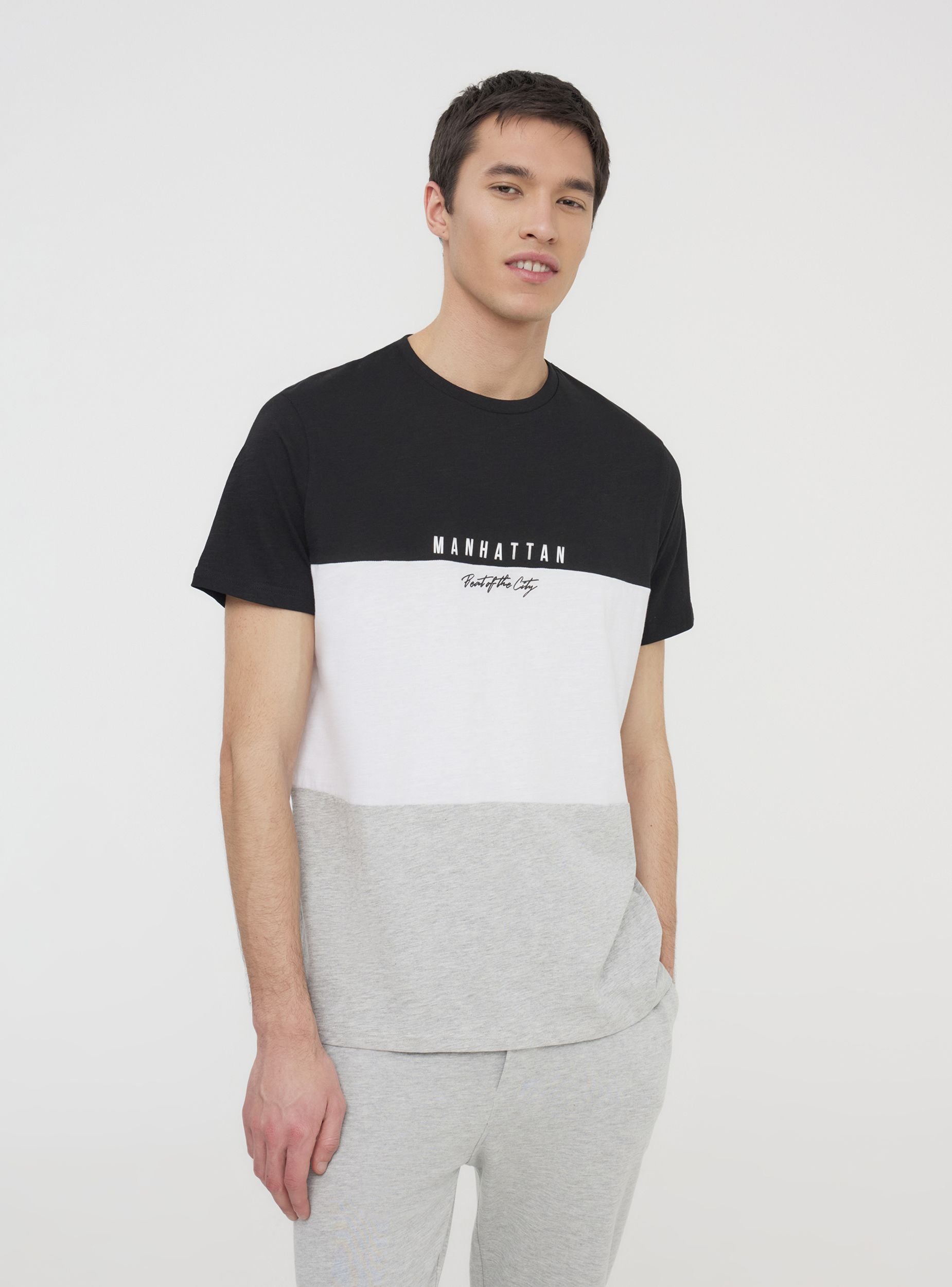 Men's short-sleeved t-shirt with a crew neck, featuring a block colour design that adds a modern and distinctive touch. The printed text on the chest enhances the urban style, making it ideal for casual and dynamic outfits. Perfect to pair with jeans or shorts for a relaxed yet refined look, it is suitable for leisure time, city strolls, and informal gatherings with friends.Details