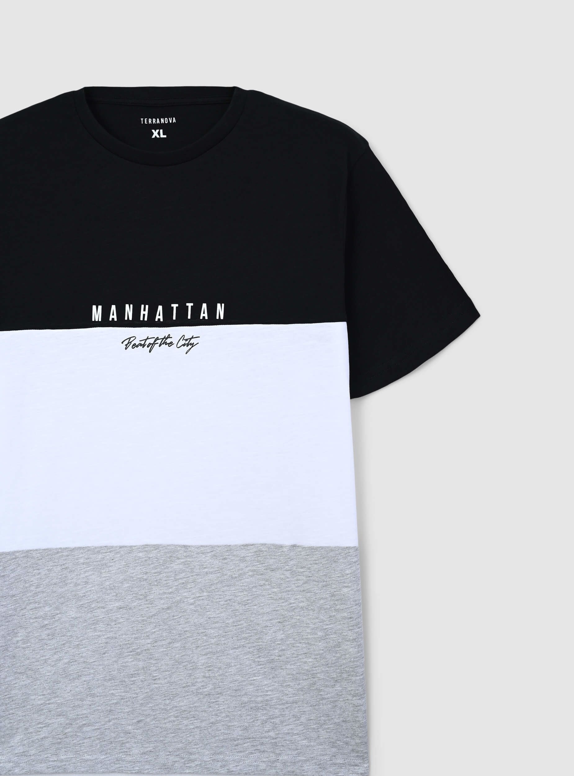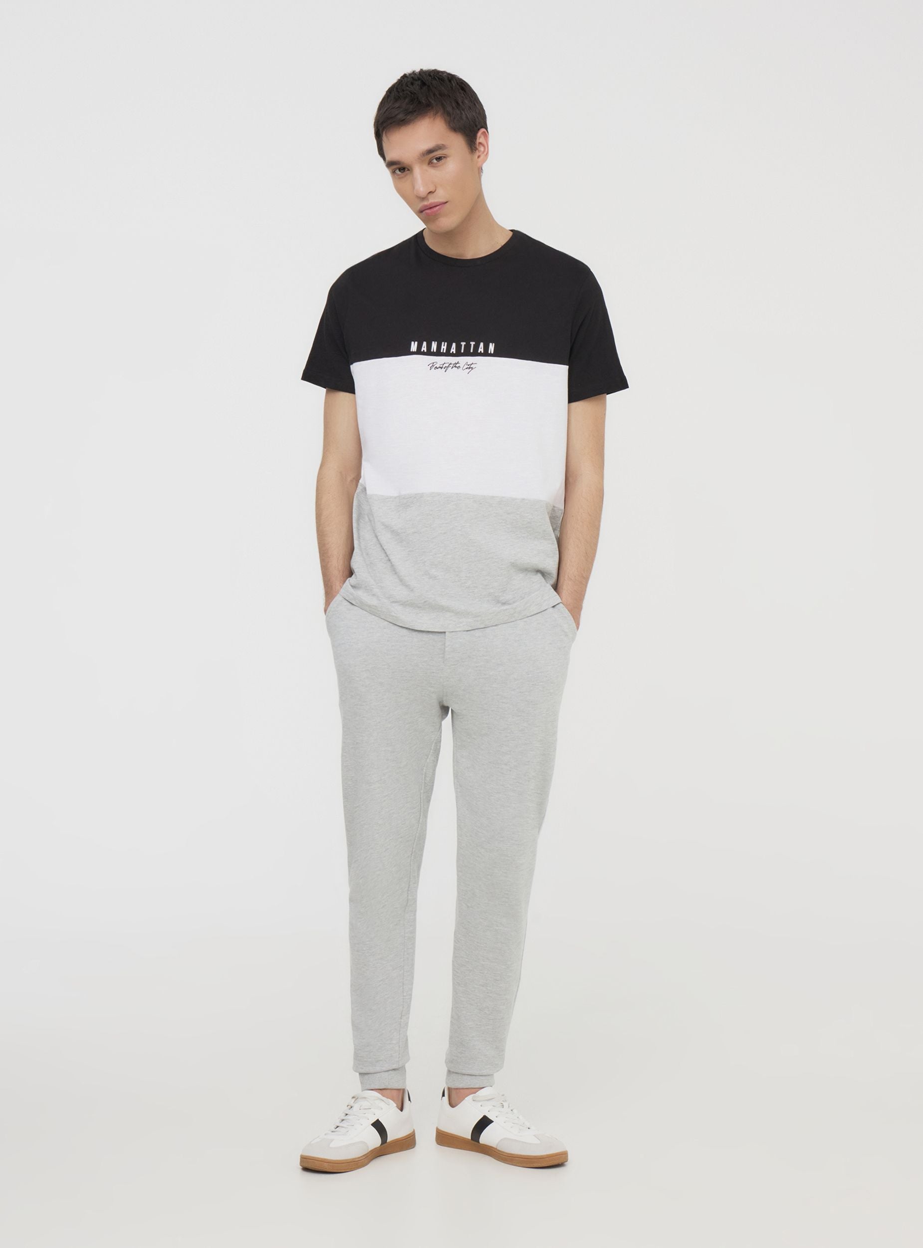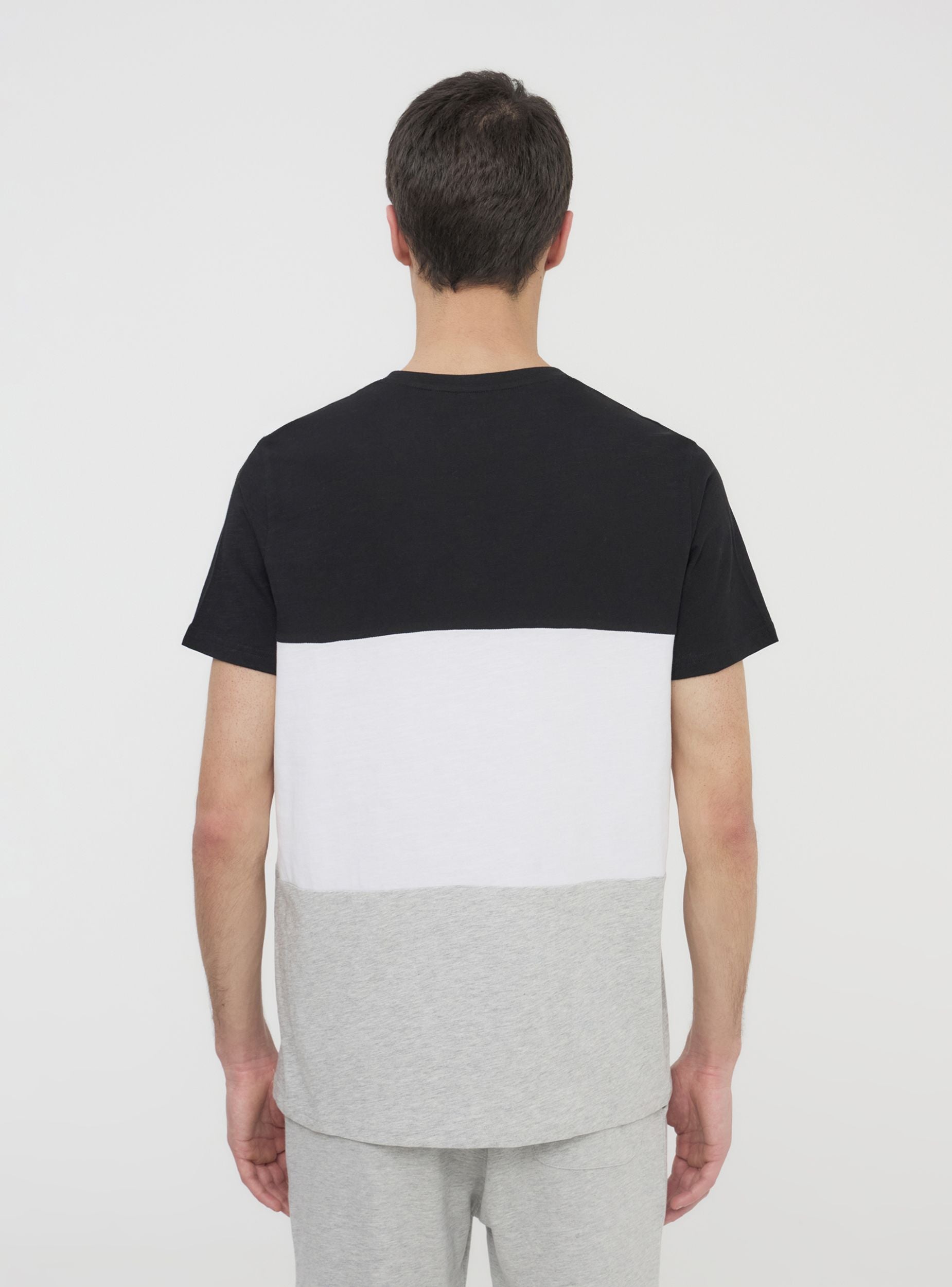 Men's short-sleeved t-shirt with a crew neck, featuring a block colour design that adds a modern and distinctive touch. The printed text on the chest enhances the urban style, making it ideal for casual and dynamic outfits. Perfect to pair with jeans or shorts for a relaxed yet refined look, it is suitable for leisure time, city strolls, and informal gatherings with friends.Details