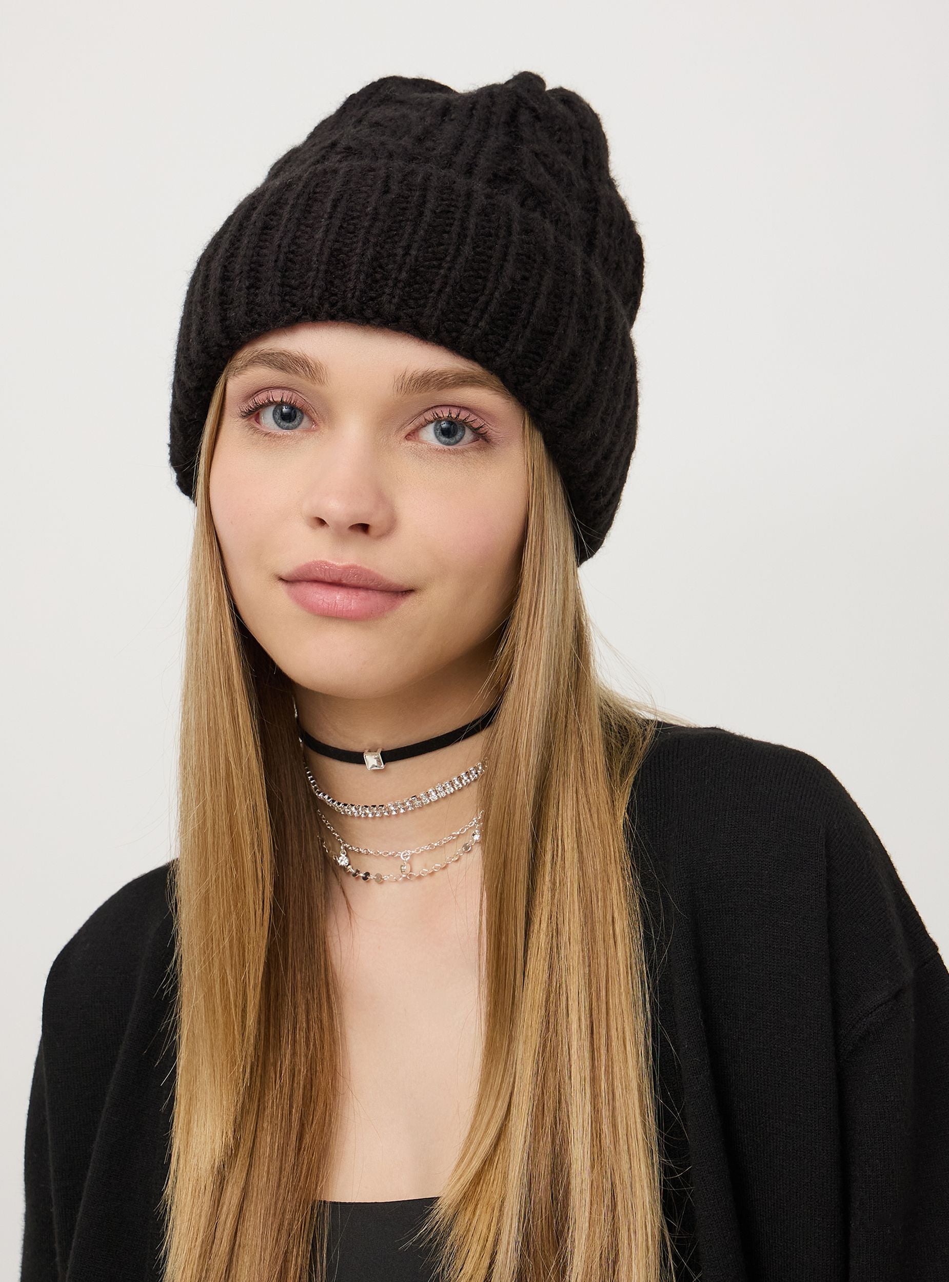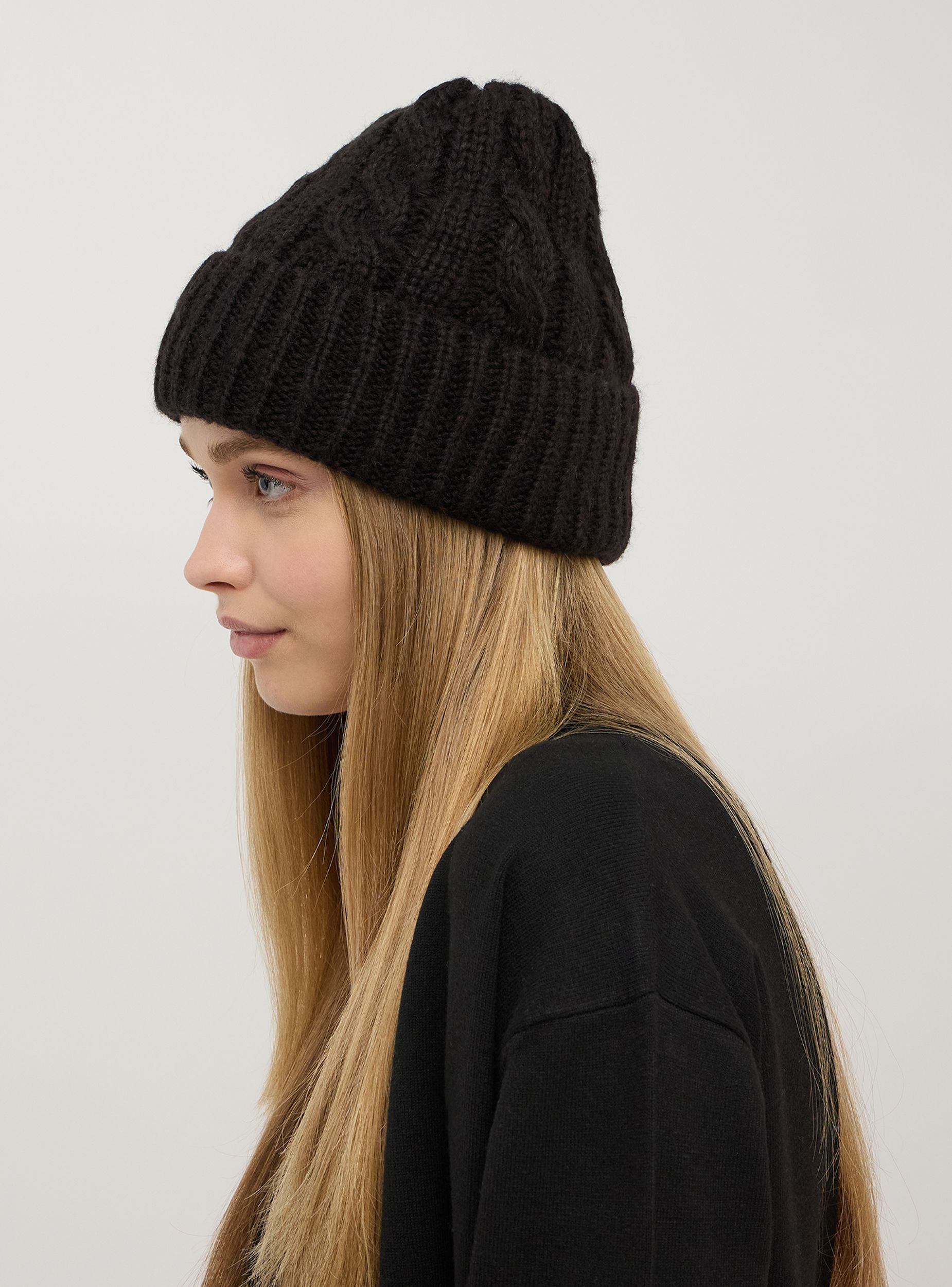 Ribbed knitted hat with braids, internally padded, ideal for winter. It features a classic cable knit pattern that adds a touch of style to the simple and warm design. The turn-up brim offers additional protection against the cold. Perfect for casual occasions and to keep you warm.