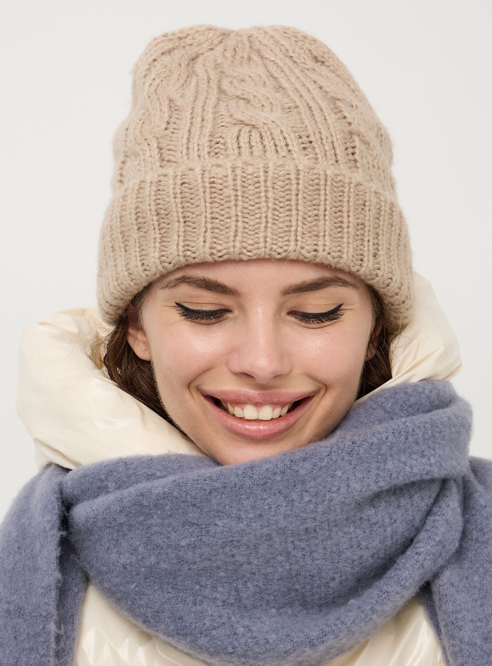 Ribbed knitted hat with braids, internally padded, ideal for winter. It features a classic cable pattern that adds a touch of style to the simple and warm design. The foldable brim offers additional protection against the cold. Perfect for casual occasions and to keep you warm.
