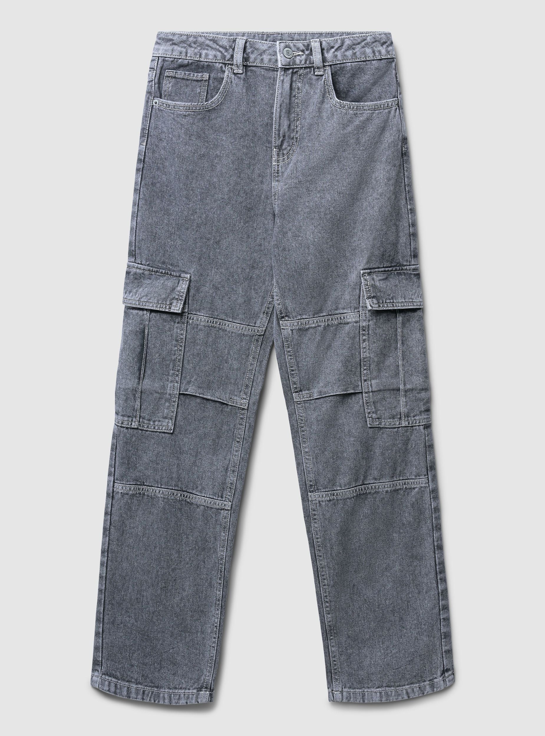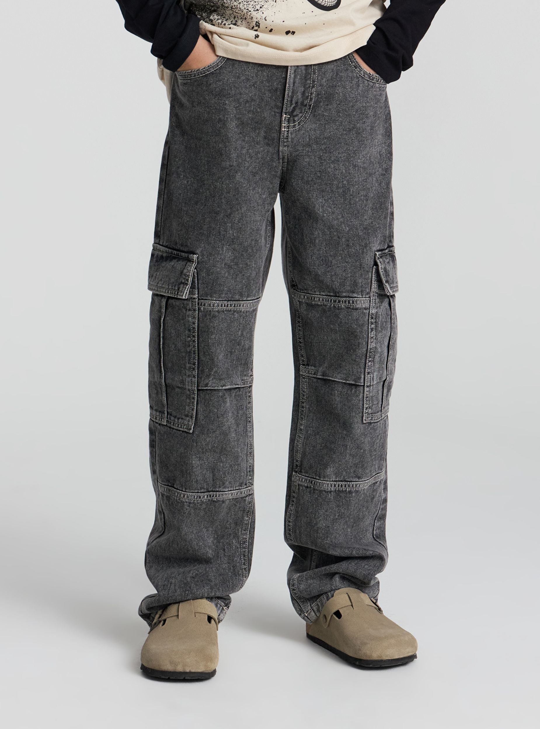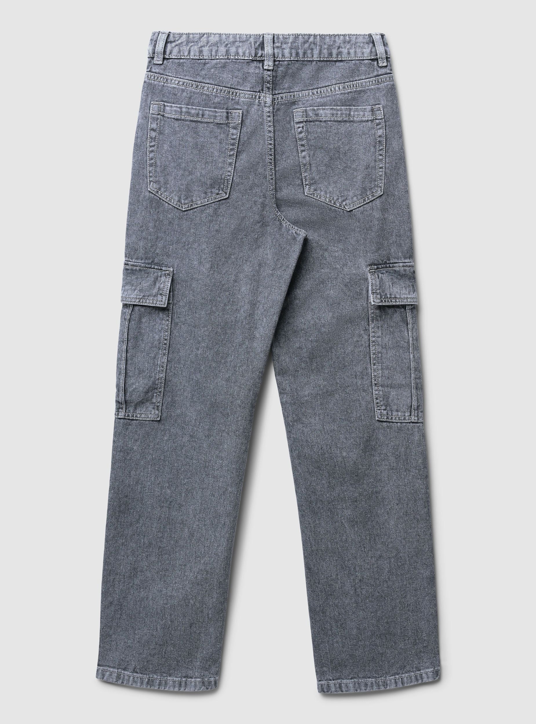 Children's cargo design jeans, featuring patch pockets on both sides for a practical and modern look. Ideal for everyday use, these jeans offer a comfortable fit and are perfect for casual pairings with t-shirts or sweatshirts. The button and zip closure ensures easy dressing, while the cotton fabric provides comfort and durability.Details