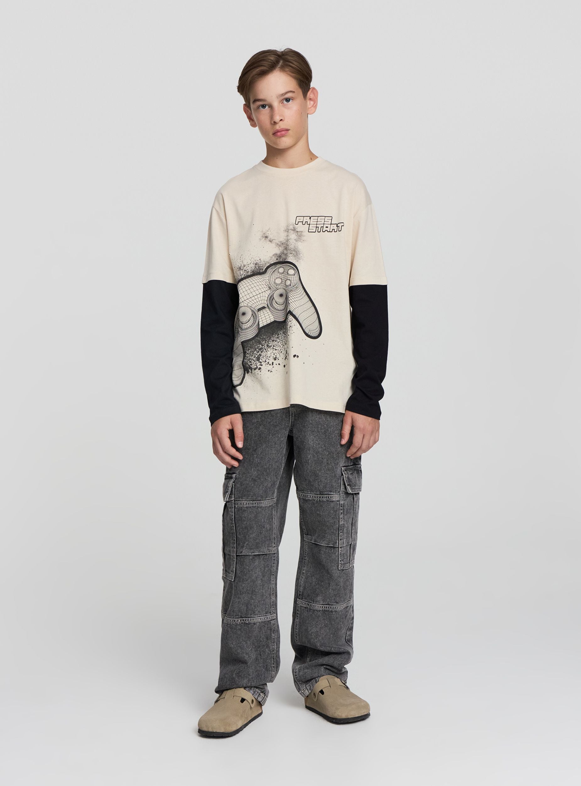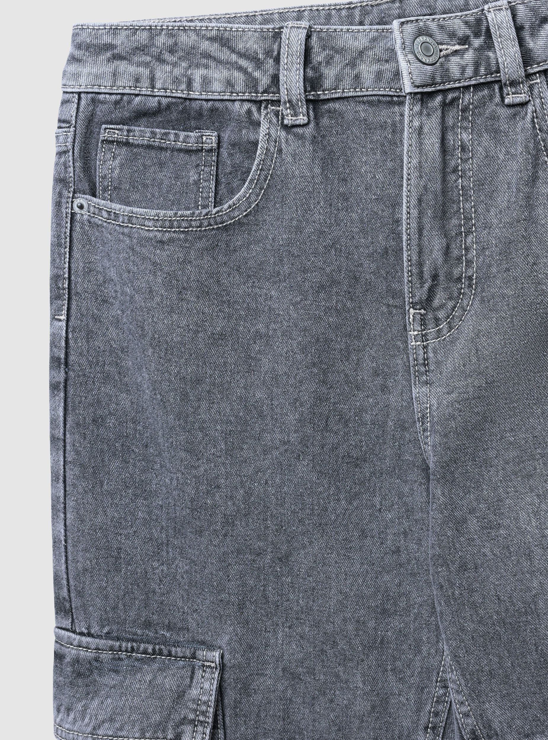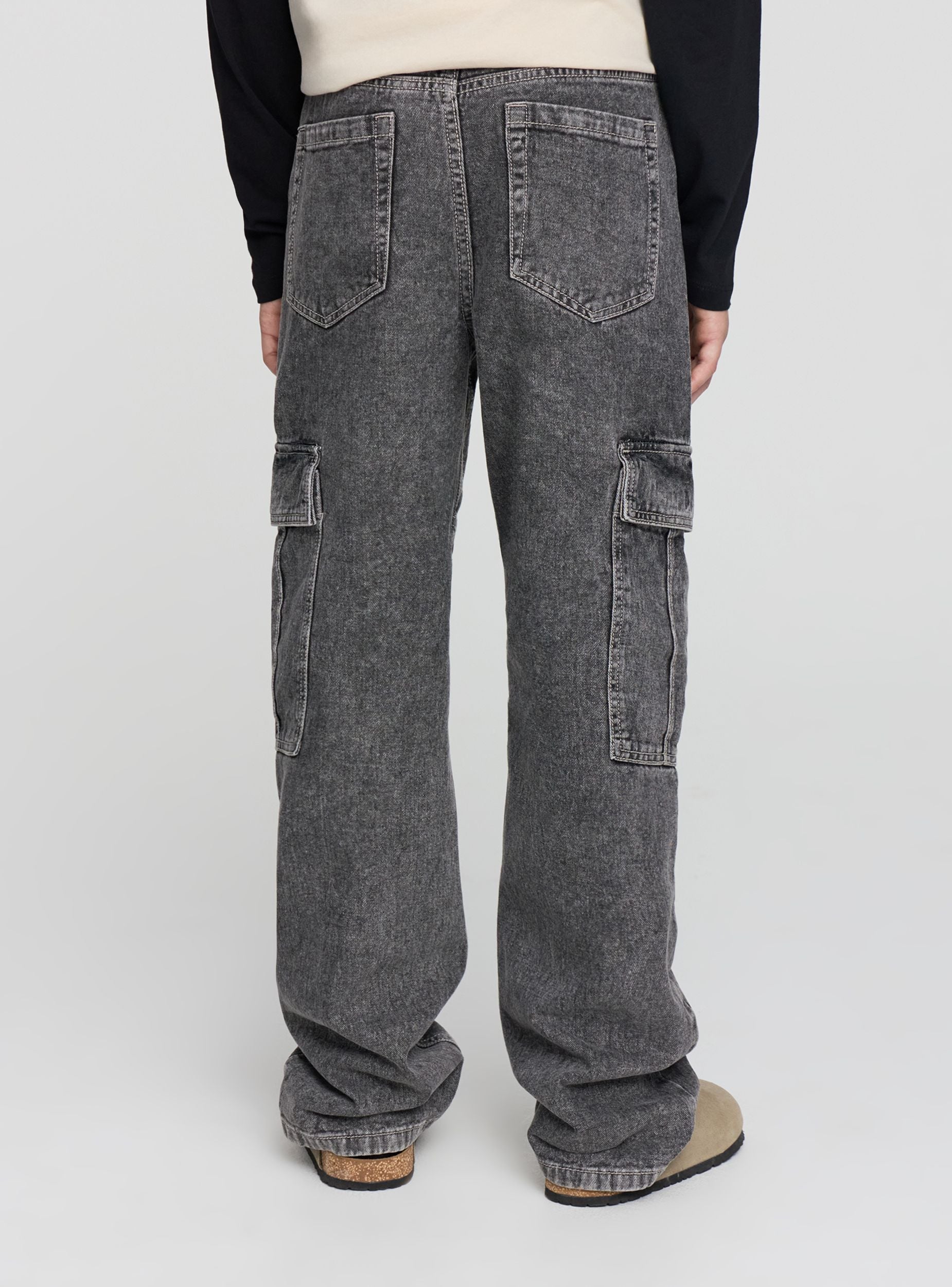 Children's cargo design jeans, featuring patch pockets on both sides for a practical and modern look. Ideal for everyday use, these jeans offer a comfortable fit and are perfect for casual pairings with t-shirts or sweatshirts. The button and zip closure ensures easy dressing, while the cotton fabric provides comfort and durability.Details