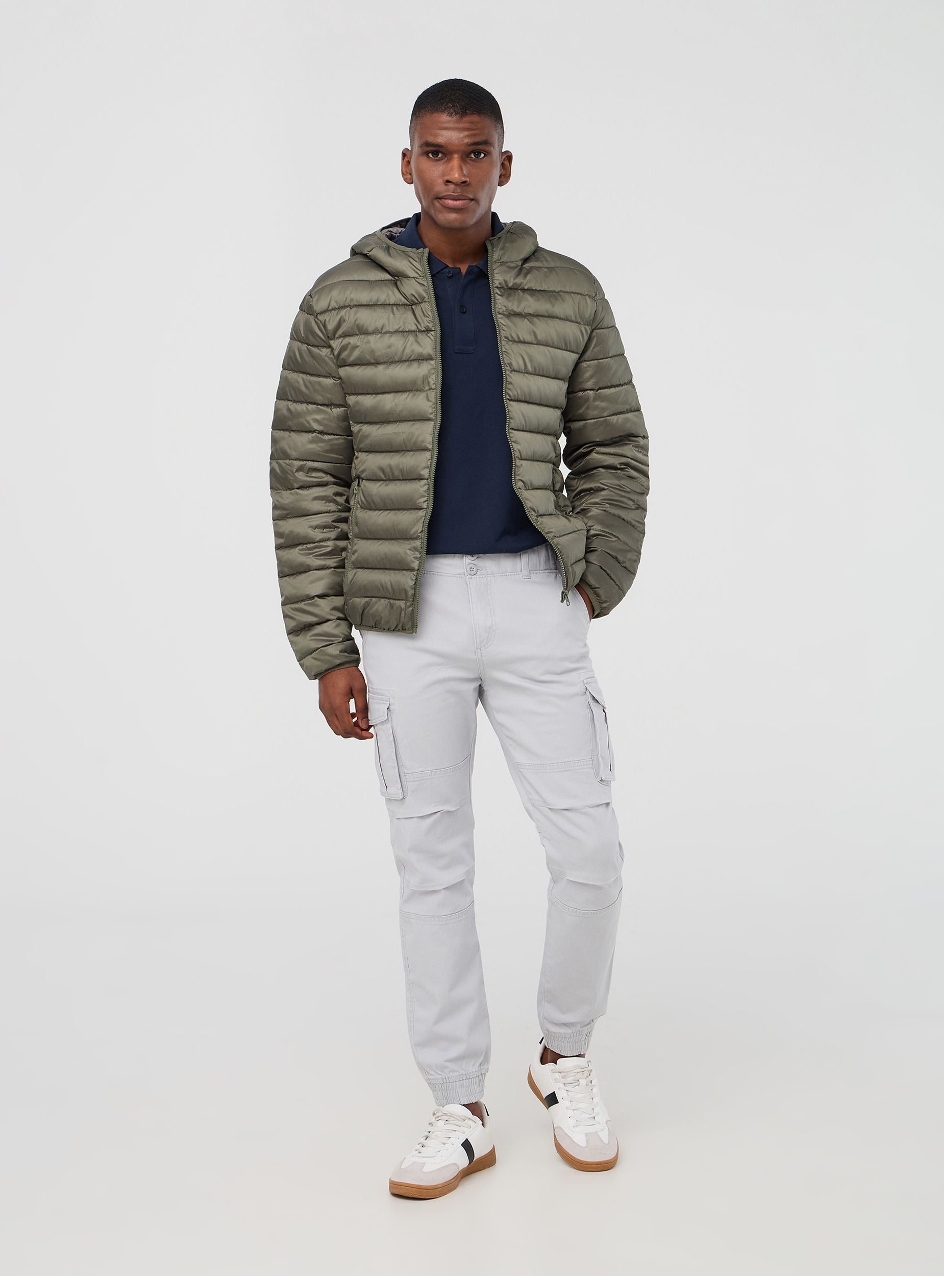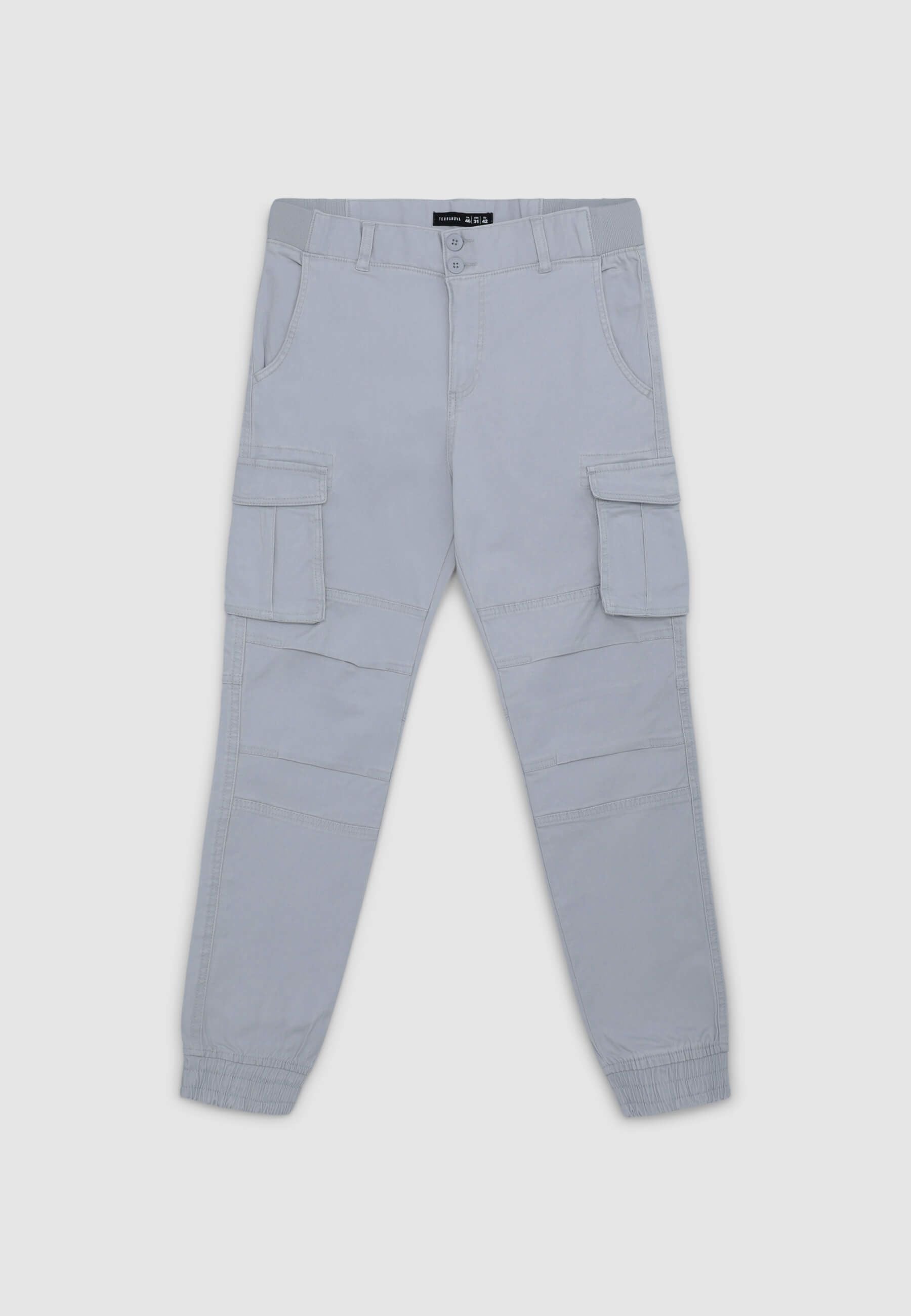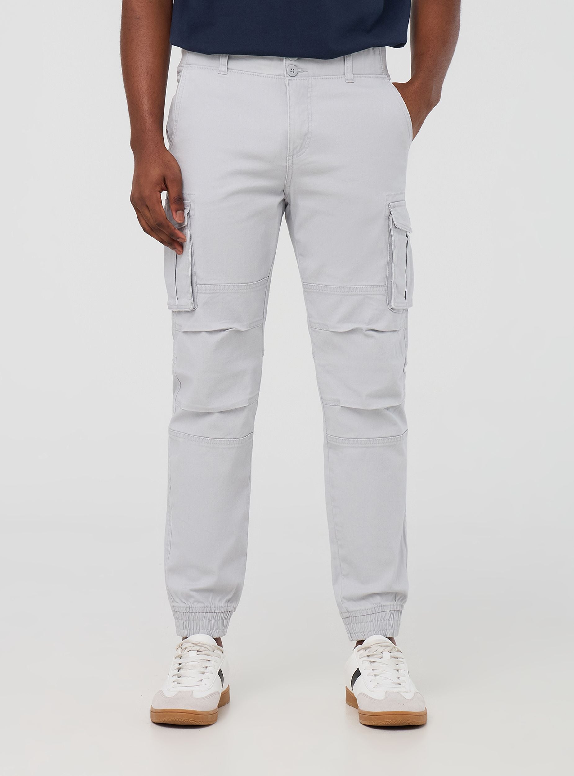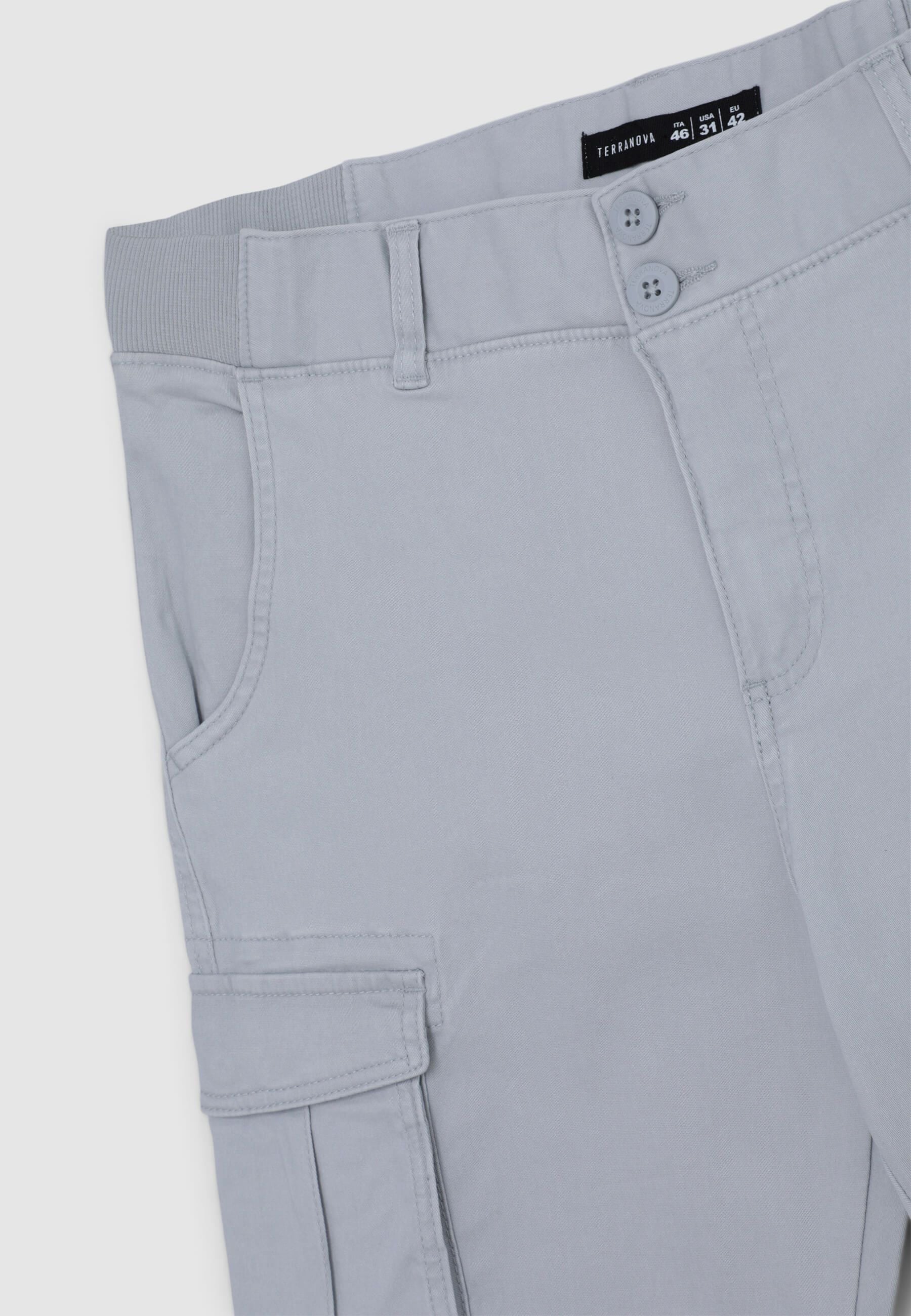 Men's cargo trousers, perfect for a practical and casual look. Featuring a solid colour design, they have cuffs at the bottom, a button and zip closure, and large side and back pockets for added functionality. Ideal for leisure time, they pair well with t-shirts or sweatshirts for comfortable and versatile outfits.