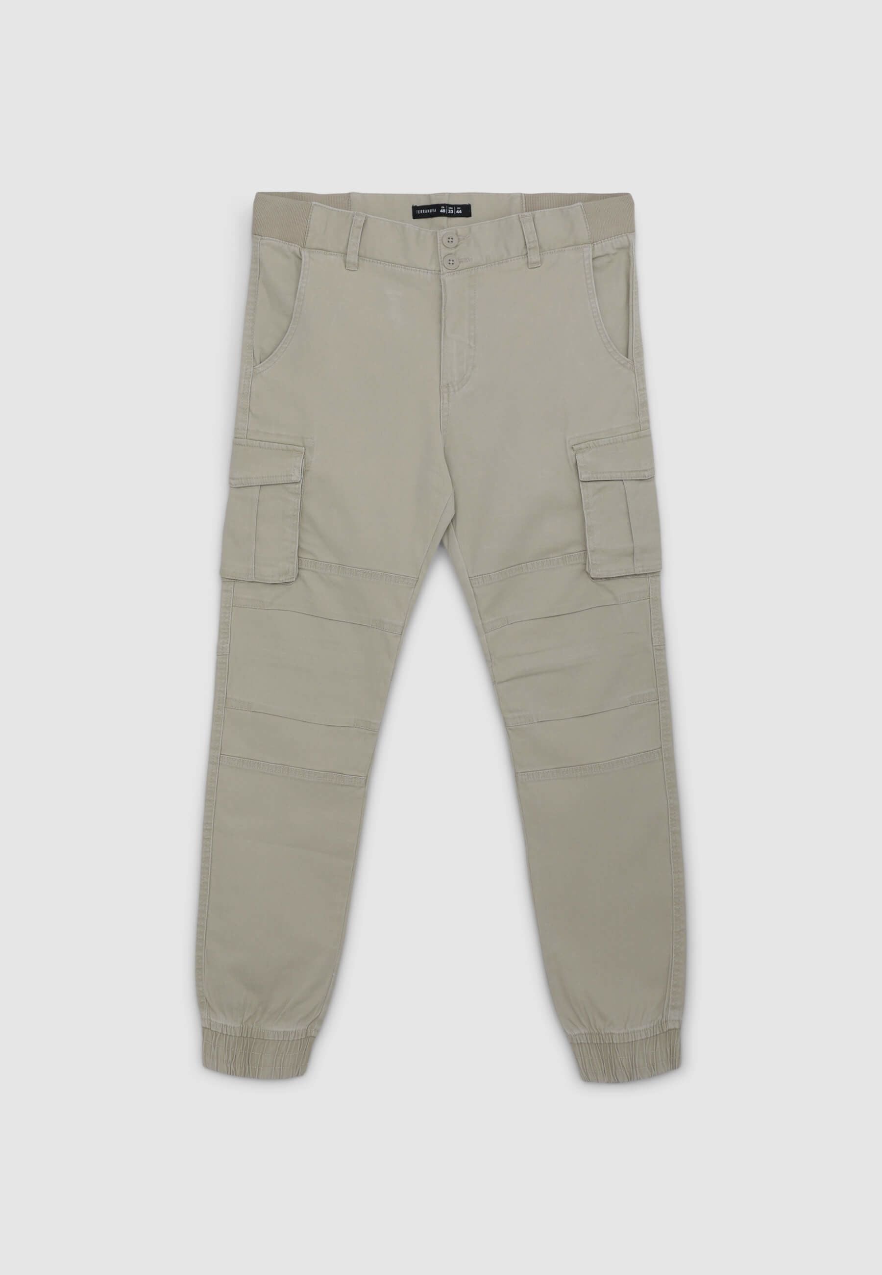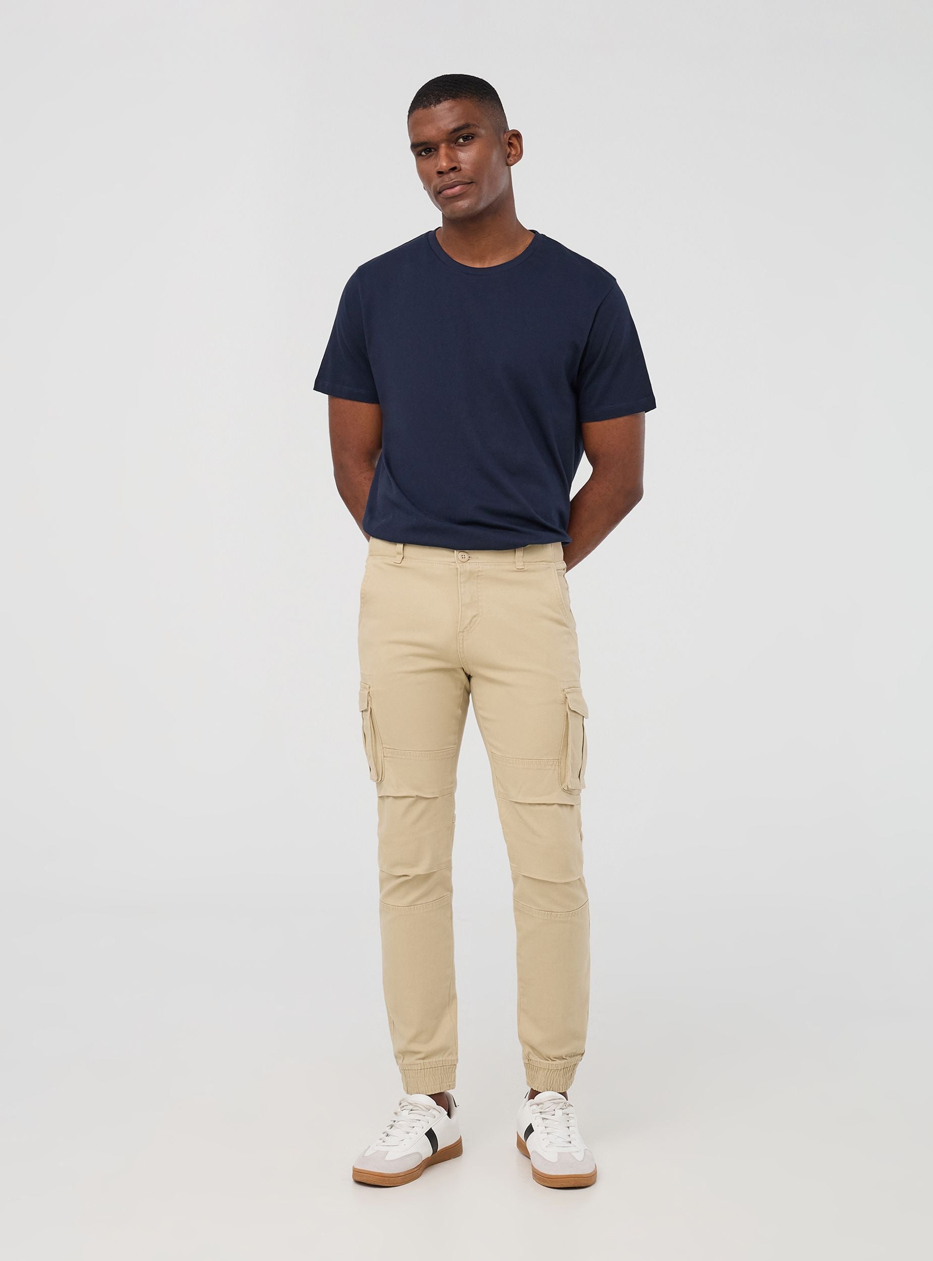 Men's cargo trousers, perfect for a practical and casual look. Featuring a solid colour design, they have cuffs at the bottom, a button and zip closure, and large side and back pockets for added functionality. Ideal for leisure time, they pair well with t-shirts or sweatshirts for comfortable and versatile outfits.