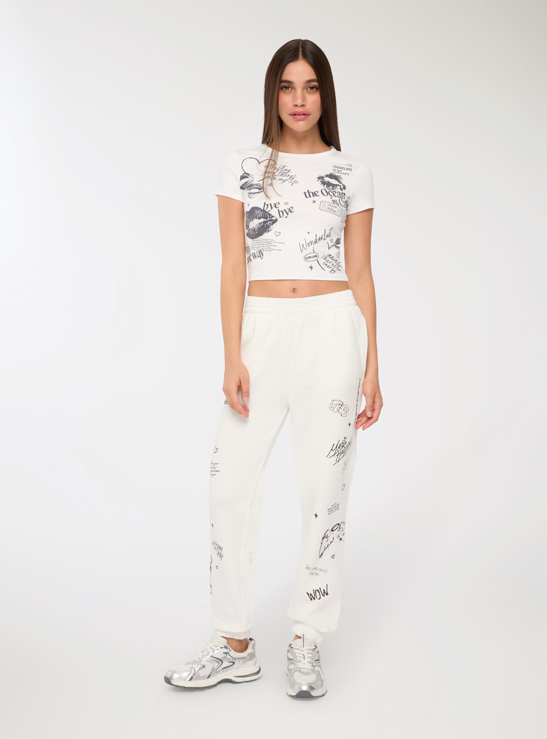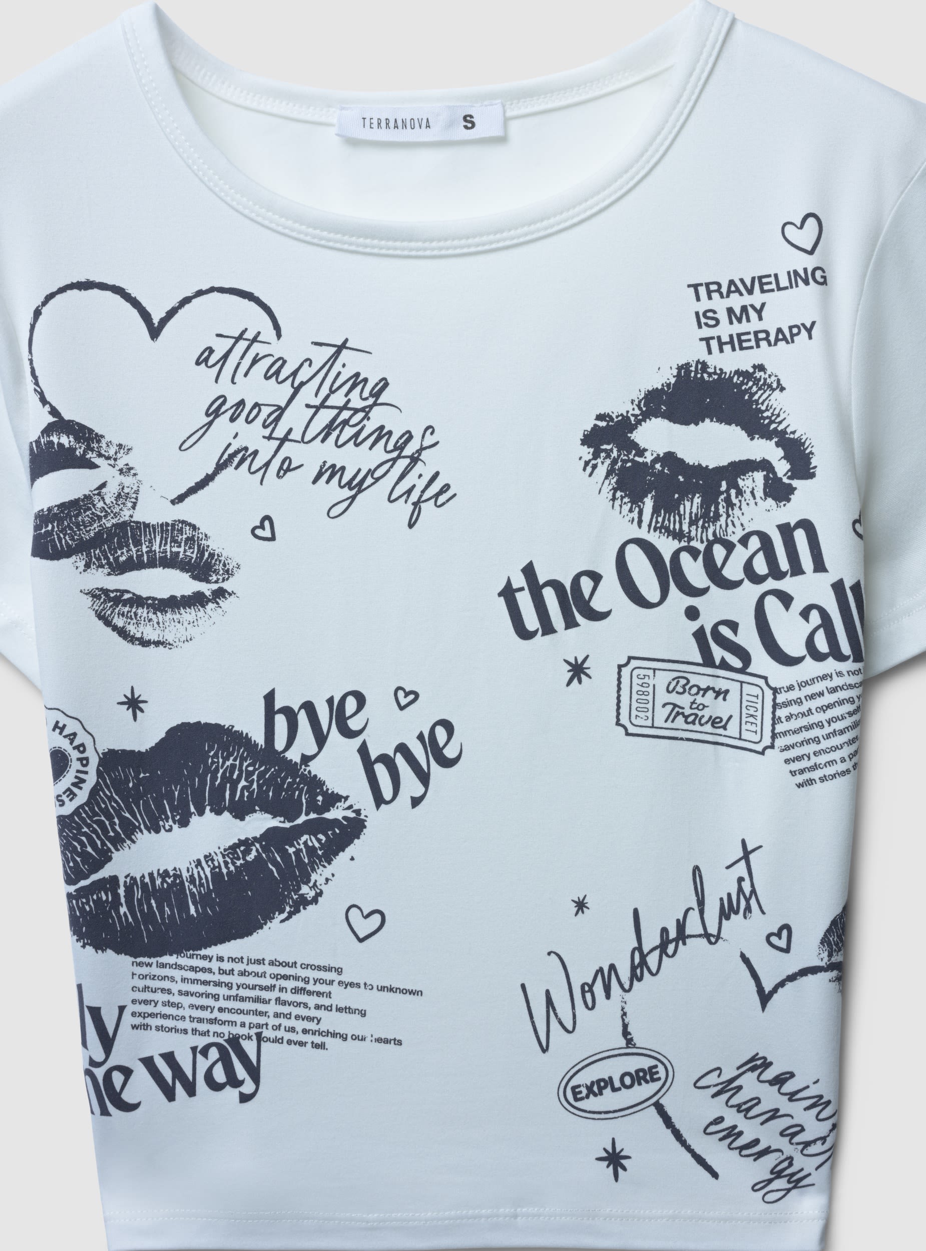 Women's crew neck t-shirt with a modern and striking design. It features a cropped fit and short sleeves, ideal for a casual and fashionable look. The lettering print adds a touch of personality, perfect for pairing with jeans or shorts for a fresh and dynamic outfit.