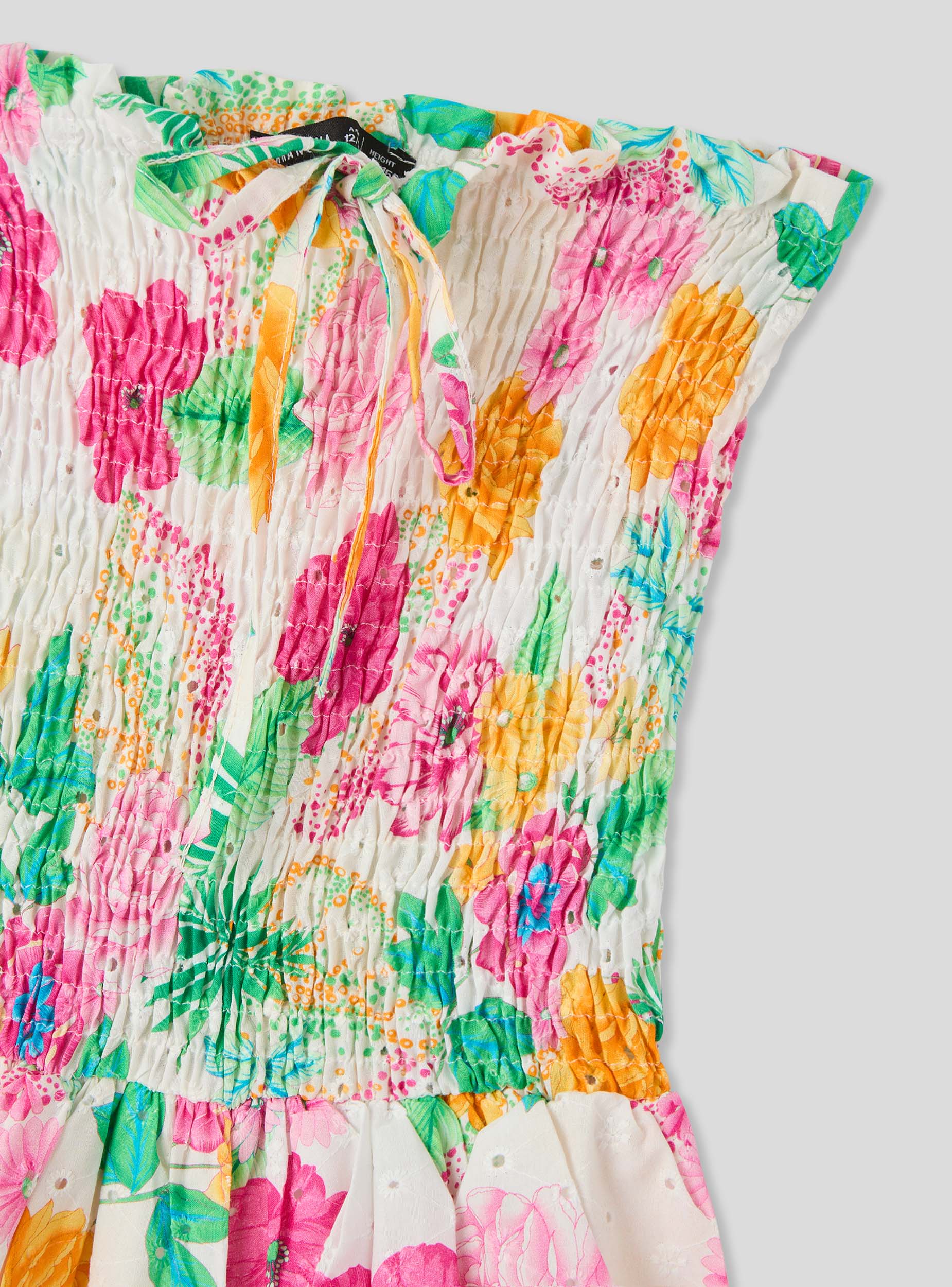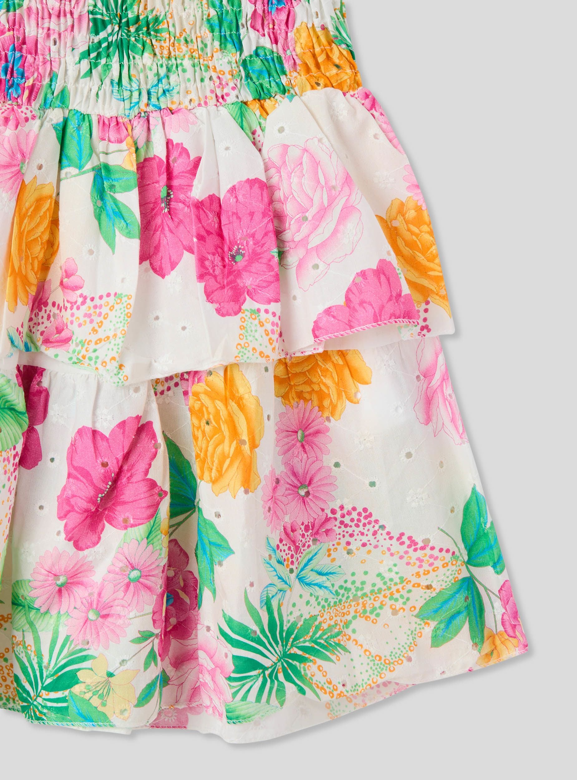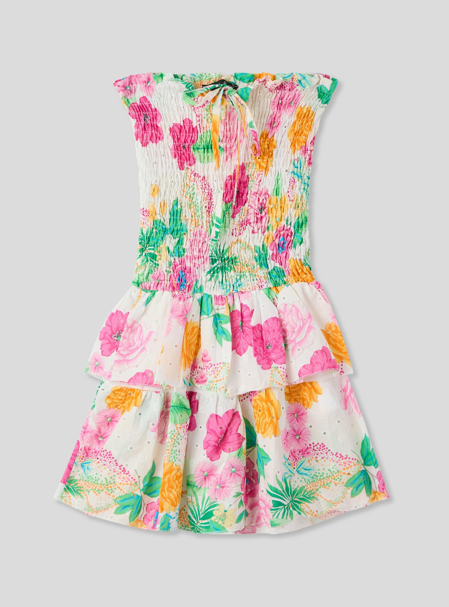 Girls' dress with floral print, ideal for special occasions. It features a strapless bandeau design with bare shoulders and a comfortable fit. The skirt is characterised by ruffles that add movement and elegance to the garment. Equipped with a drawstring to adjust the fit. Perfect to pair with sandals or smart shoes, this dress is a versatile choice for events and parties.