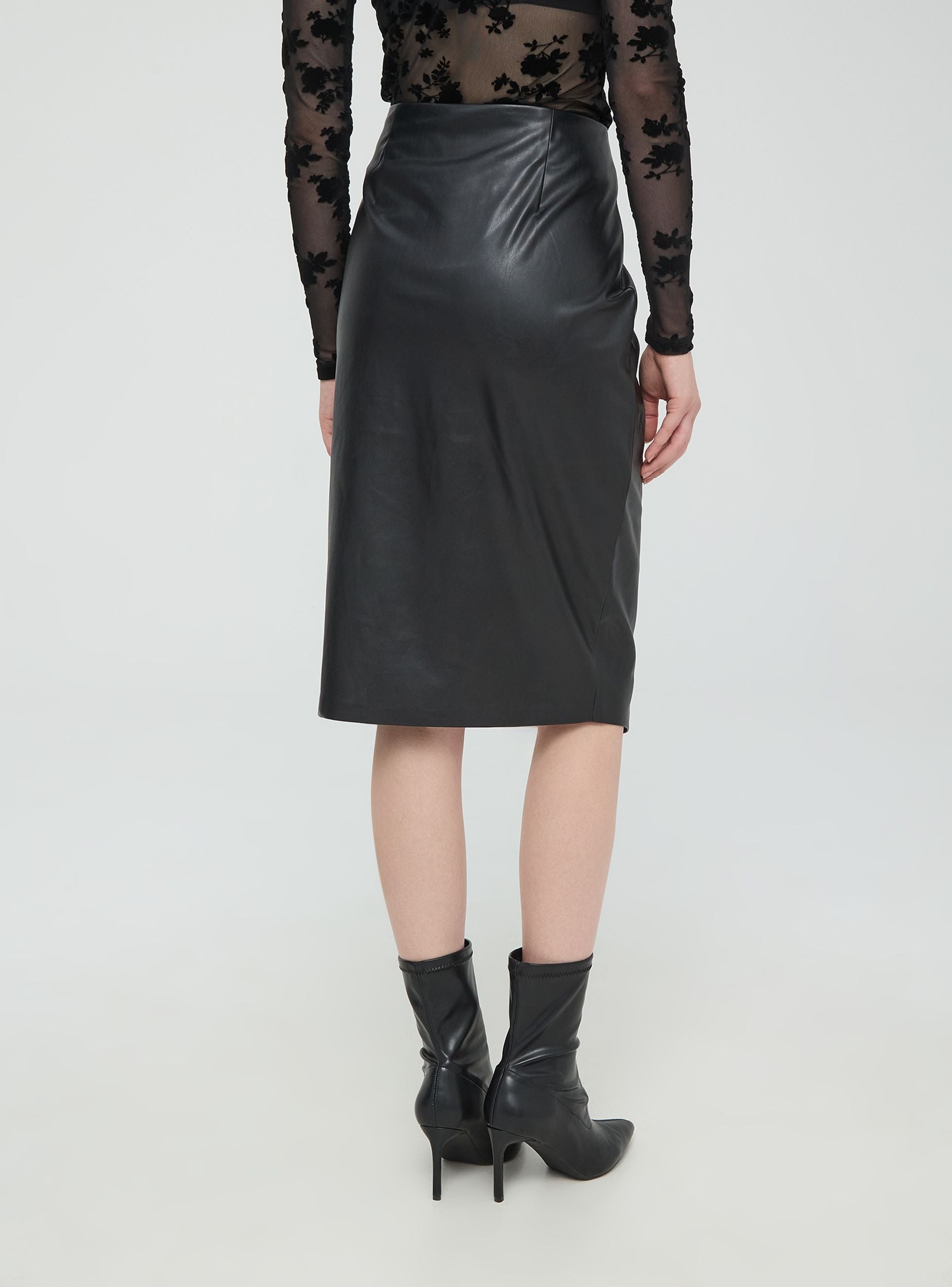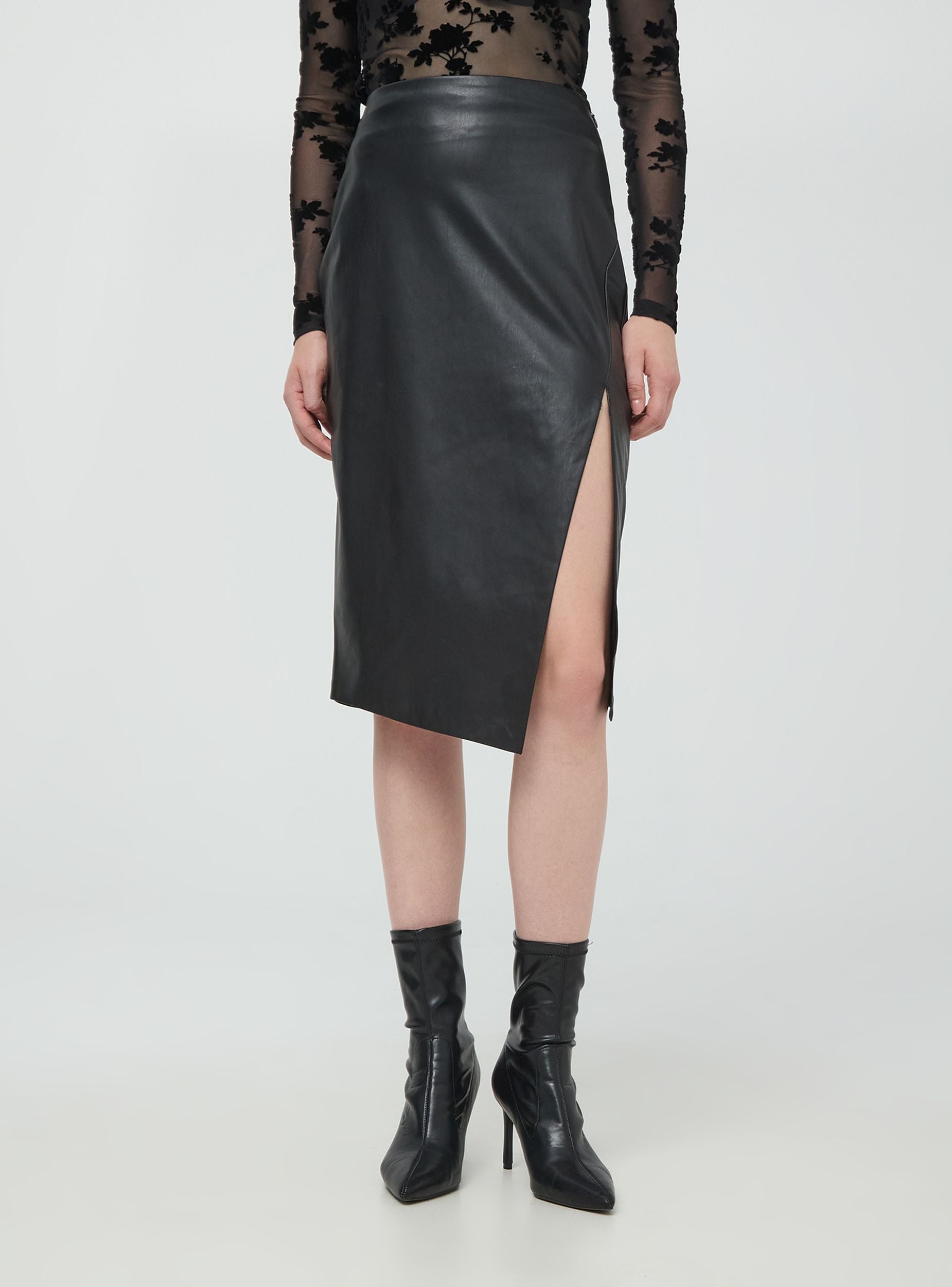 Faux leather midi skirt with an asymmetrical slit