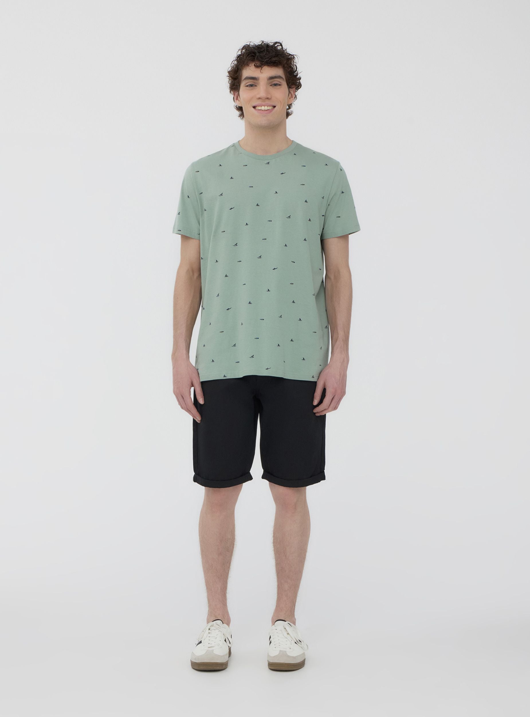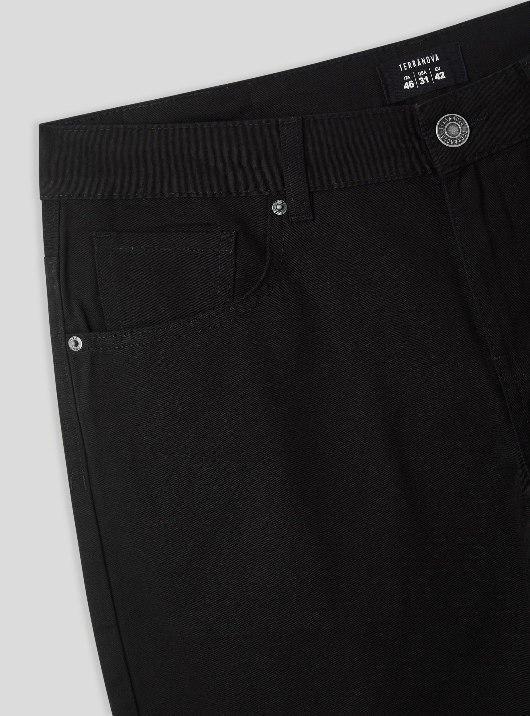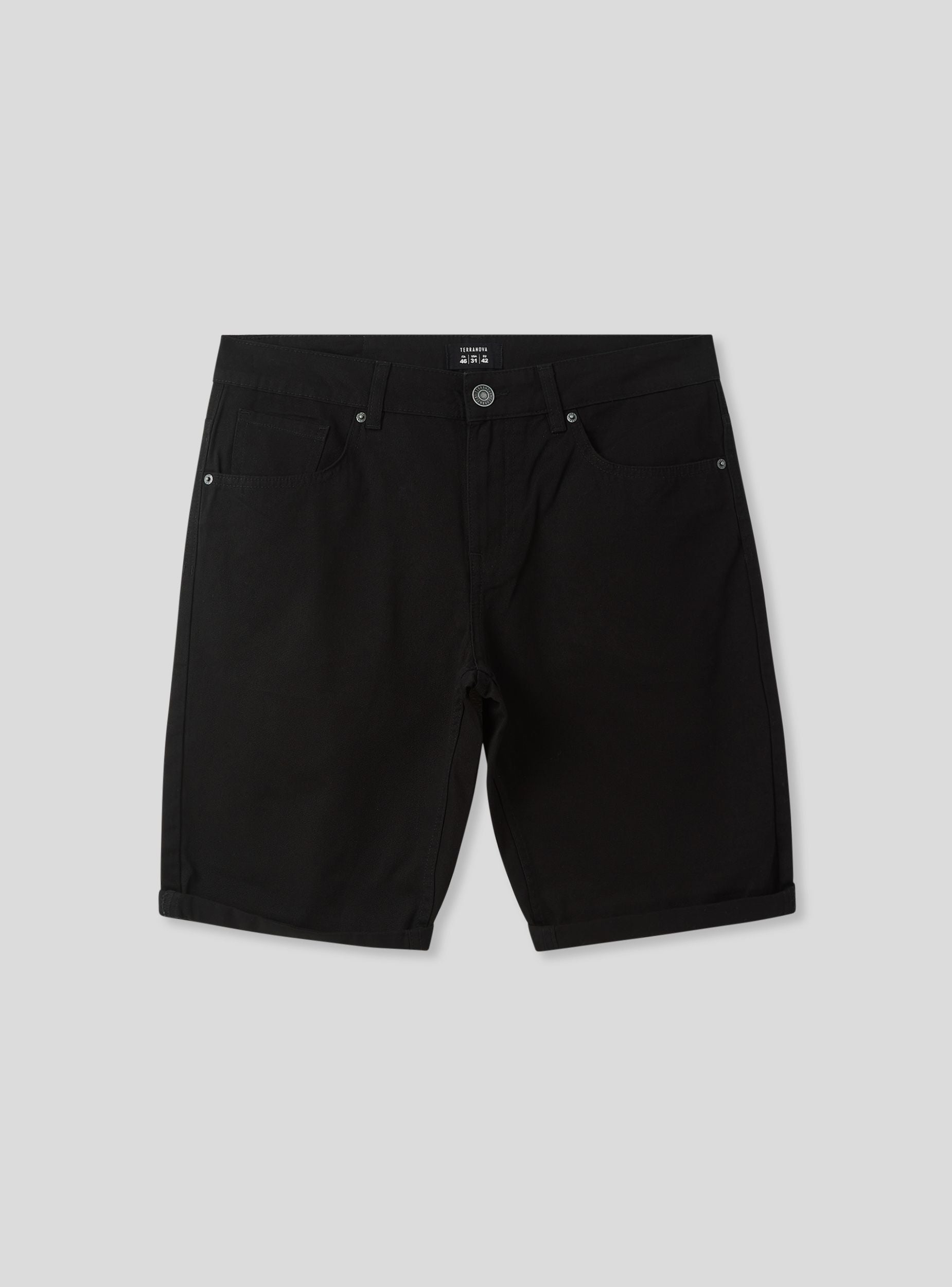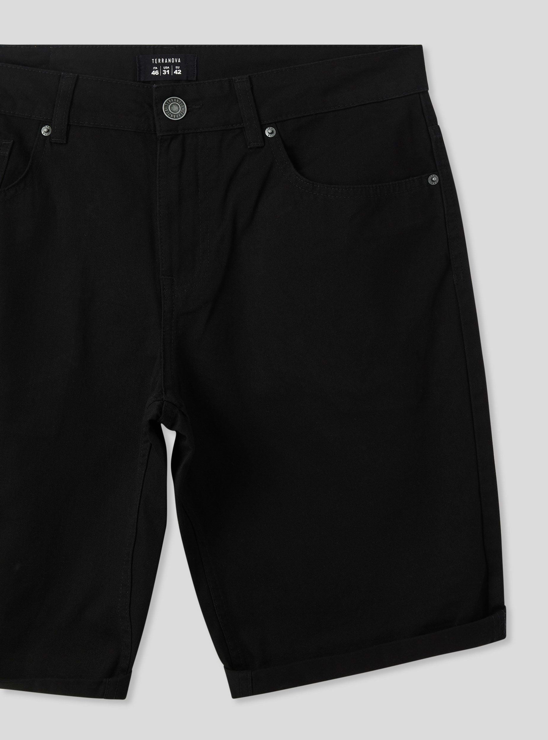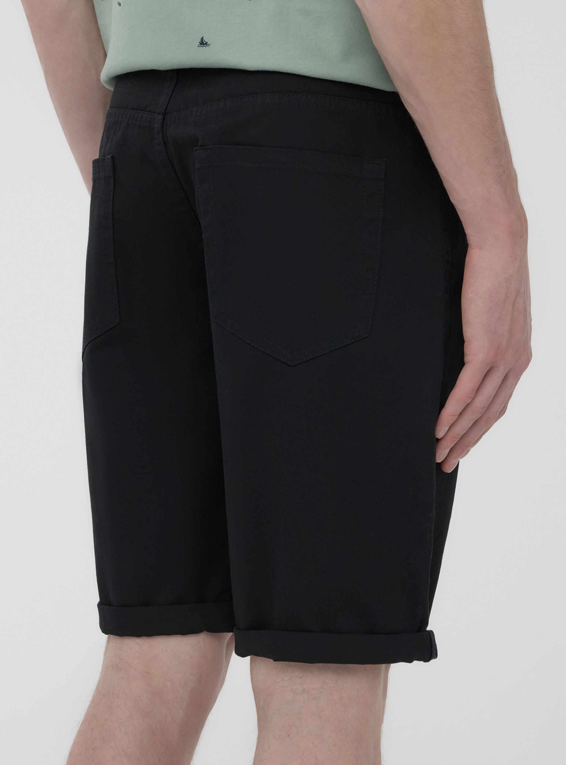 Men's solid colour shorts, featuring a five-pocket design that makes them practical and versatile. The front closure is equipped with a button and zip, ensuring a comfortable and secure fit. The modern cut follows the line of the leg, offering a tailored silhouette. Perfect for a casual look, they easily adapt to different occasions while maintaining a simple and functional style.Details