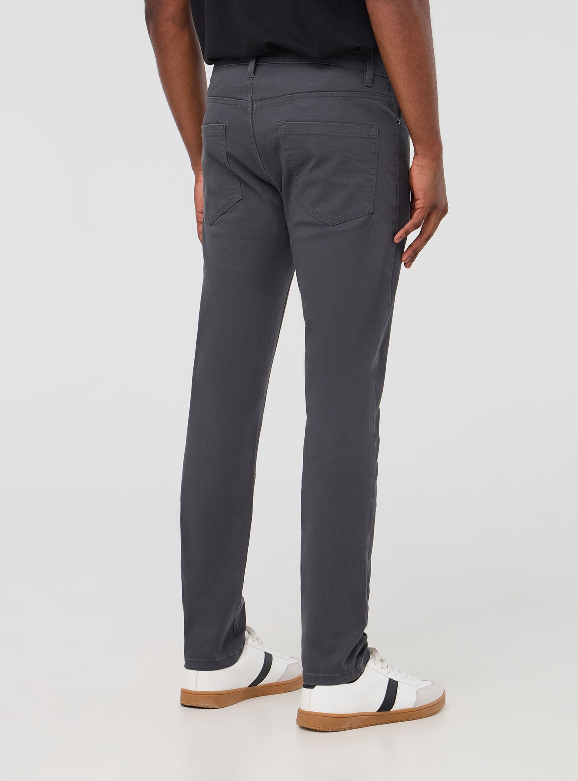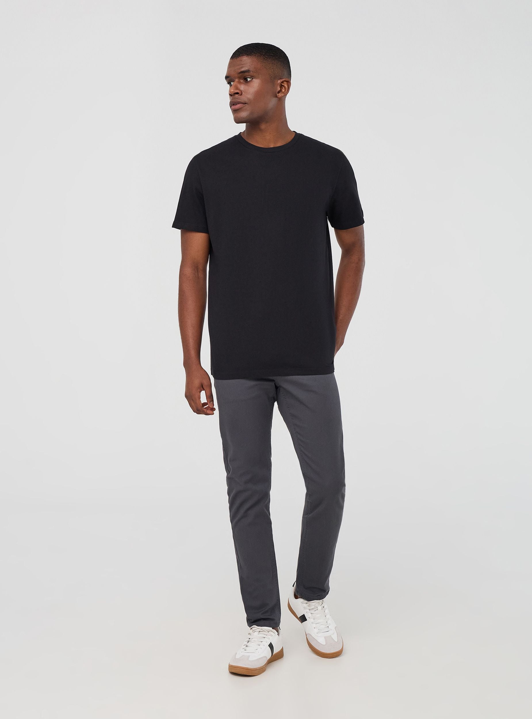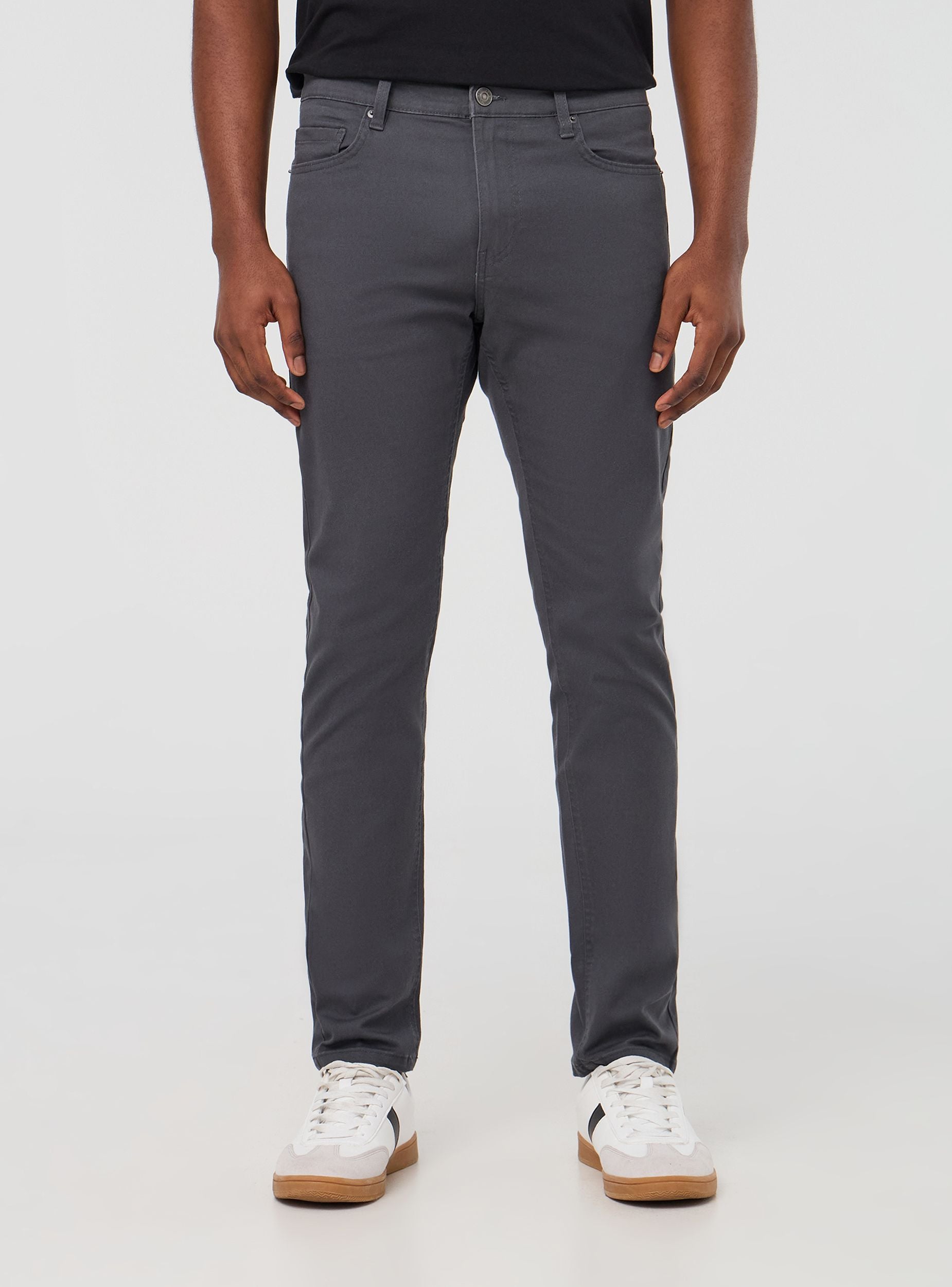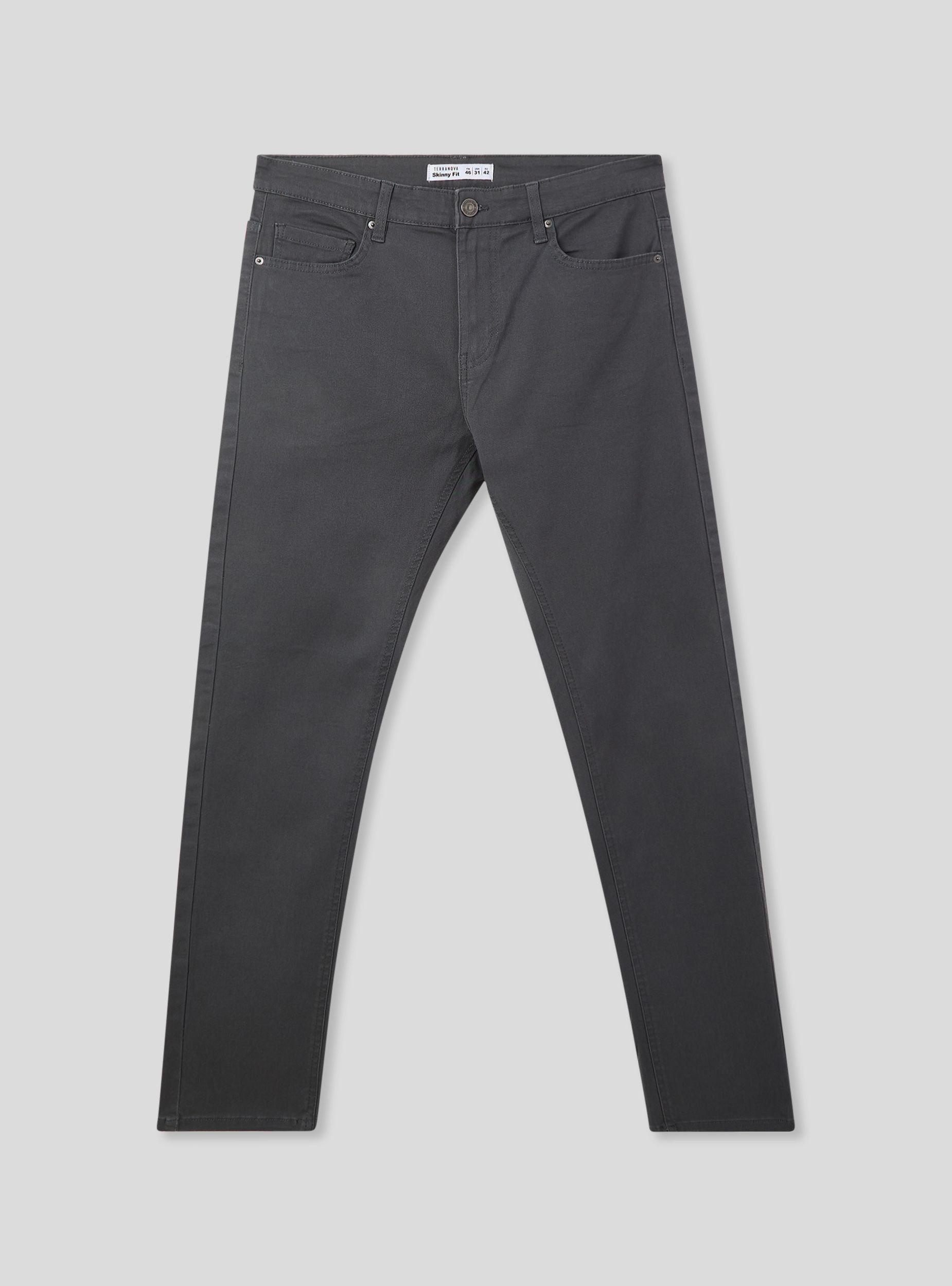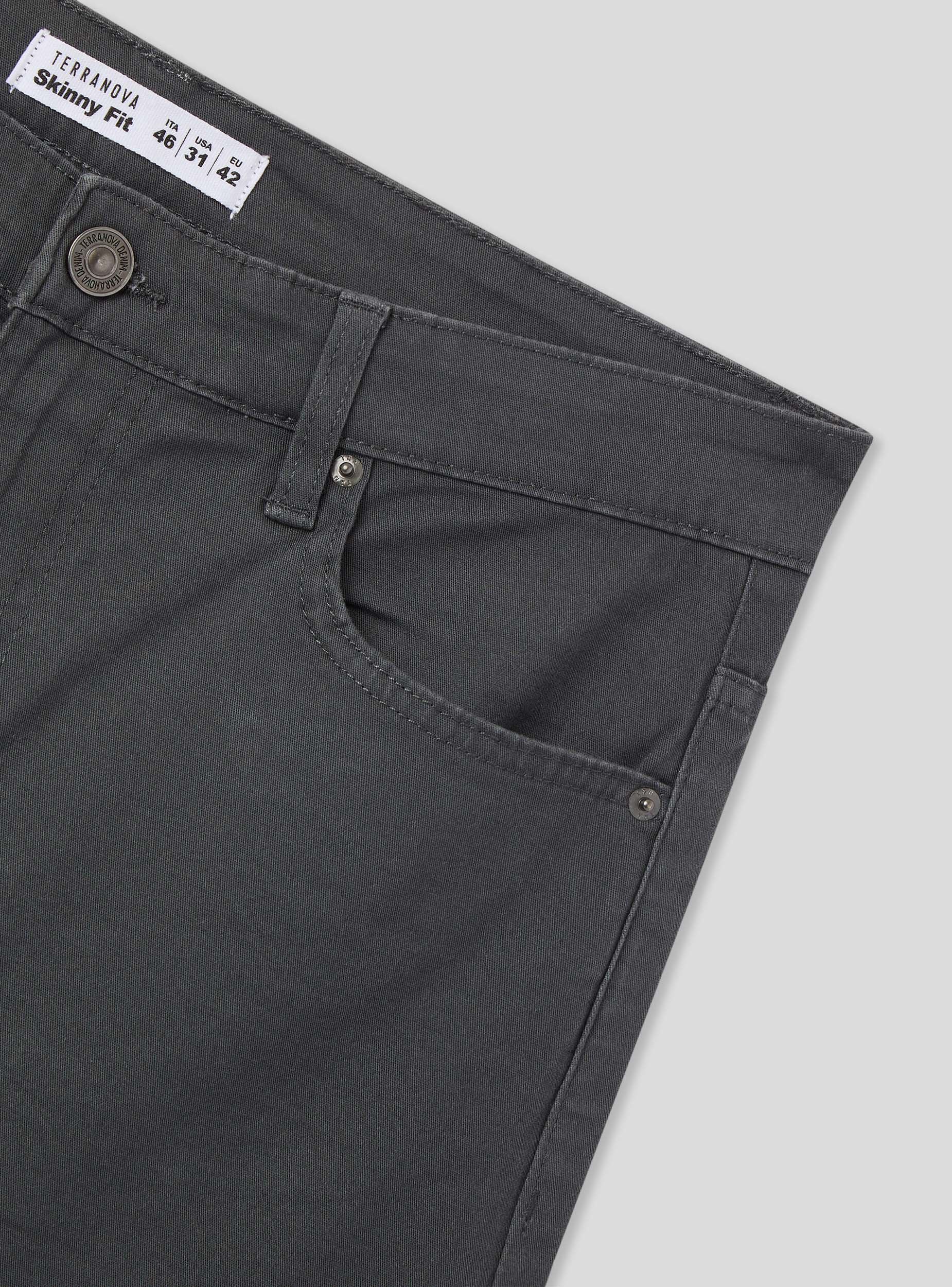 Men's trousers with a modern and versatile style, featuring a skinny fit that enhances the silhouette. The solid colour design includes five practical and functional pockets, ideal for every need. The front closure with button and zip adds practicality, while the belt loops allow for the addition of a belt for a personalised touch. A perfect piece to complete a casual yet polished look.Details