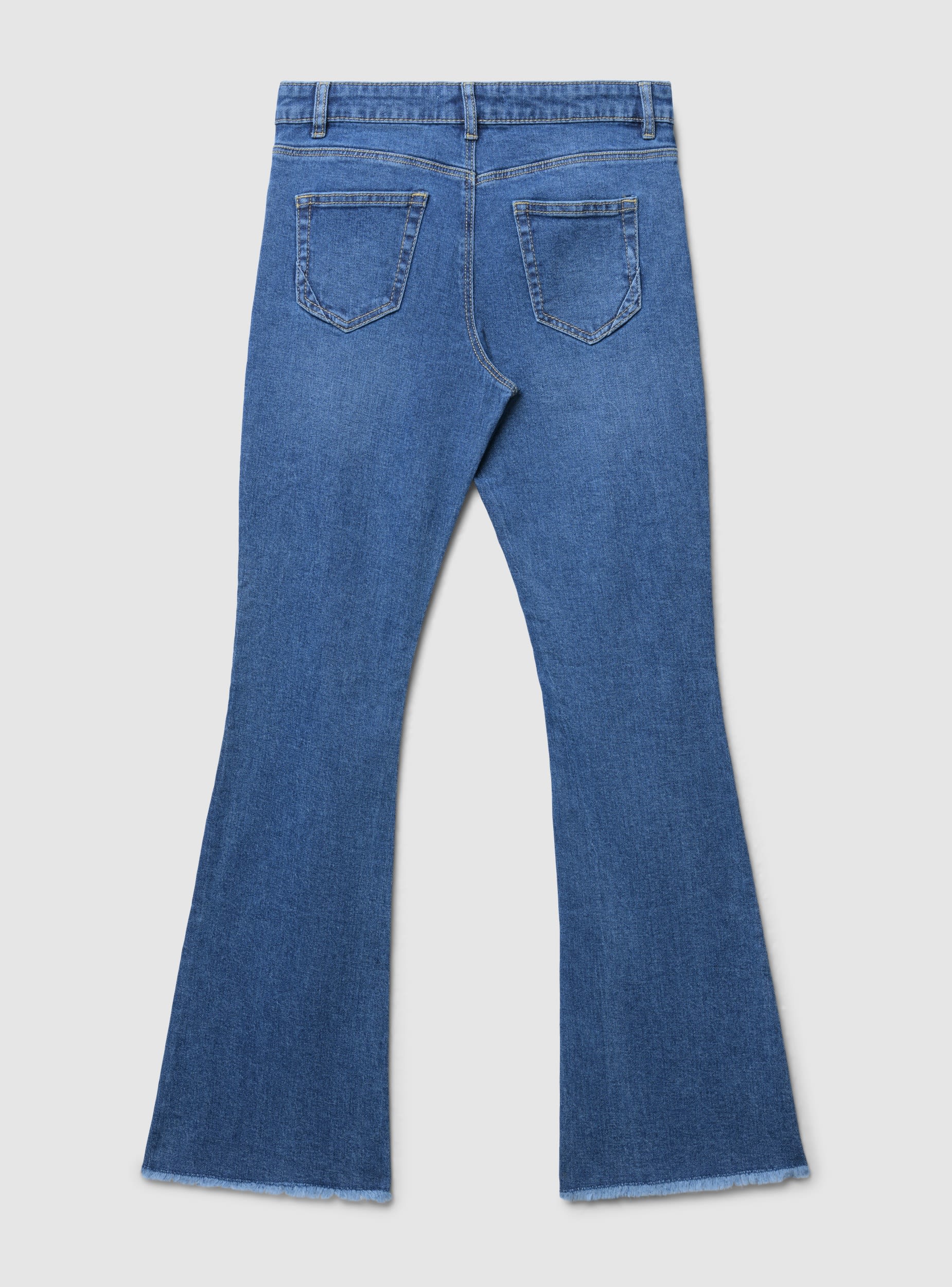 Girls' flared-fit jeans featuring decorative rips on the legs. Ideal for a casual and fashionable look, they pair perfectly with t-shirts and sneakers for an everyday outfit. They have a button and zip closure, and 5 functional pockets. Perfect for adding a touch of style to the wardrobe.