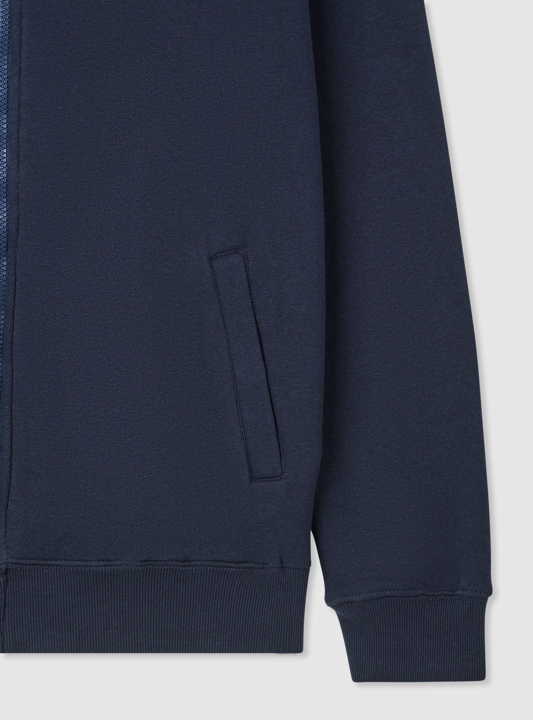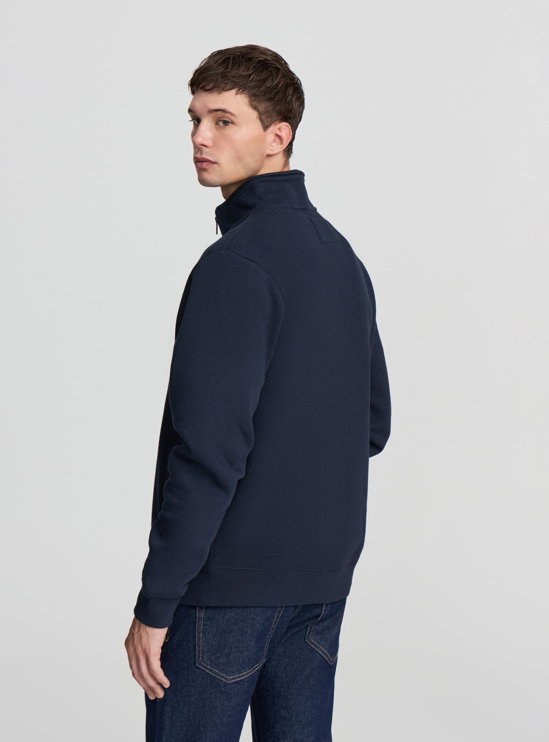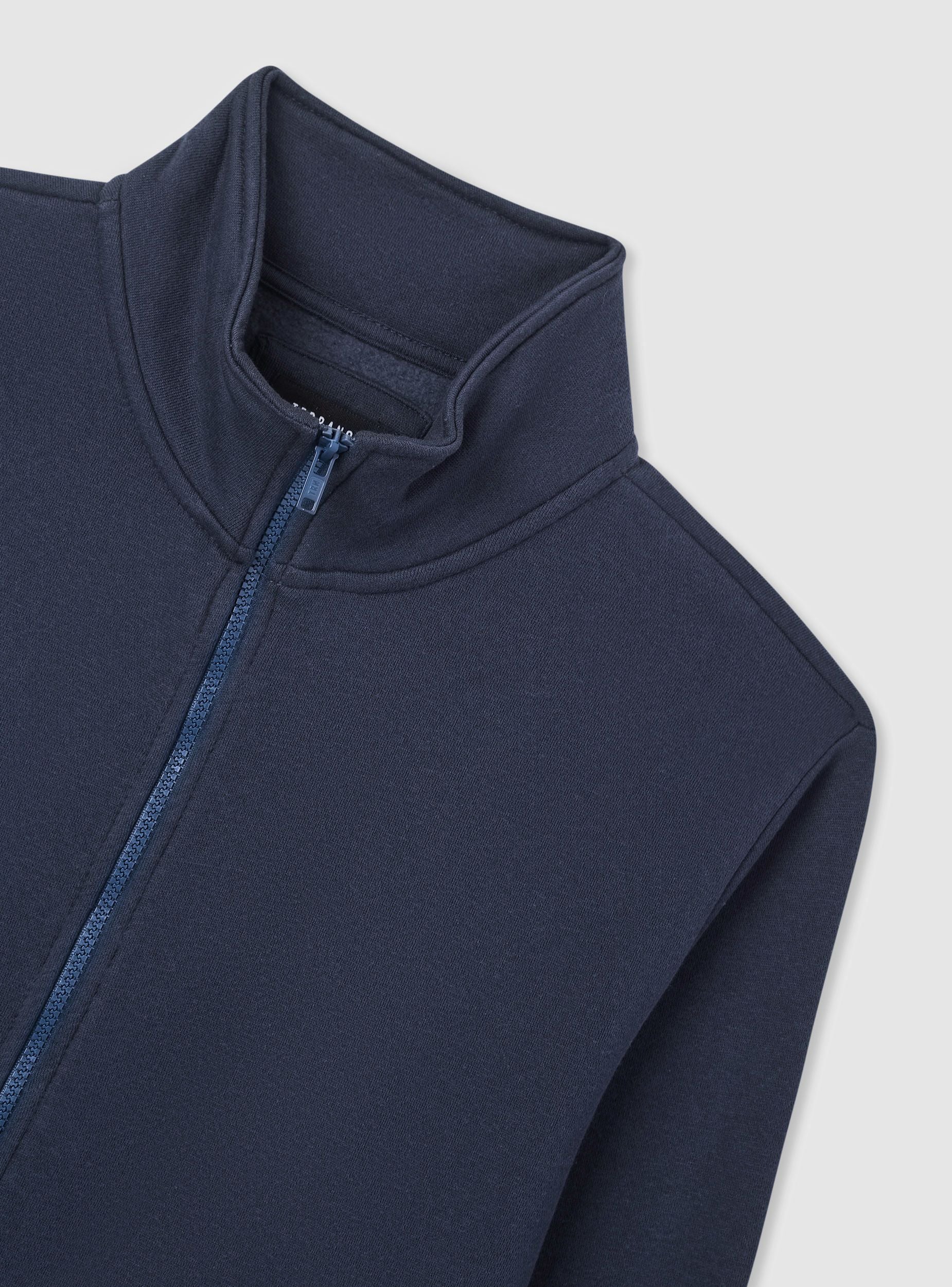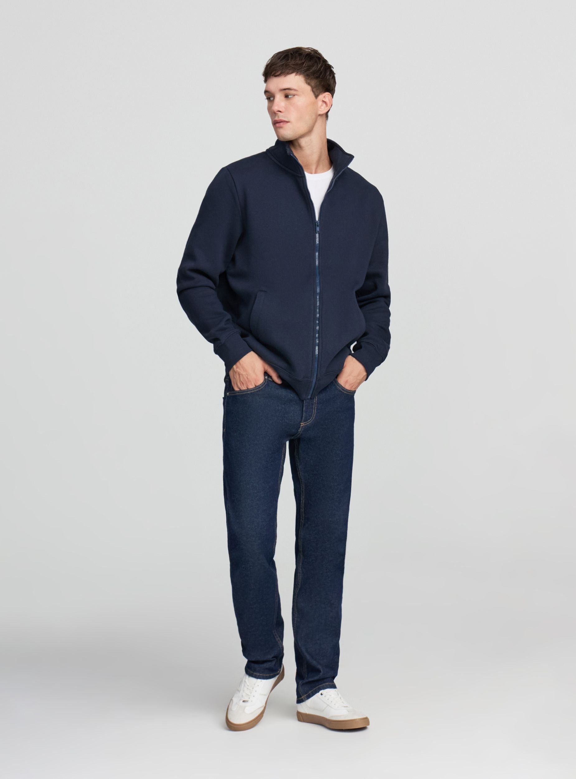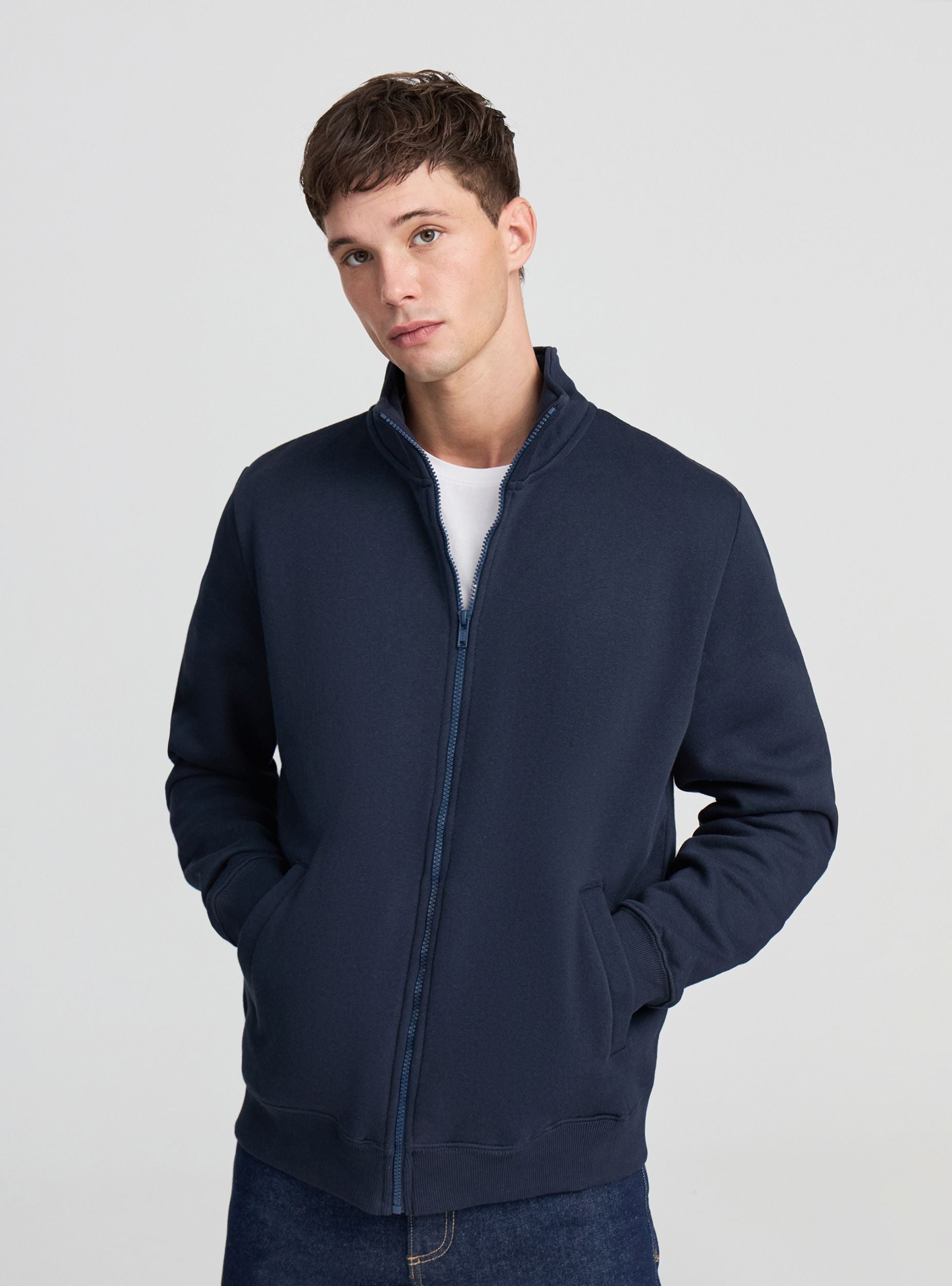 Men's sweatshirt jacket with zip and no hood, ideal for a casual and versatile look. It features a comfortable fit and long sleeves, perfect for cool days. Equipped with practical side pockets for storing small items. The solid colour design makes it easy to pair with jeans or sports trousers, suitable for leisure time or an informal outfit.Details
