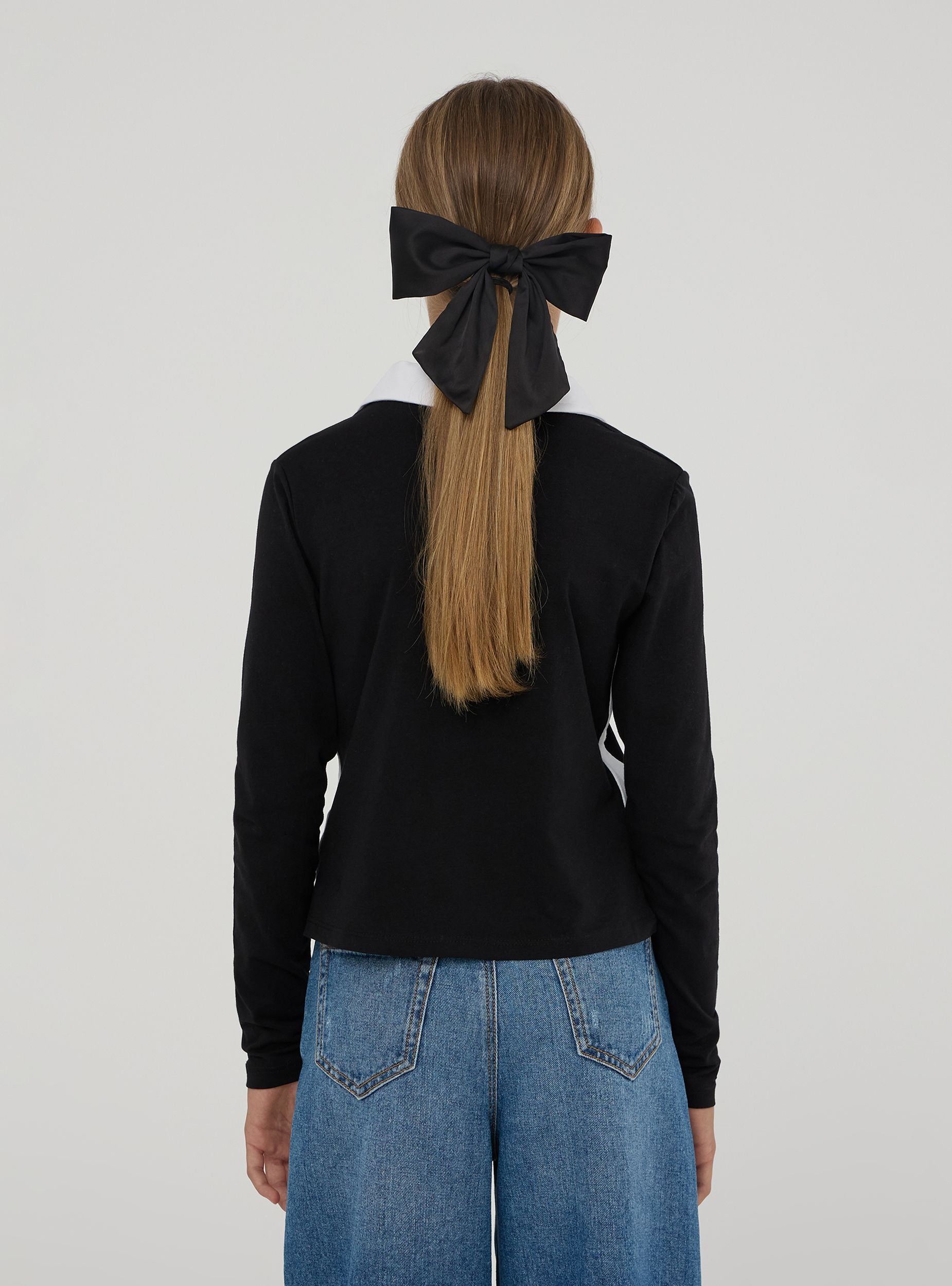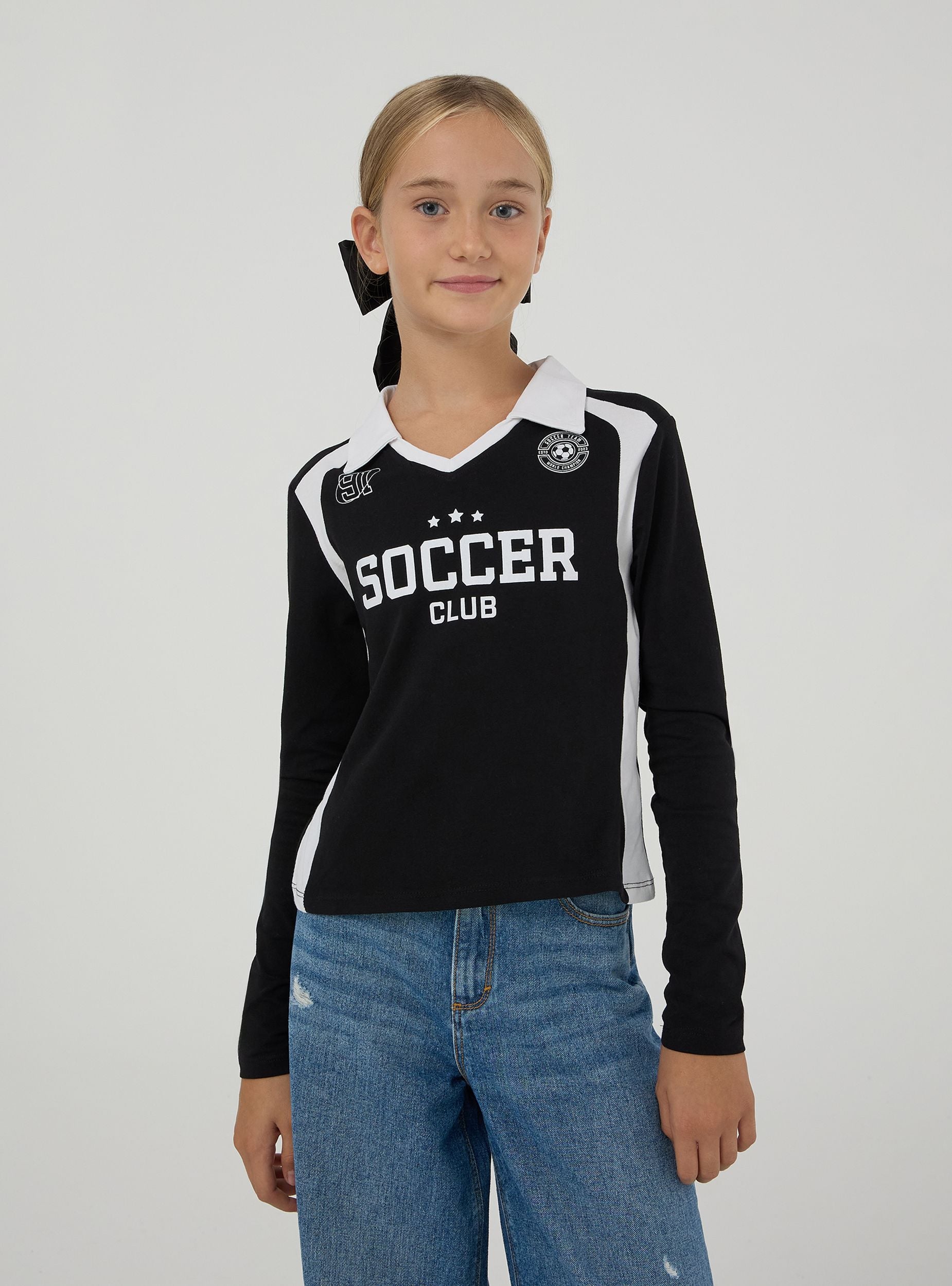 Girls' long-sleeved polo shirt, featuring a sporty design characterised by a front football-style print and contrasting details on the sides and shoulders. The garment has a classic collar with a V-neck. Perfect for a casual look during school days or afternoon outings, paired with jeans or sports trousers.