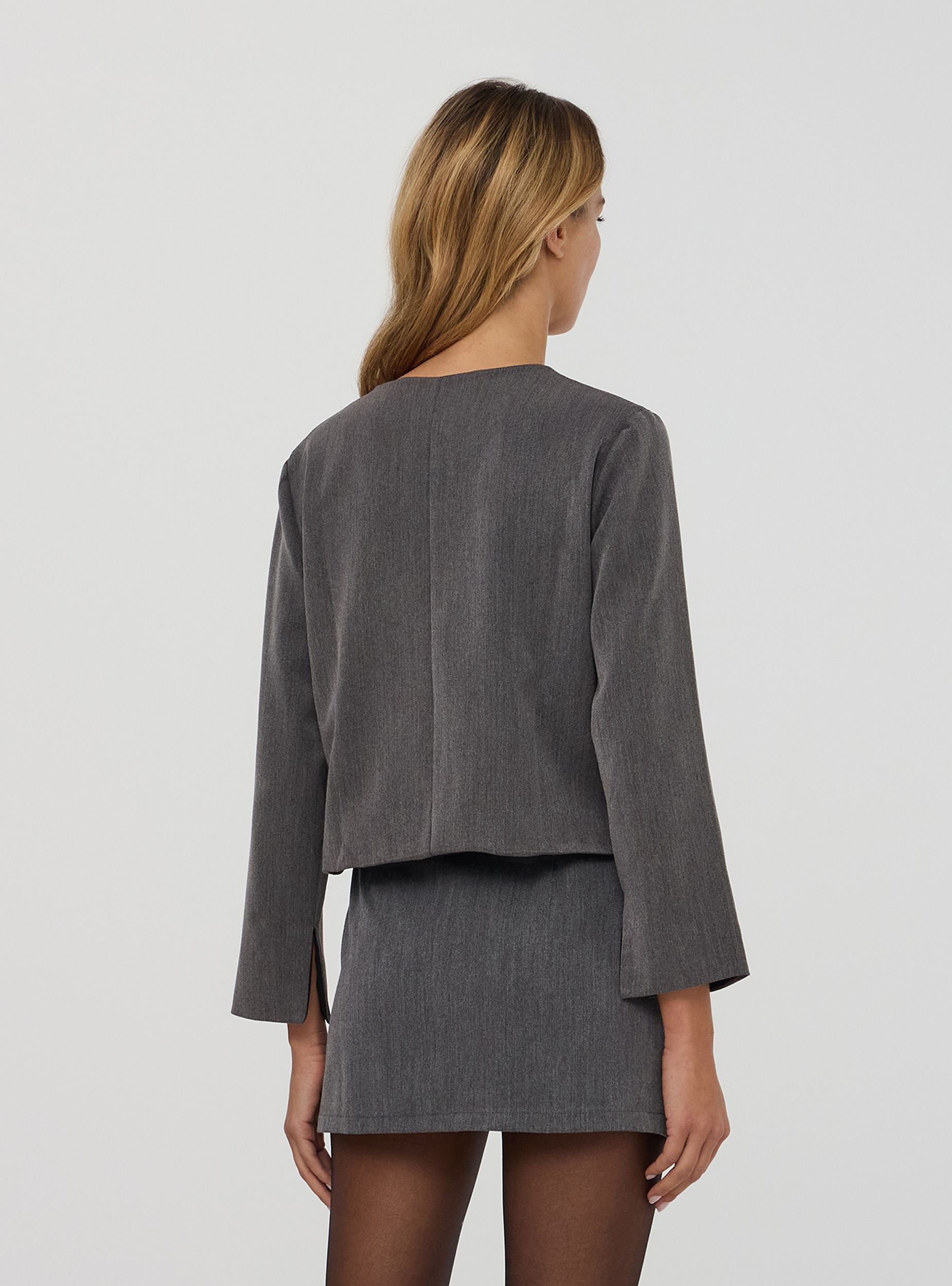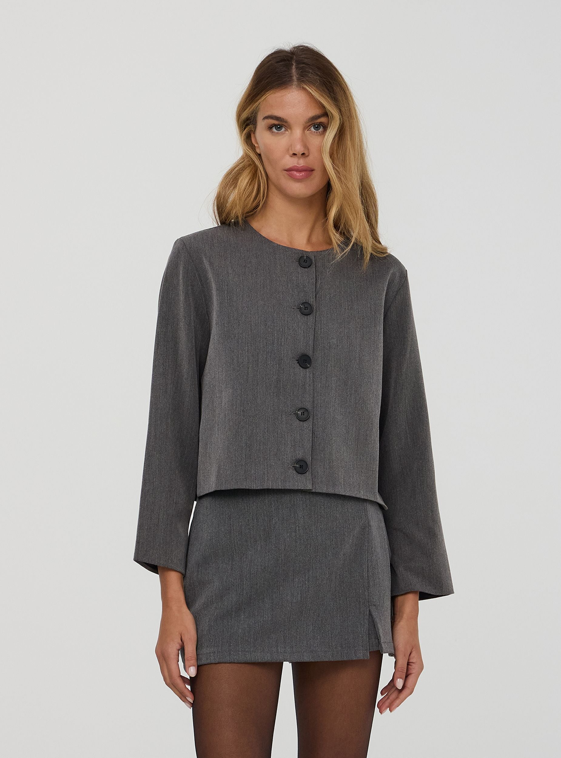 Women's jacket with a sleek cut, characterised by a refined solid colour that makes it ideal for any occasion. The design features a round neck and long sleeves, ensuring an elegant and contemporary style, while the buttons at the front add a sophisticated and functional touch. Perfect for completing casual or more formal looks, guaranteeing versatility and practicality at any time of the day.