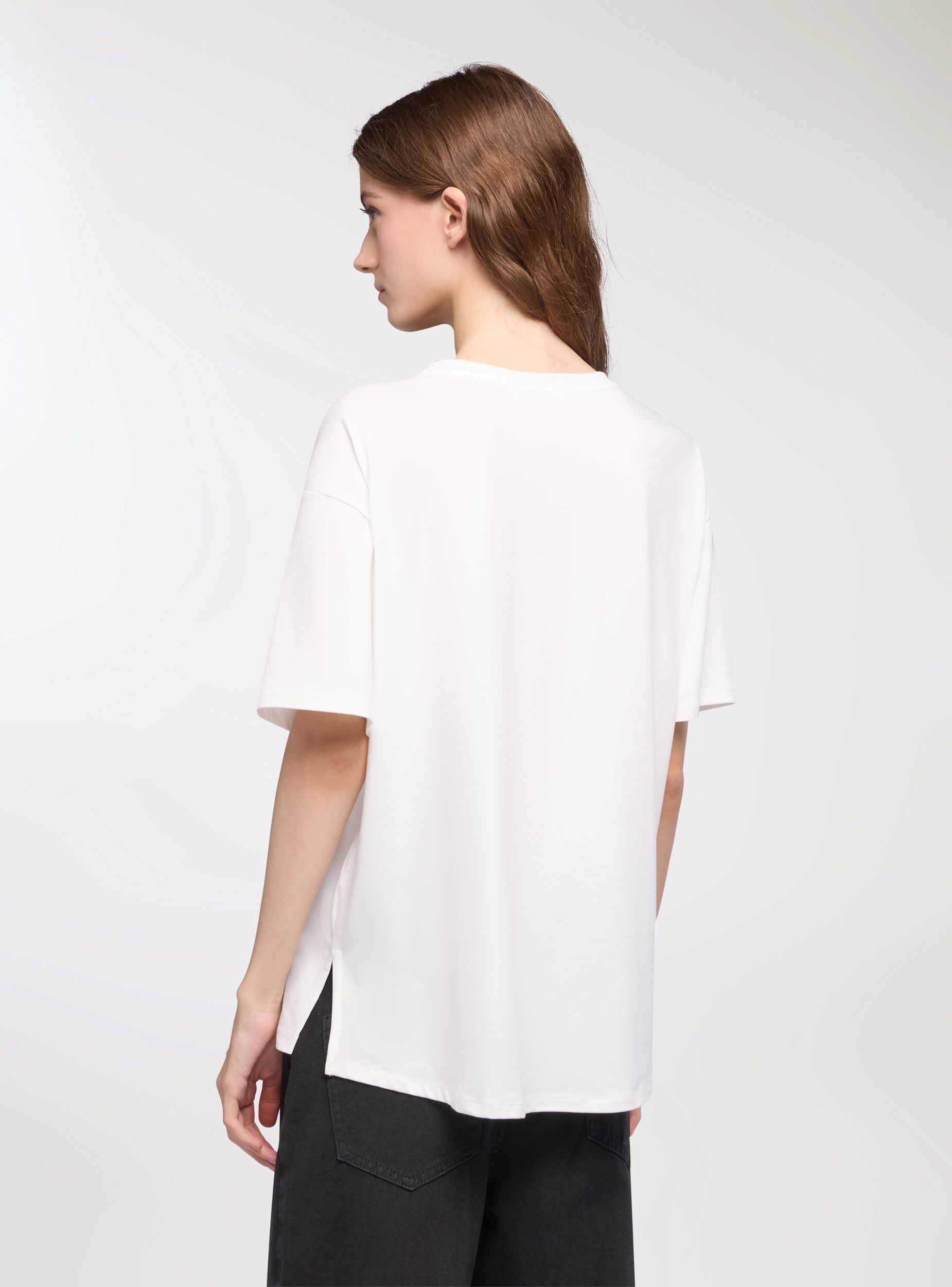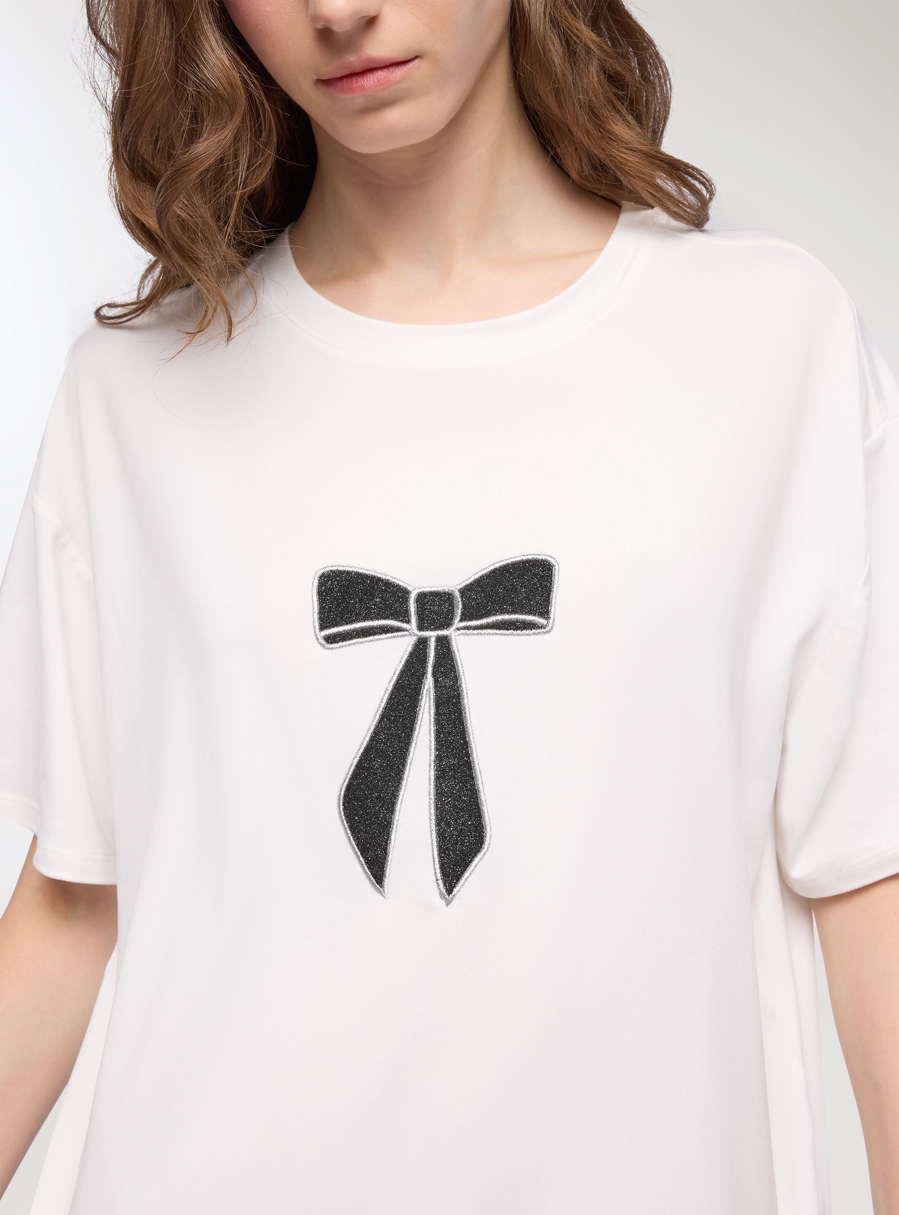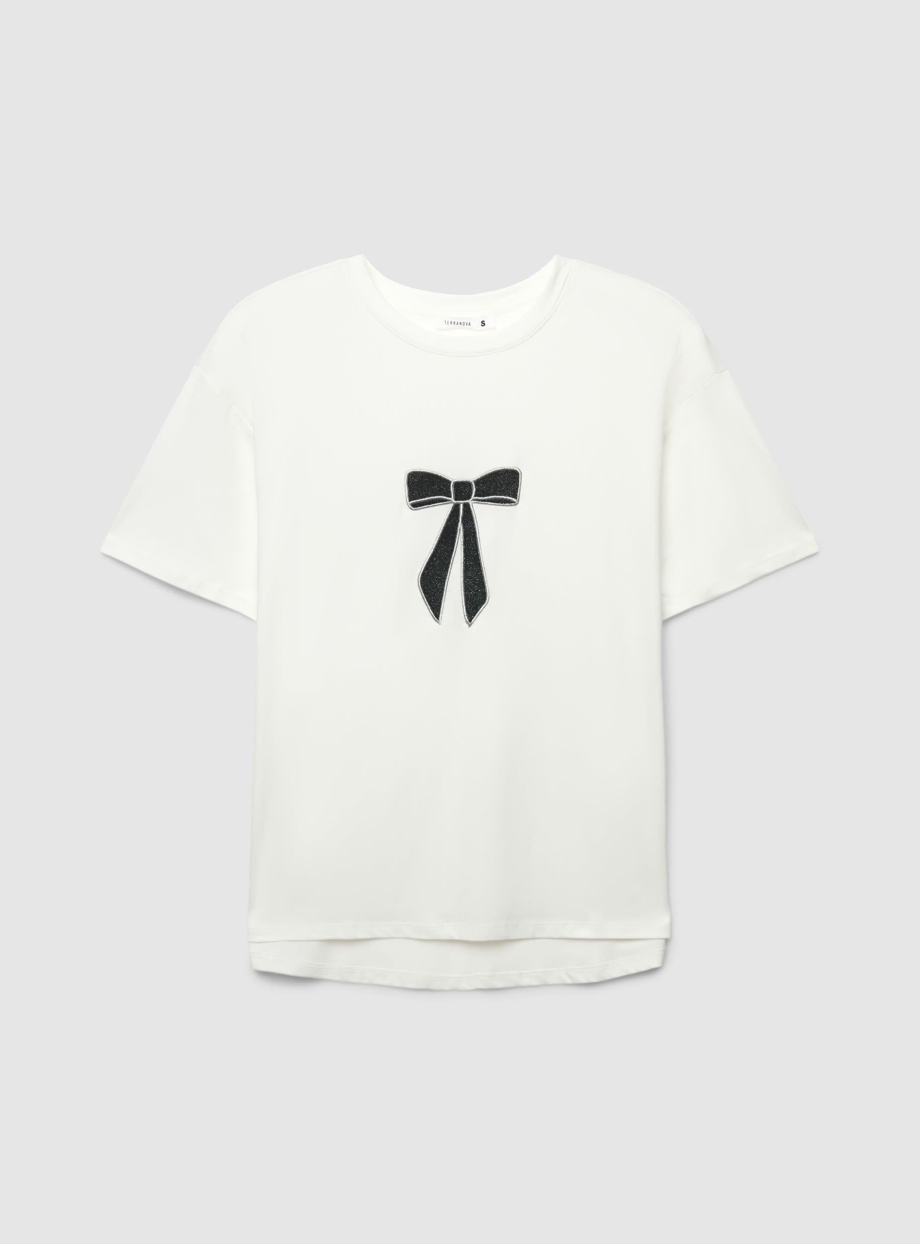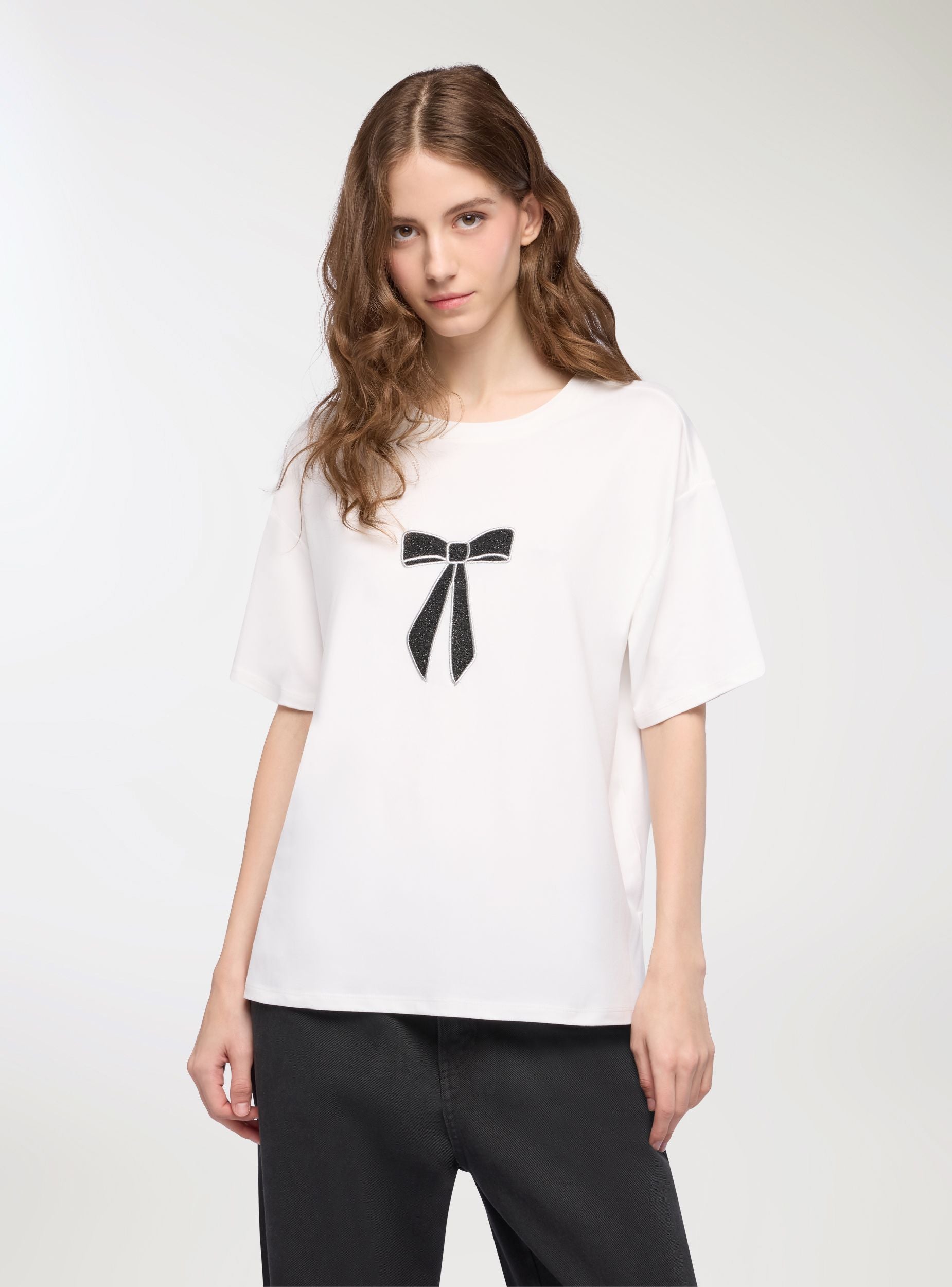Women's short-sleeve T-shirt with a round neckline, enhanced by a bow print on the chest that adds a feminine touch. Regular fit and hip-length, ideal for everyday looks or evening outings. Easy to pair with jeans, cigarette trousers, or skirts. Also perfect under blazers or cardigans.