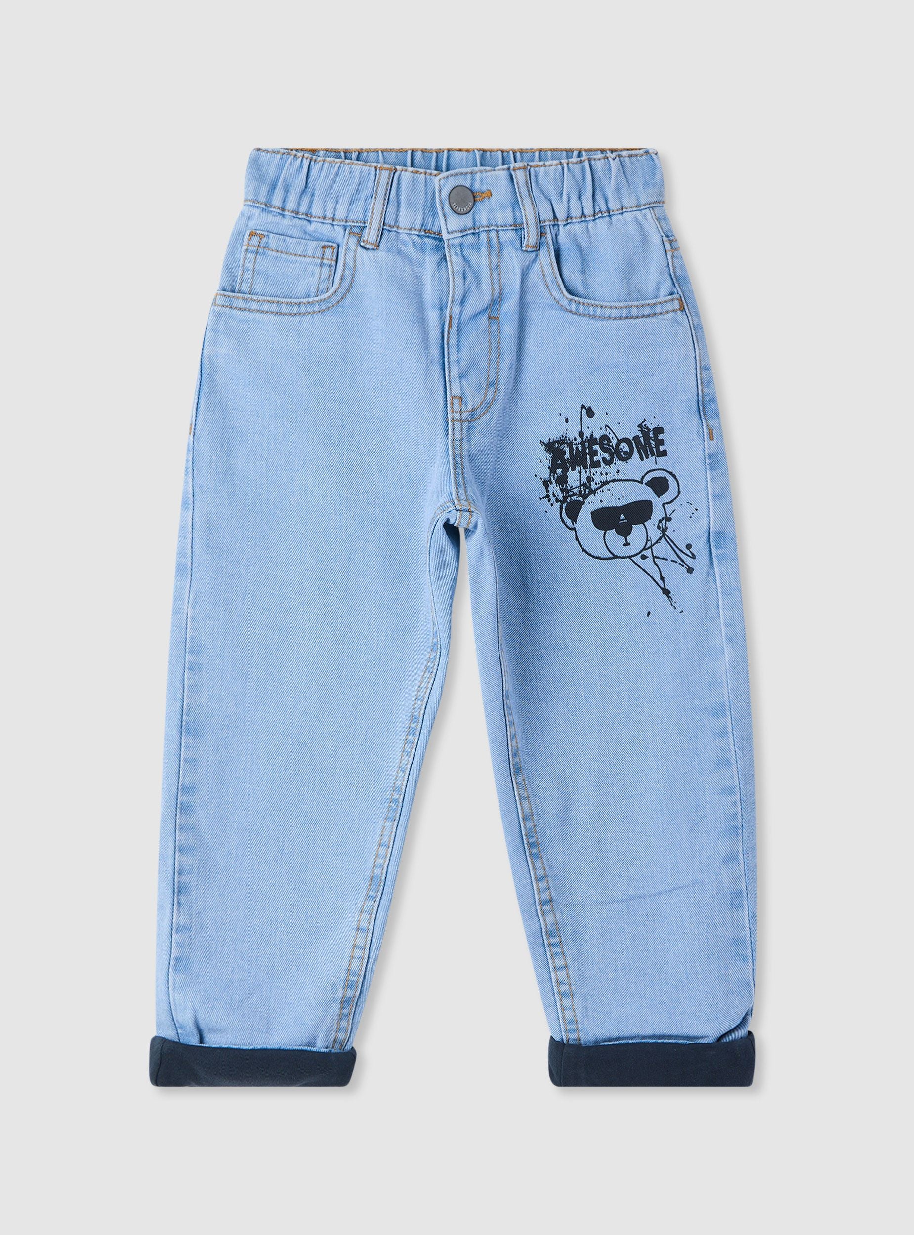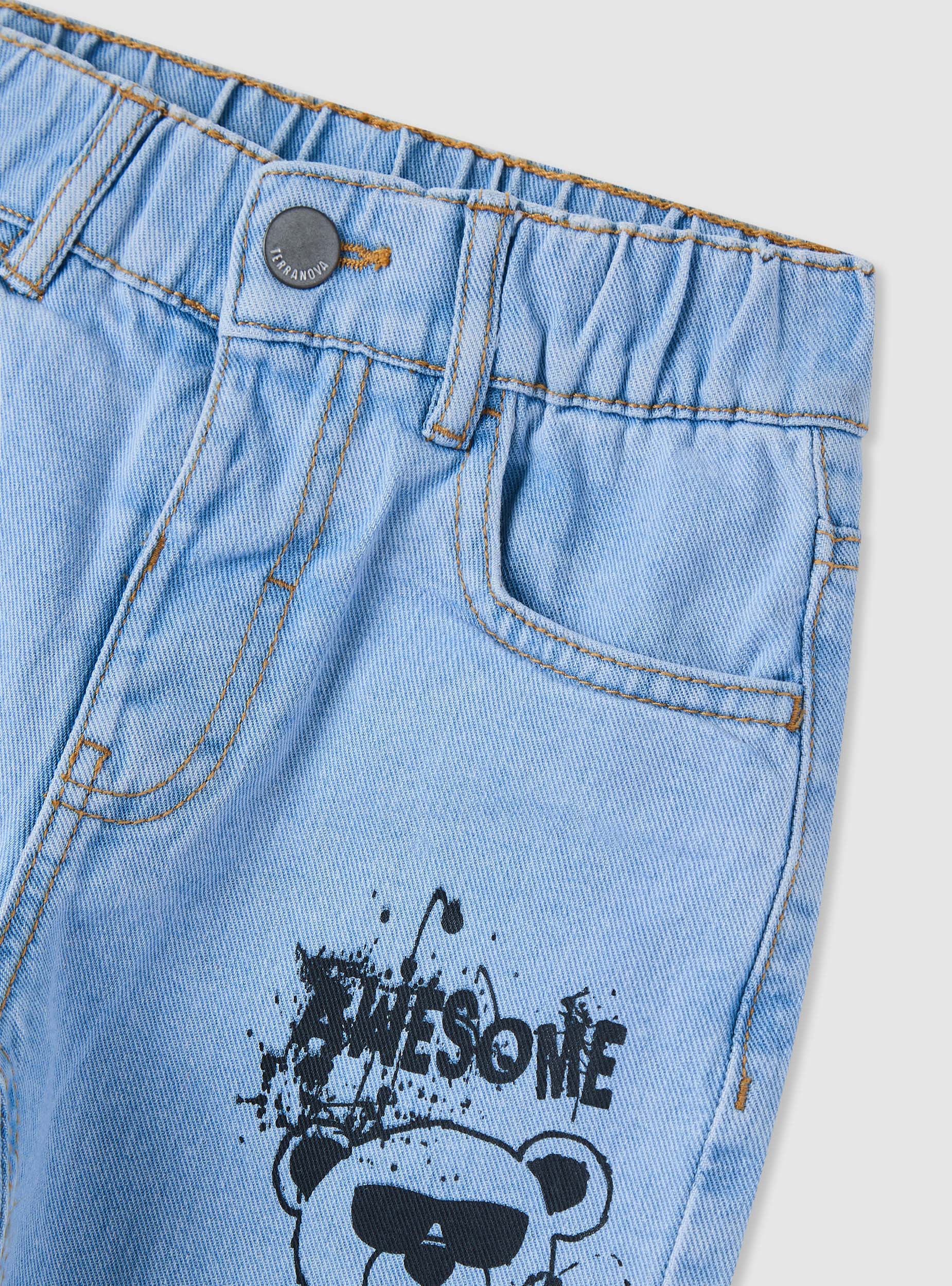 Children's jeans with a teddy bear print and the word "Awesome," ideal for a casual and playful look. They feature a regular fit and a button closure. Perfect for pairing with colourful t-shirts and trainers, these jeans are suitable for leisure time and outdoor days. Equipped with an elasticated waistband and warm inner lining. With practical pockets and design details that make them a unique and original garment.Details