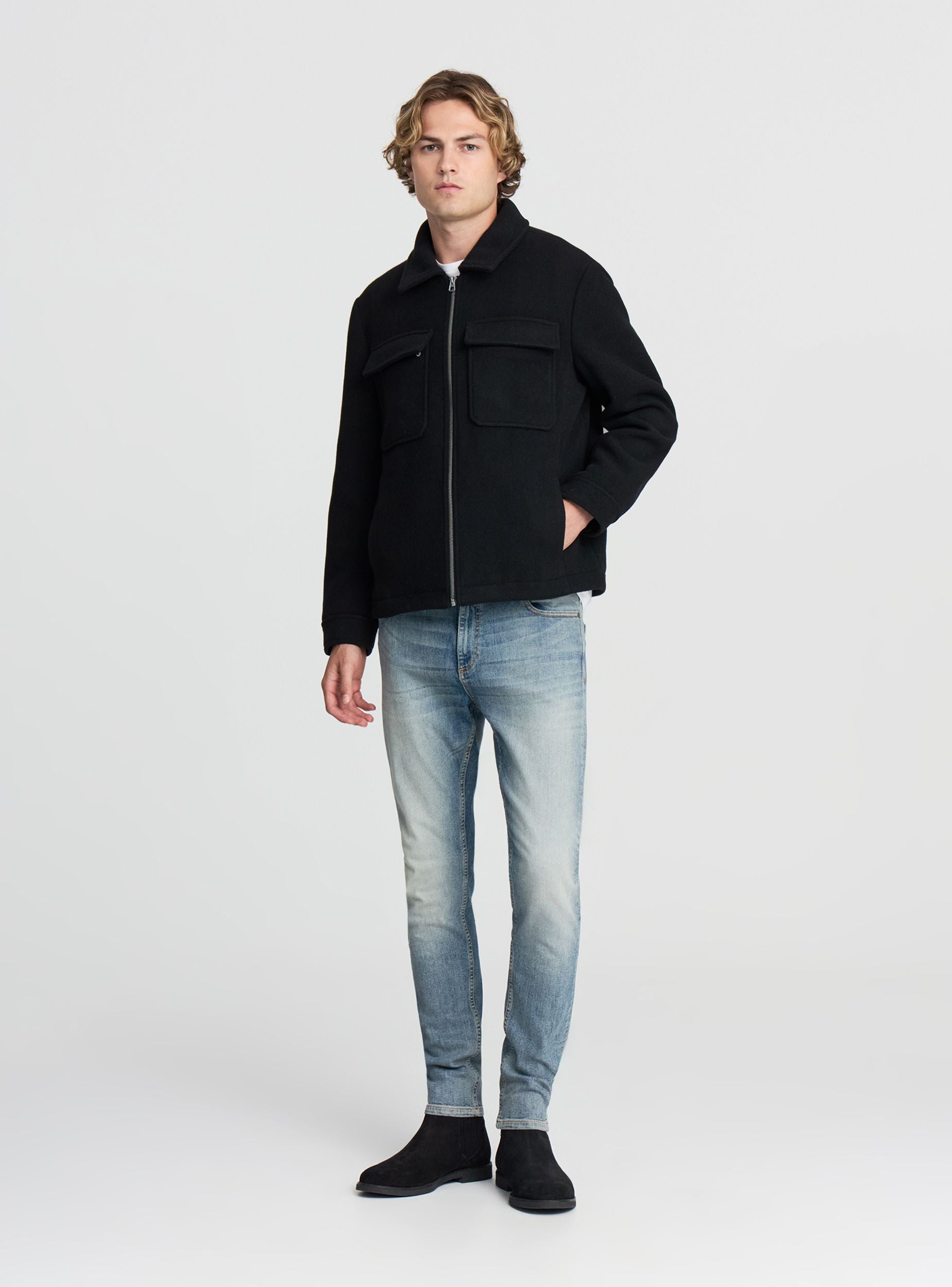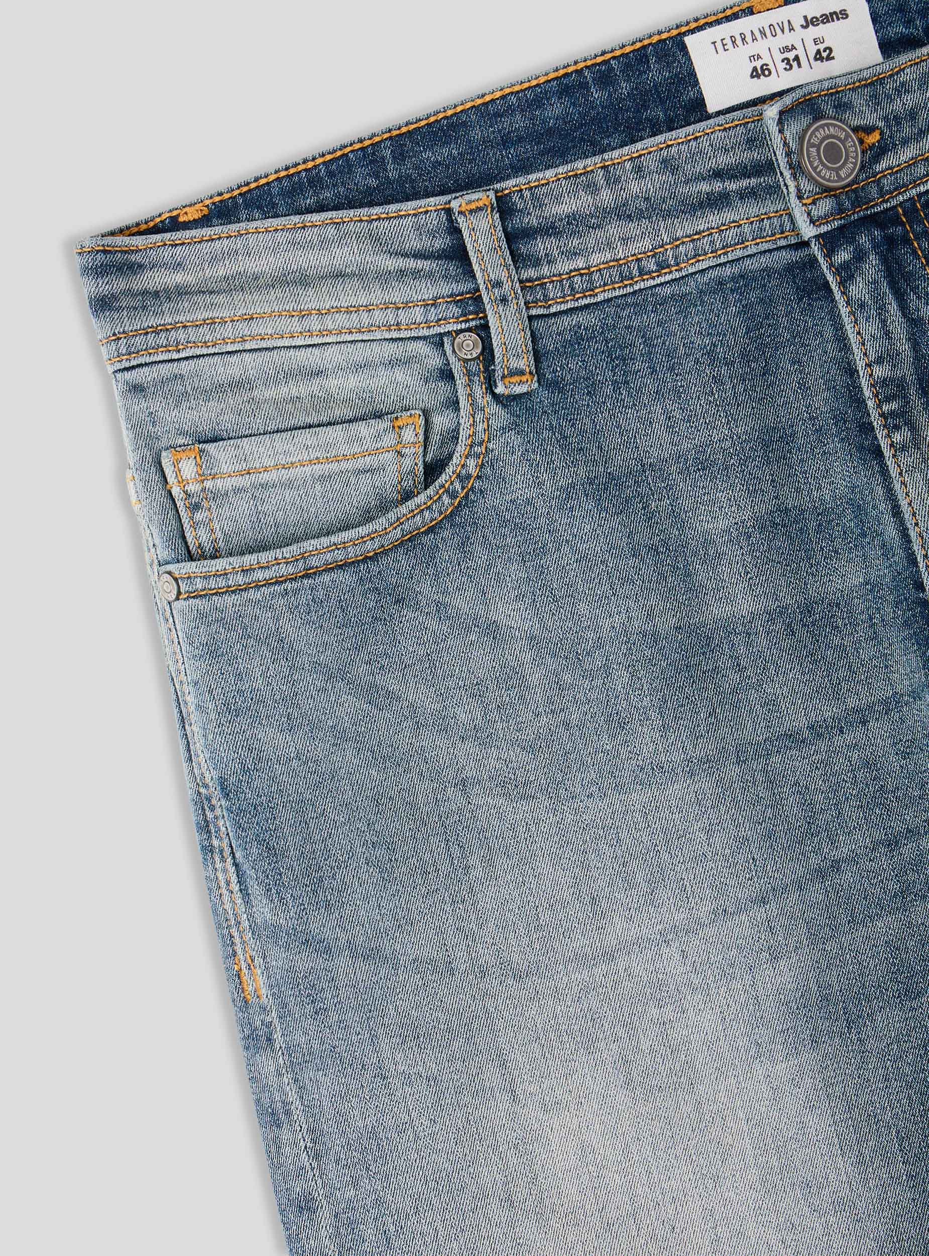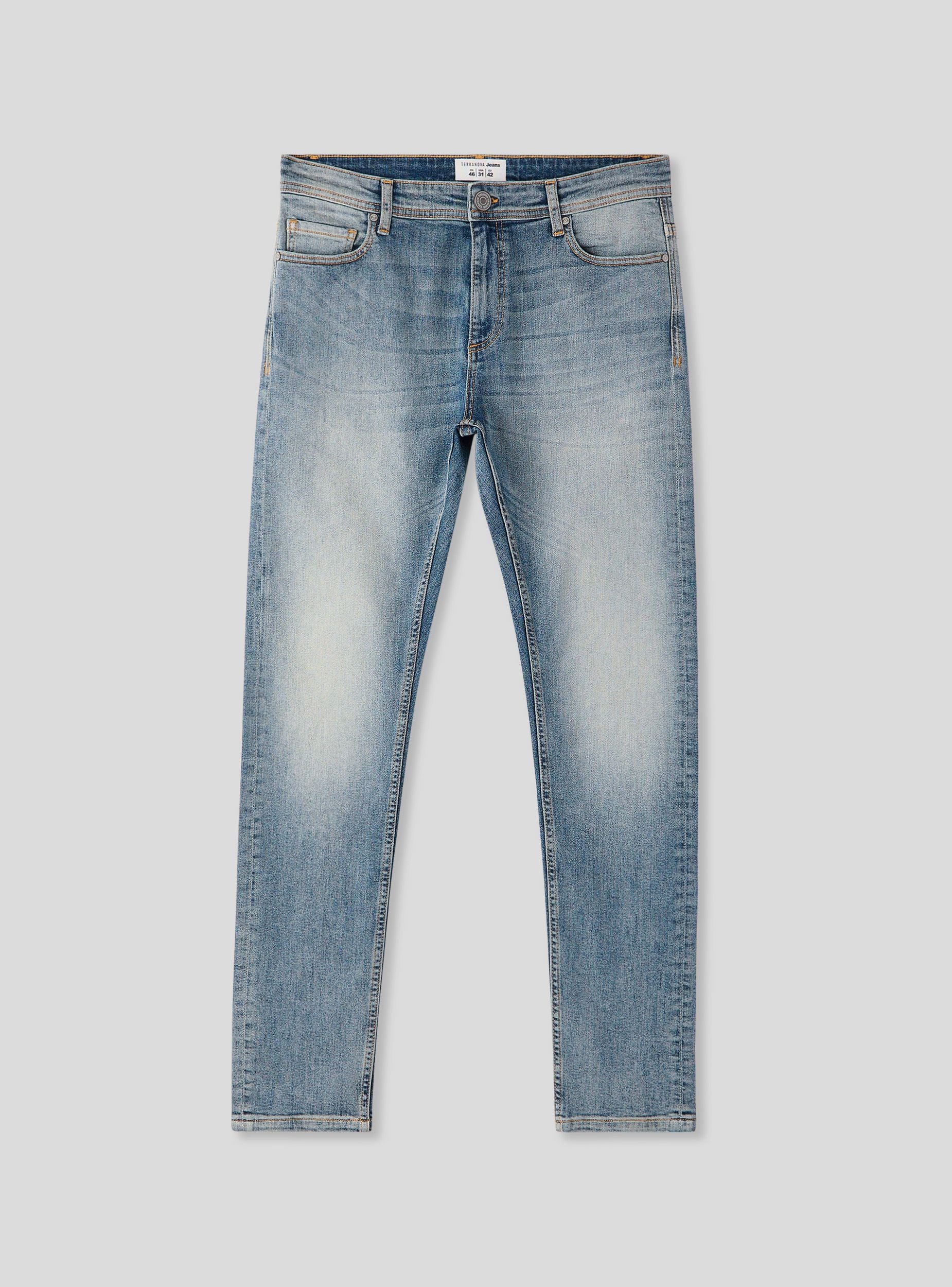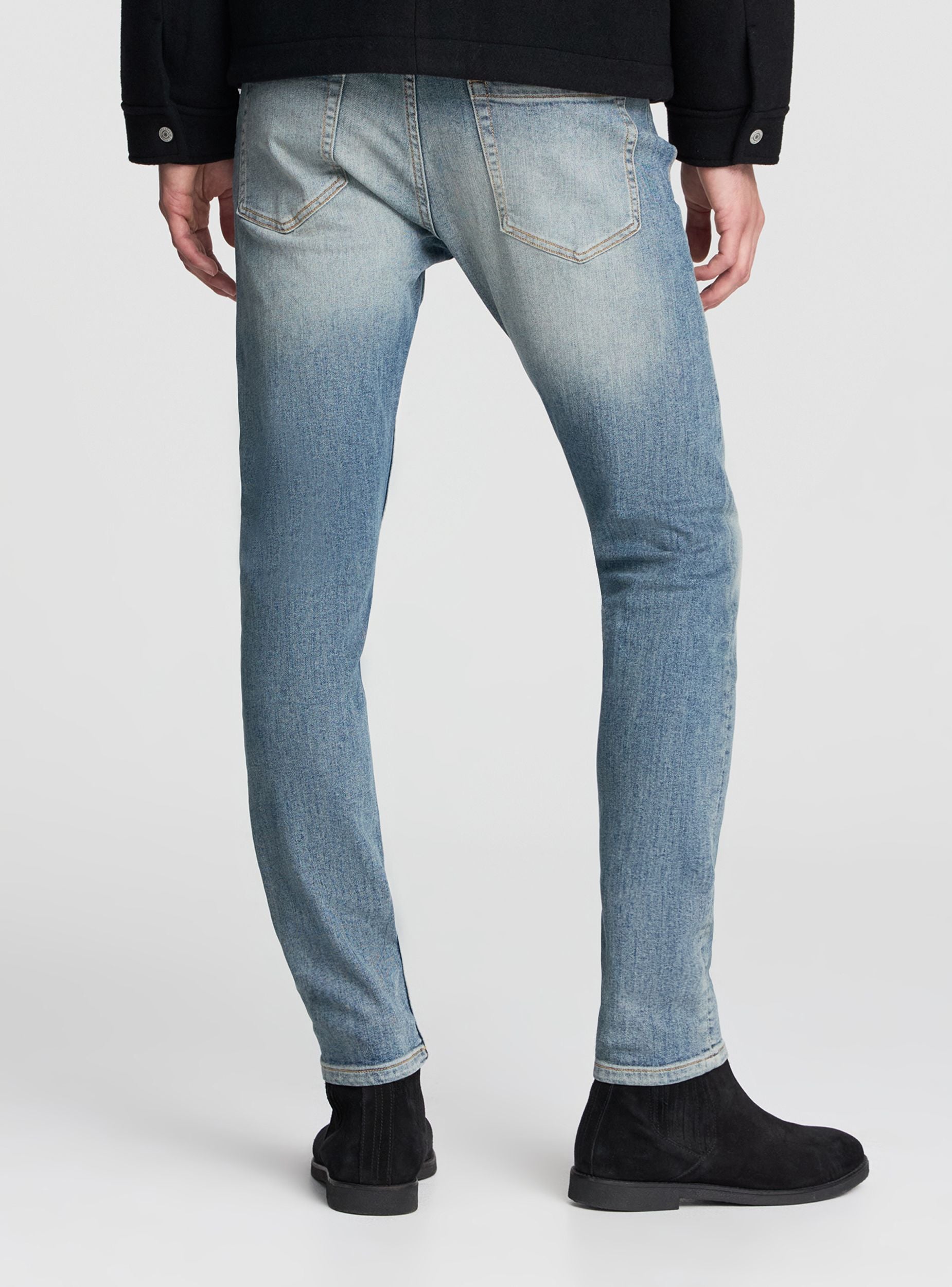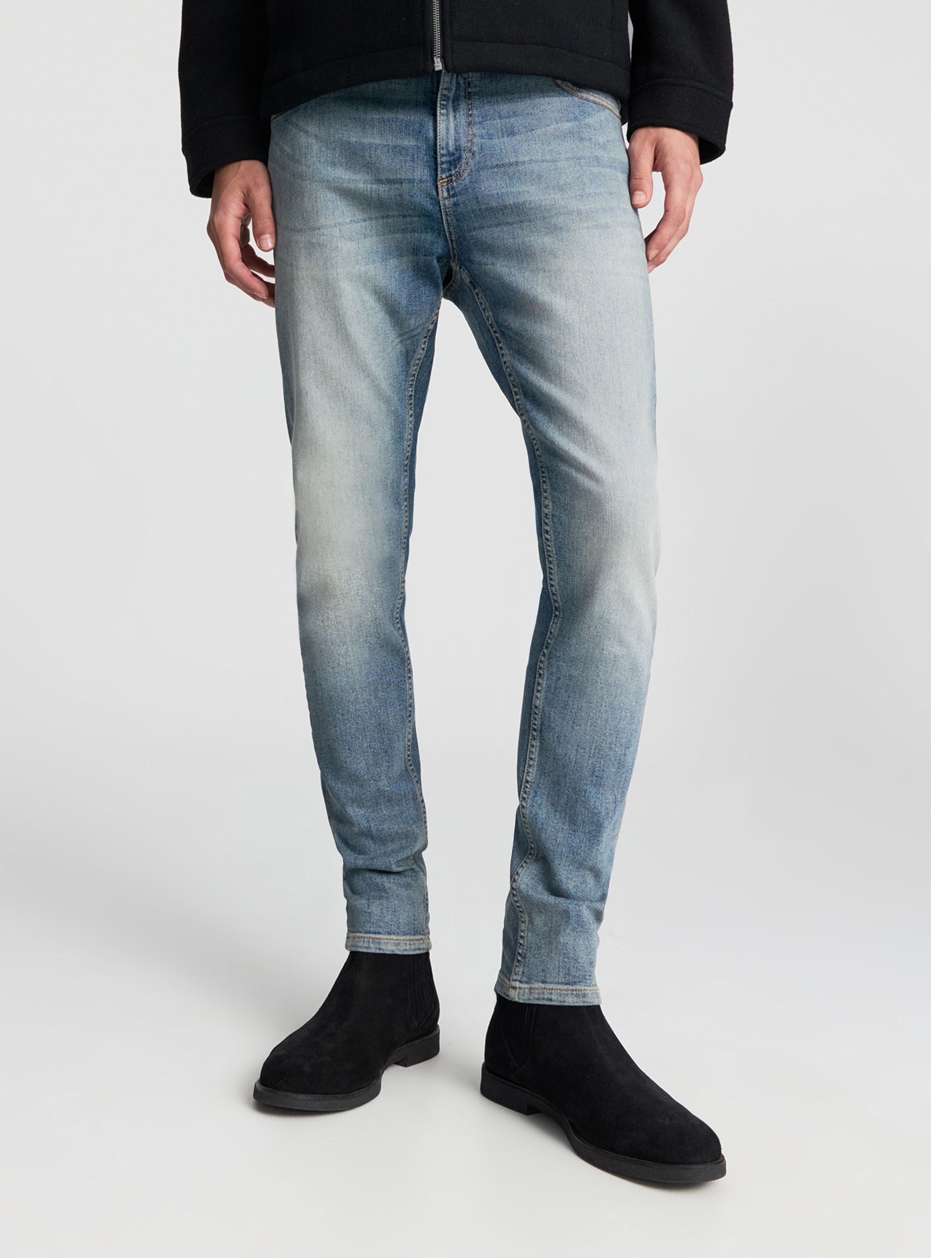 Men's skinny fit jeans, perfect for a casual and versatile look. They feature a button and zip closure, five pockets, and a mid-rise waist. Ideal for pairing with t-shirts or shirts for leisure time or a casual outing. The fitted cut enhances the silhouette, while the solid colour and light denim wash give a modern and fresh touch.Details