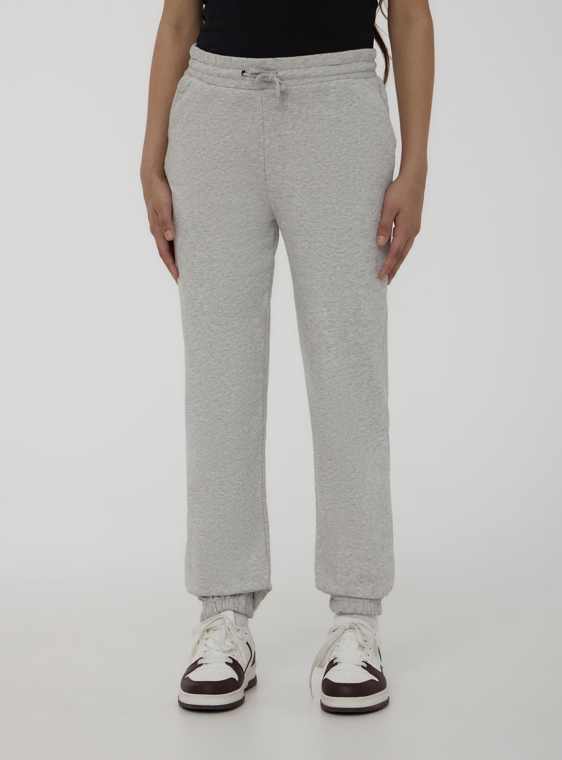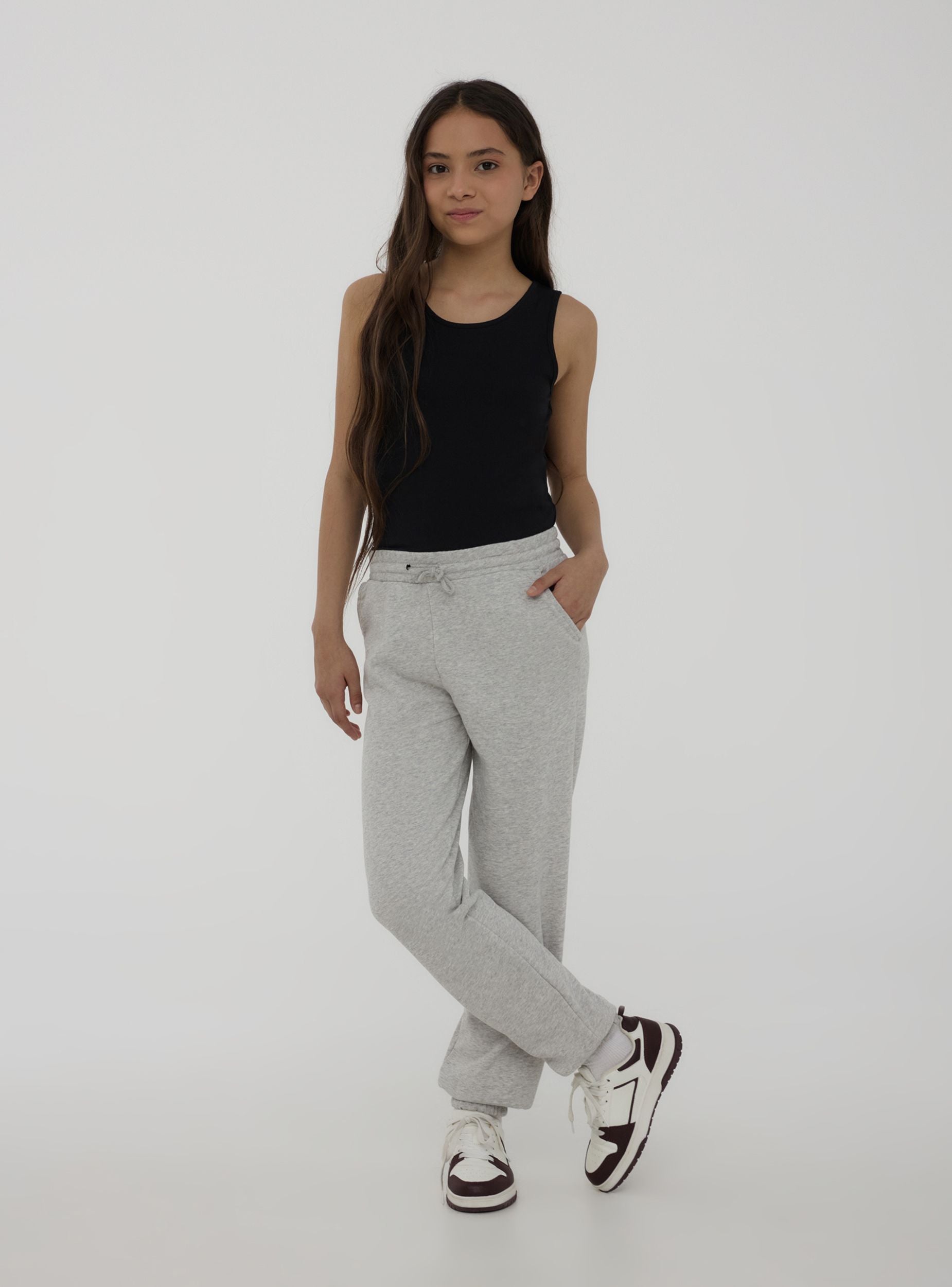 Lightweight girls' tracksuit bottoms perfect for leisure time or everyday activities. Made in a solid colour, they offer a comfortable fit thanks to the drawstring at the waist and practical side pockets. The cuffs complete the design, ensuring comfort and style for any occasion.