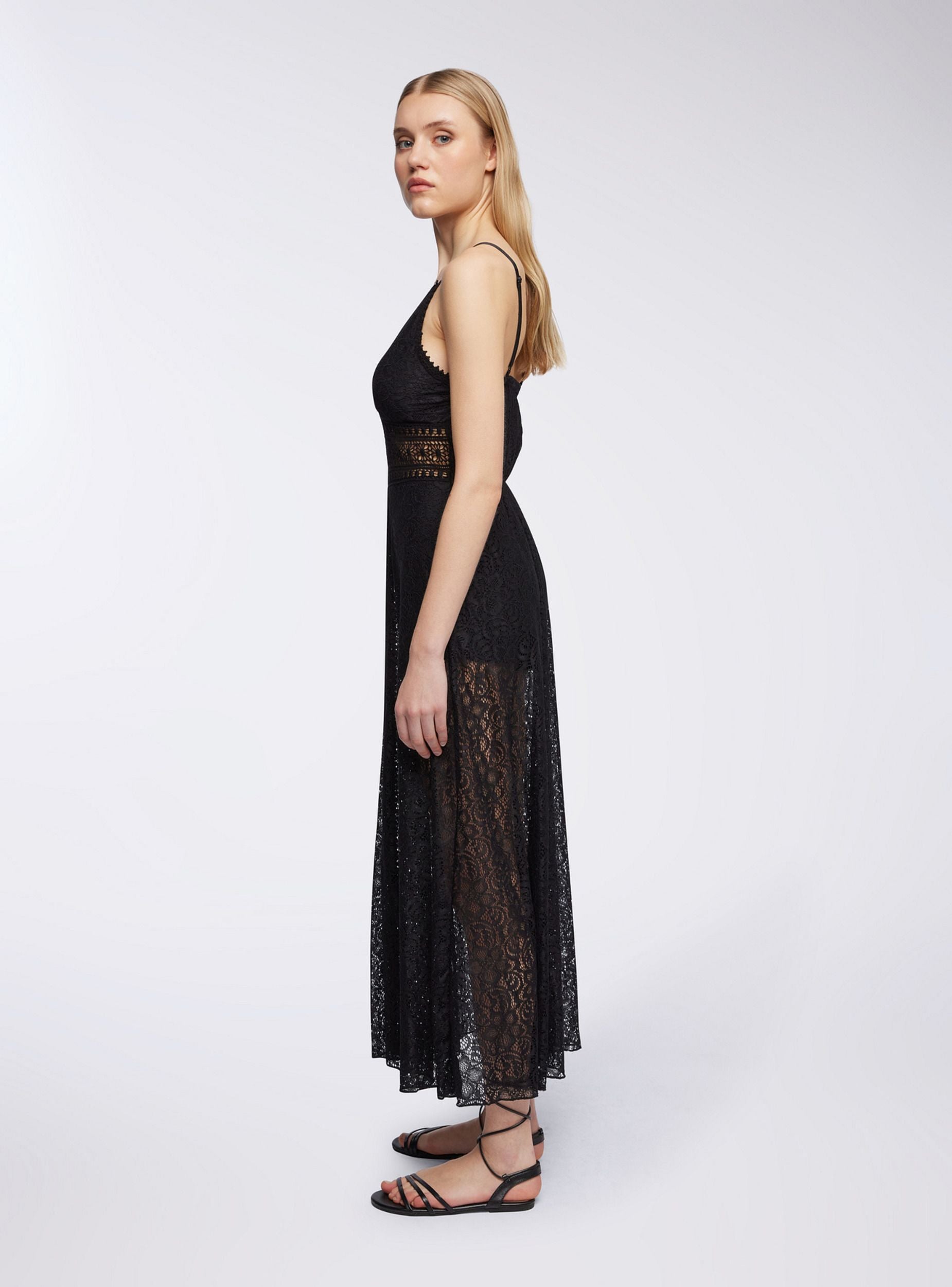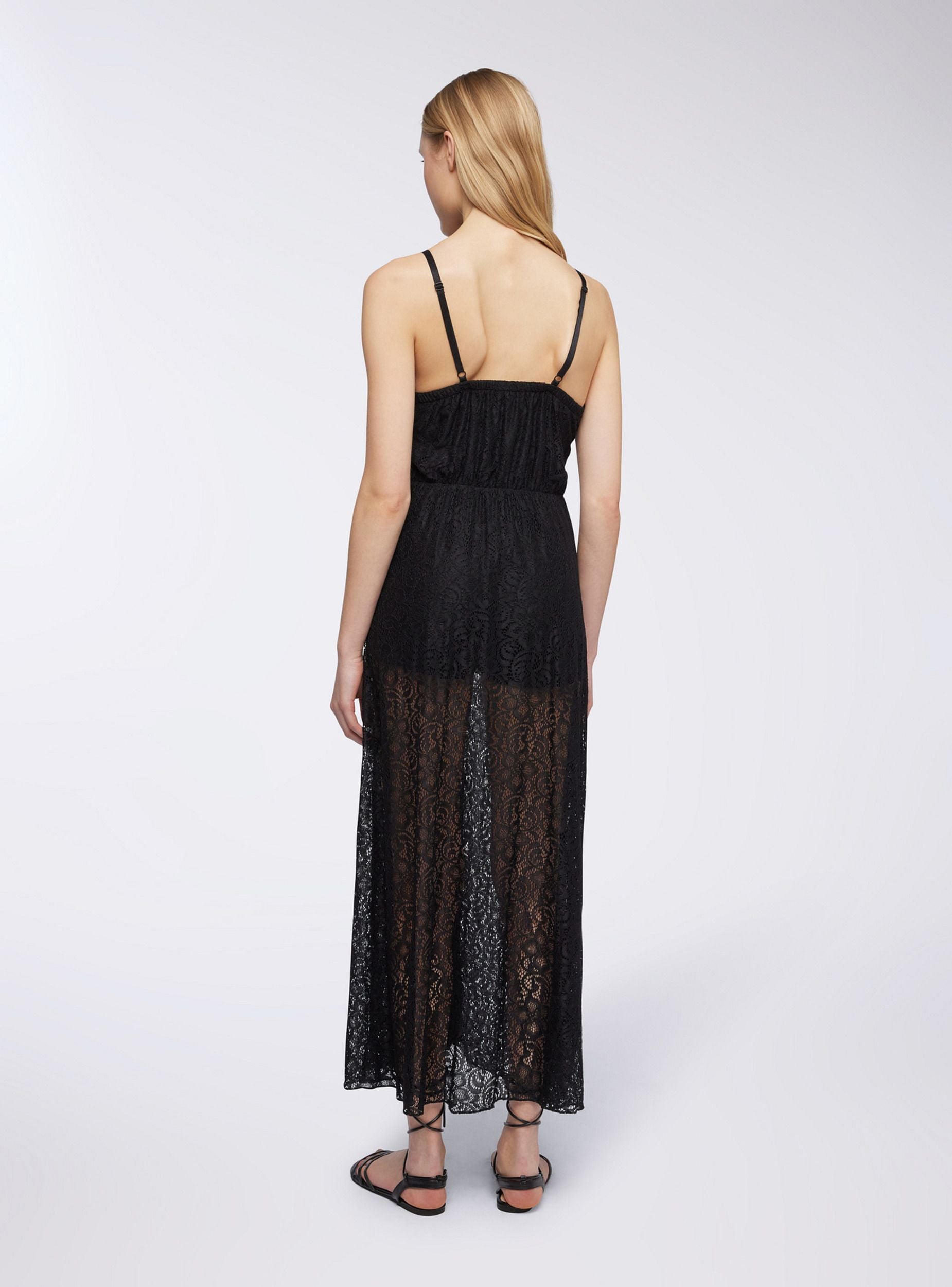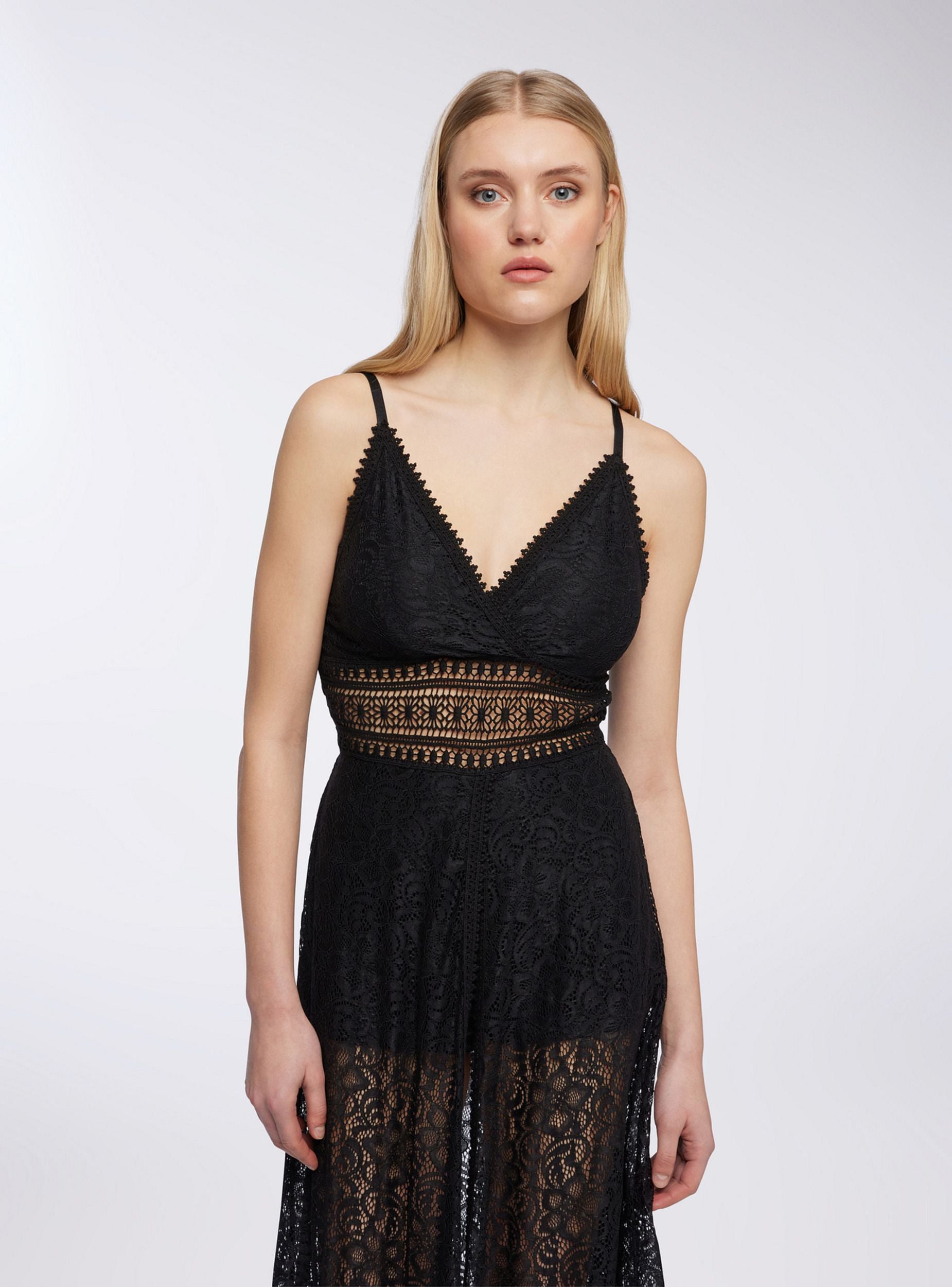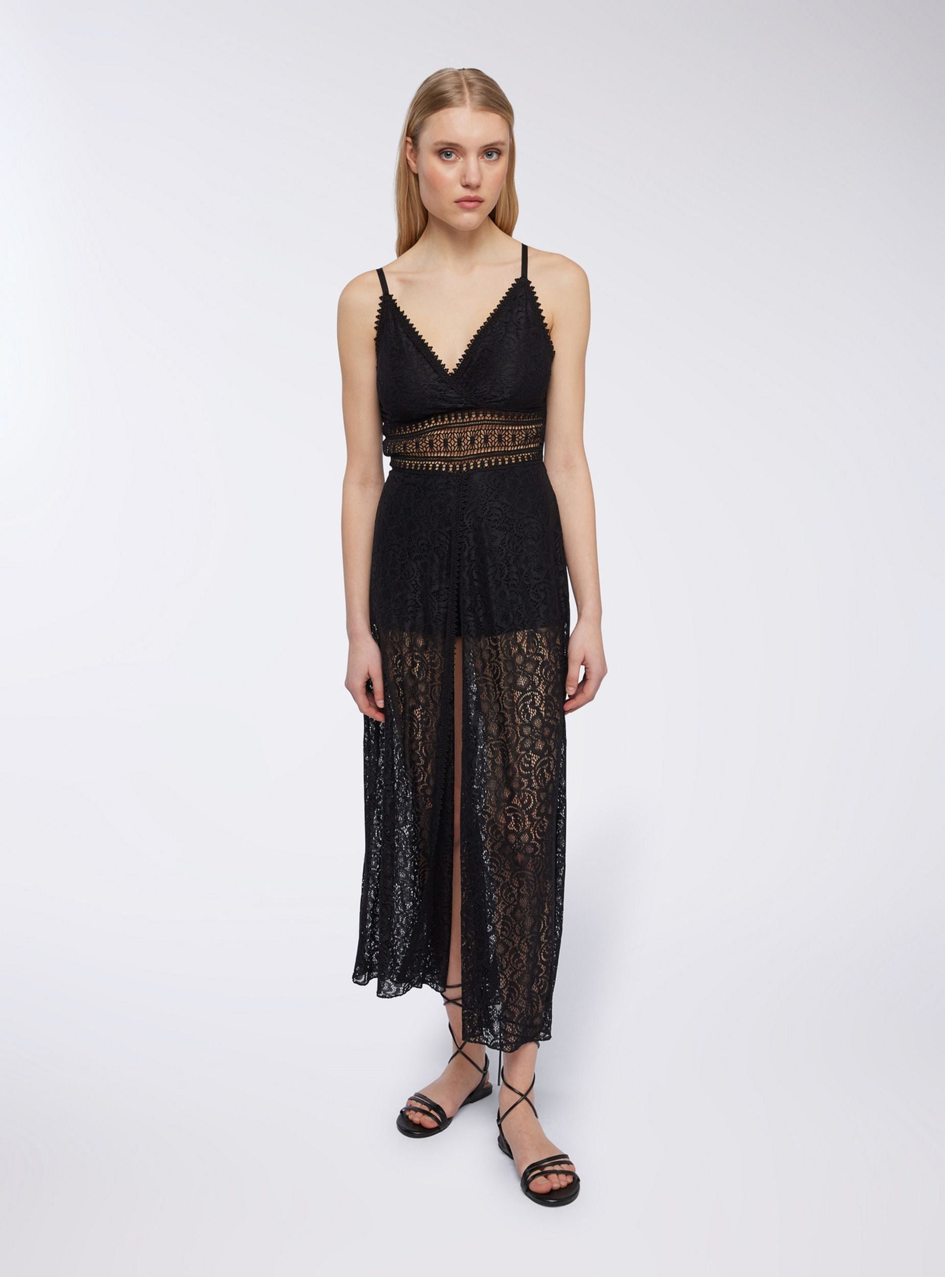 Long and refined women's dress, perfect for an elegant summer look. Made in a solid colour, it features a delicate lace pattern that wraps around the entire length, adding a touch of romanticism. The straps are adjustable to ensure a tailored fit, while the inner shorts provide comfort and practicality without compromising style. The inner cups offer discreet support and a structured effect. A versatile piece, ideal for adding a touch of femininity and glamour to summer evenings.