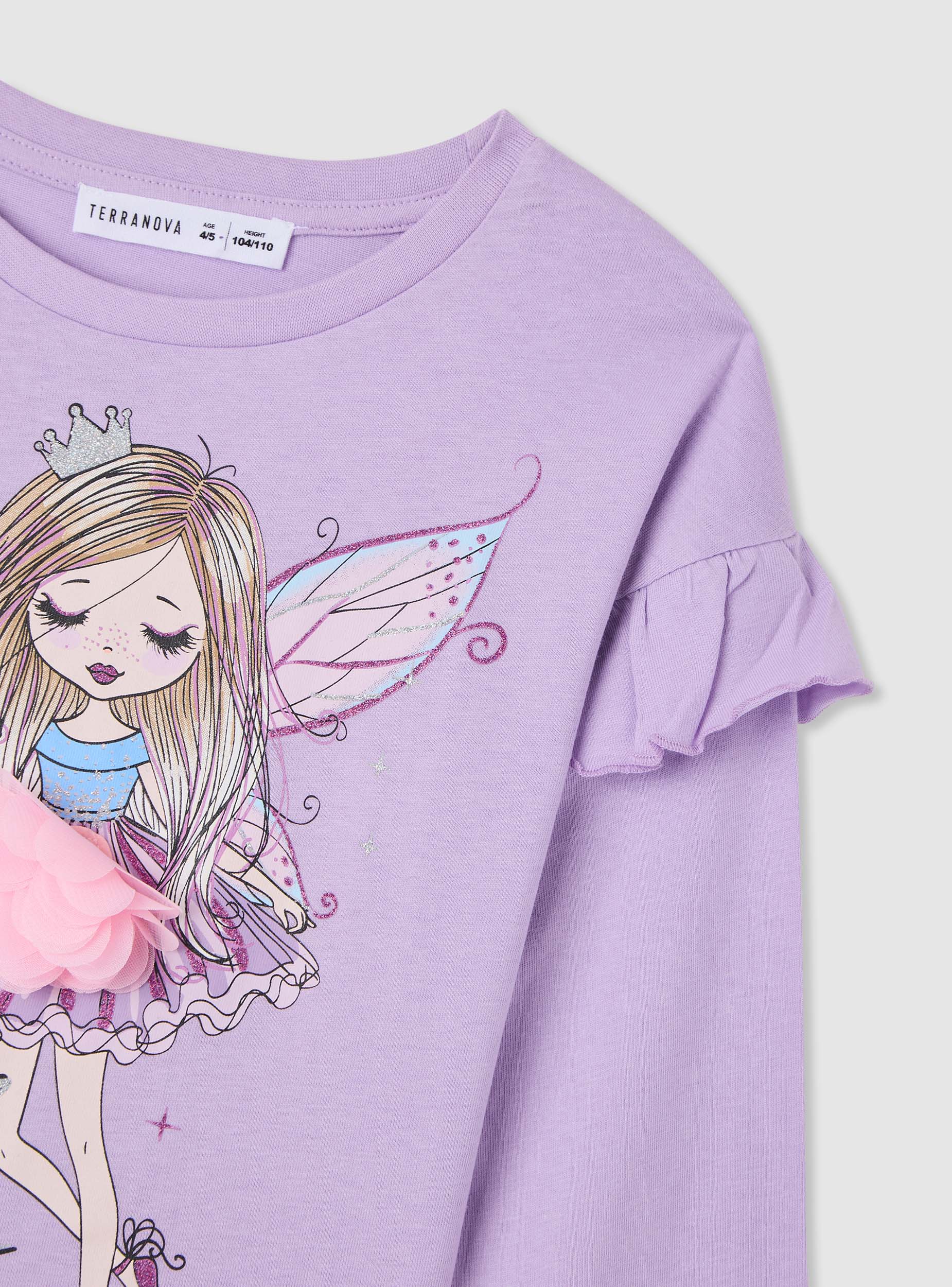 Long-sleeved girl's T-shirt with a round neckline and regular fit. The front features a fairy print with writing and a 3D flower application, ideal for school and leisure time. Gathered shoulders with small ruffles add a romantic touch. Easy to pair with jeans or a skirt with trainers or ballet flats.Details