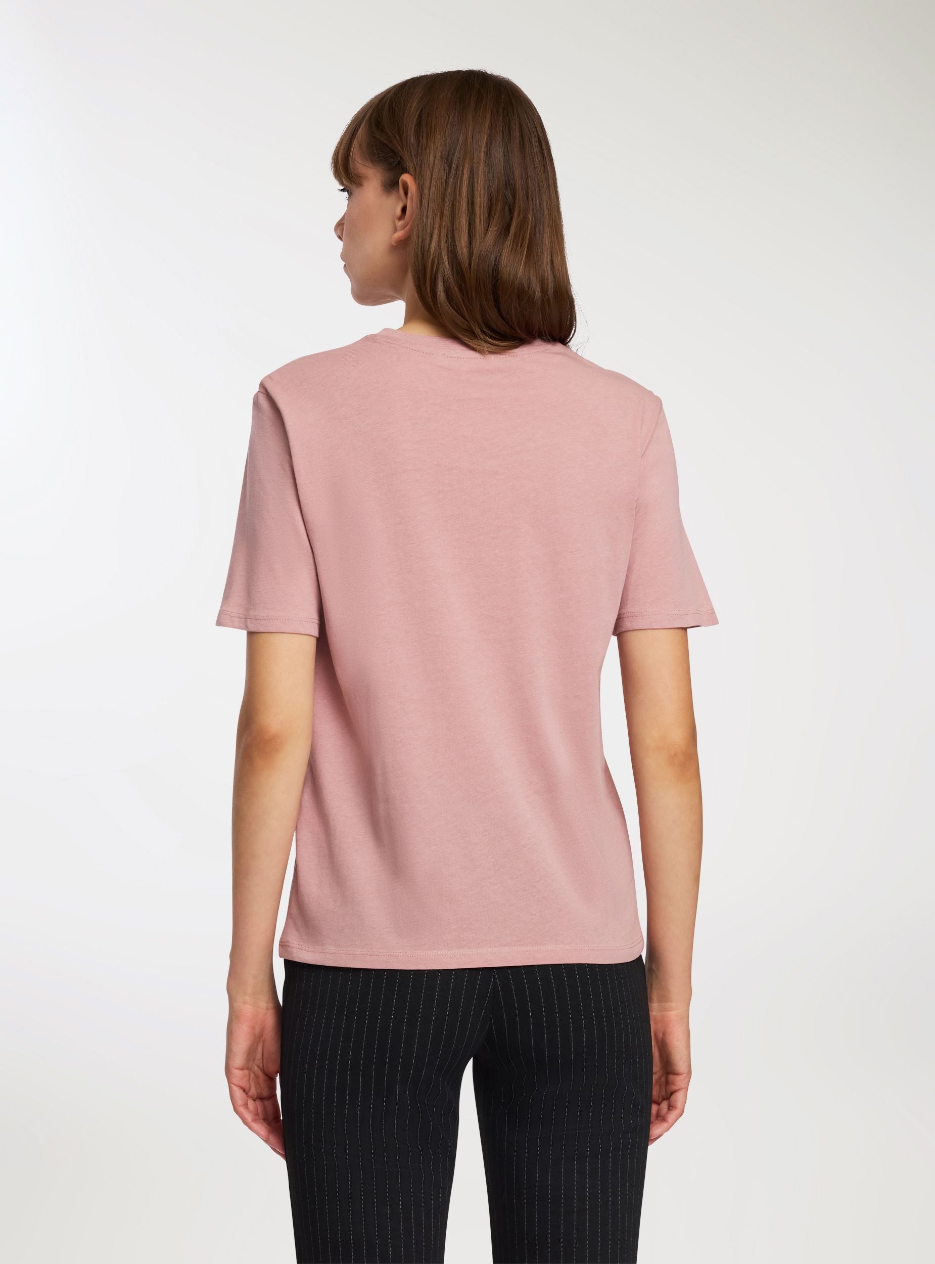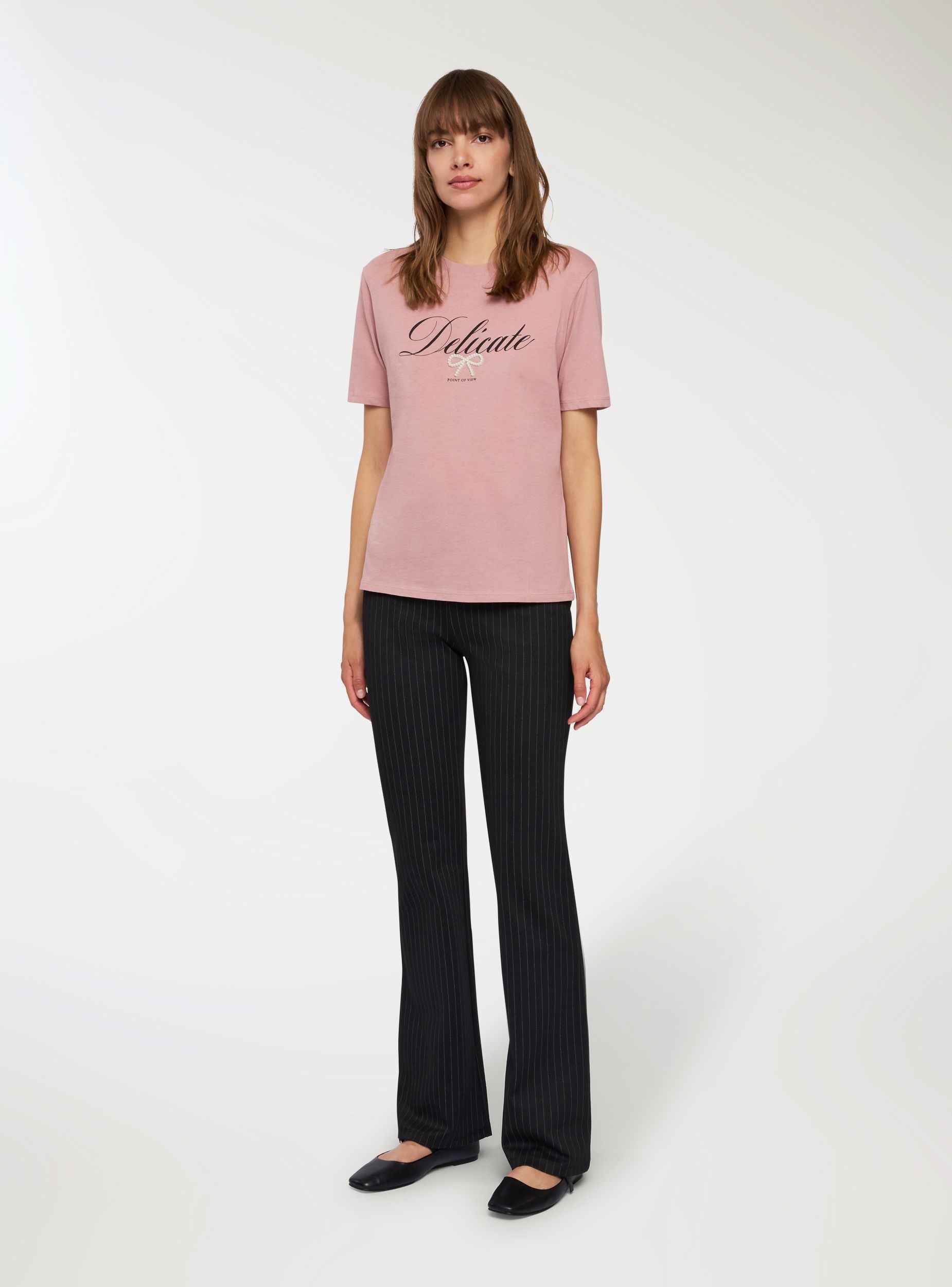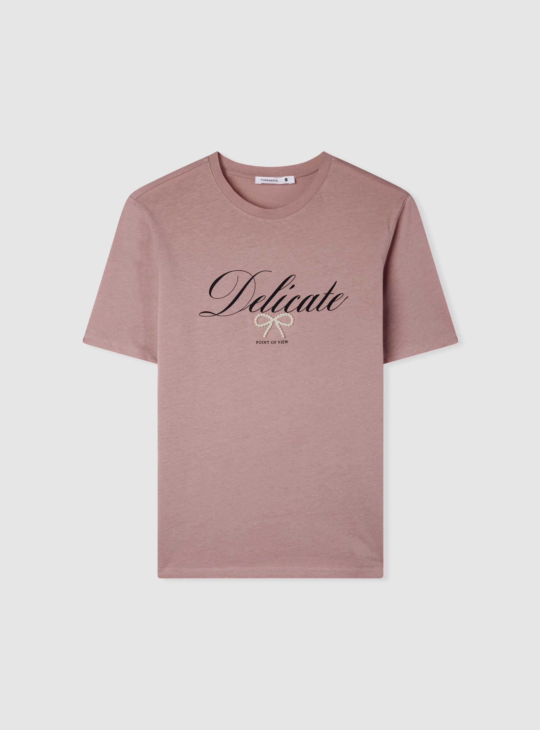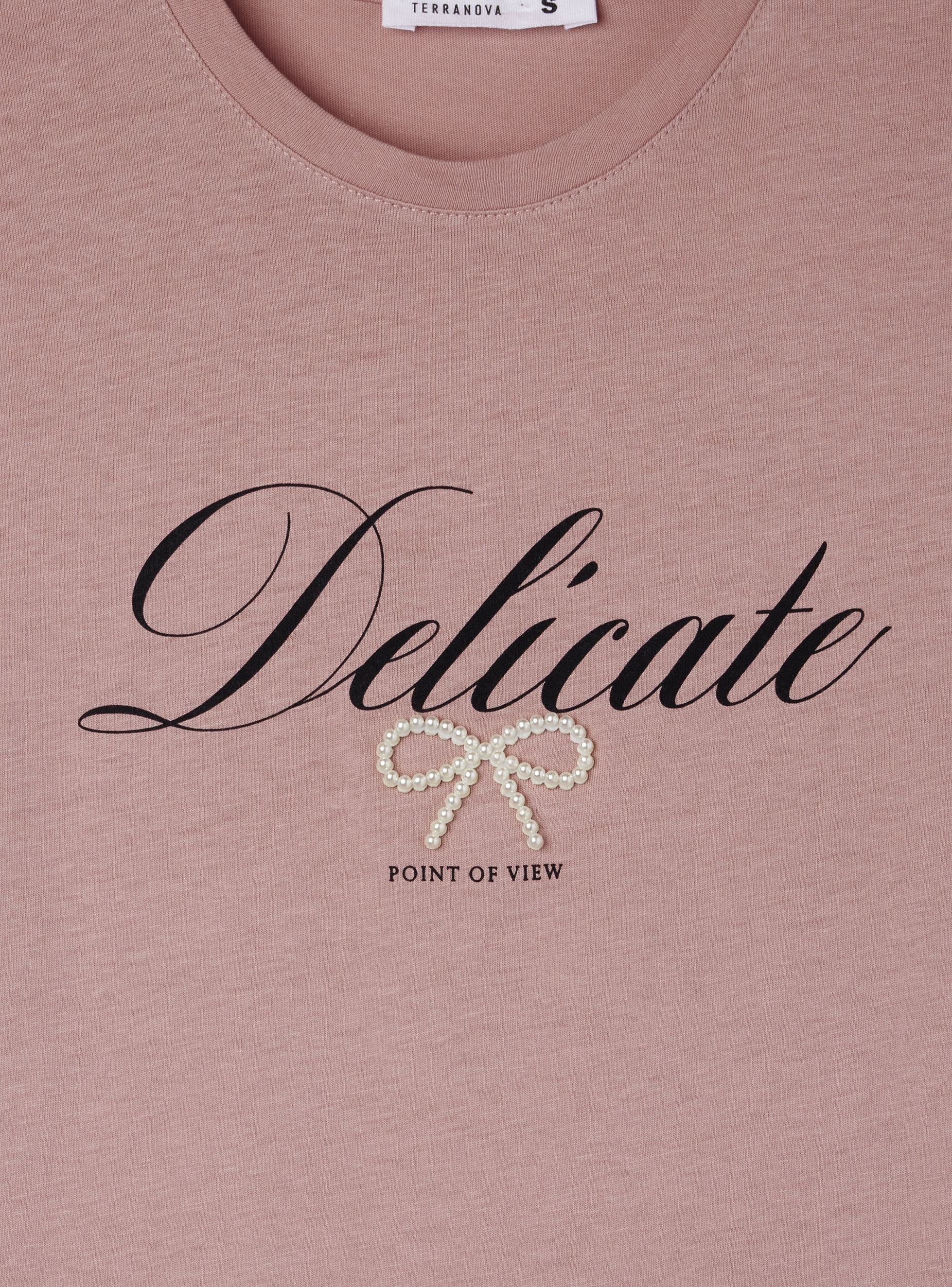 Women's t-shirt with decorative writing, ideal for a casual and fashionable look. Perfect for pairing with jeans or trousers, this t-shirt offers a loose fit that ensures comfort and style. The writing adds a distinctive touch while the bow-shaped applied pearls provide an original detail, making it suitable for leisure time or a casual chic outfit. A versatile piece to enhance your everyday wardrobe.