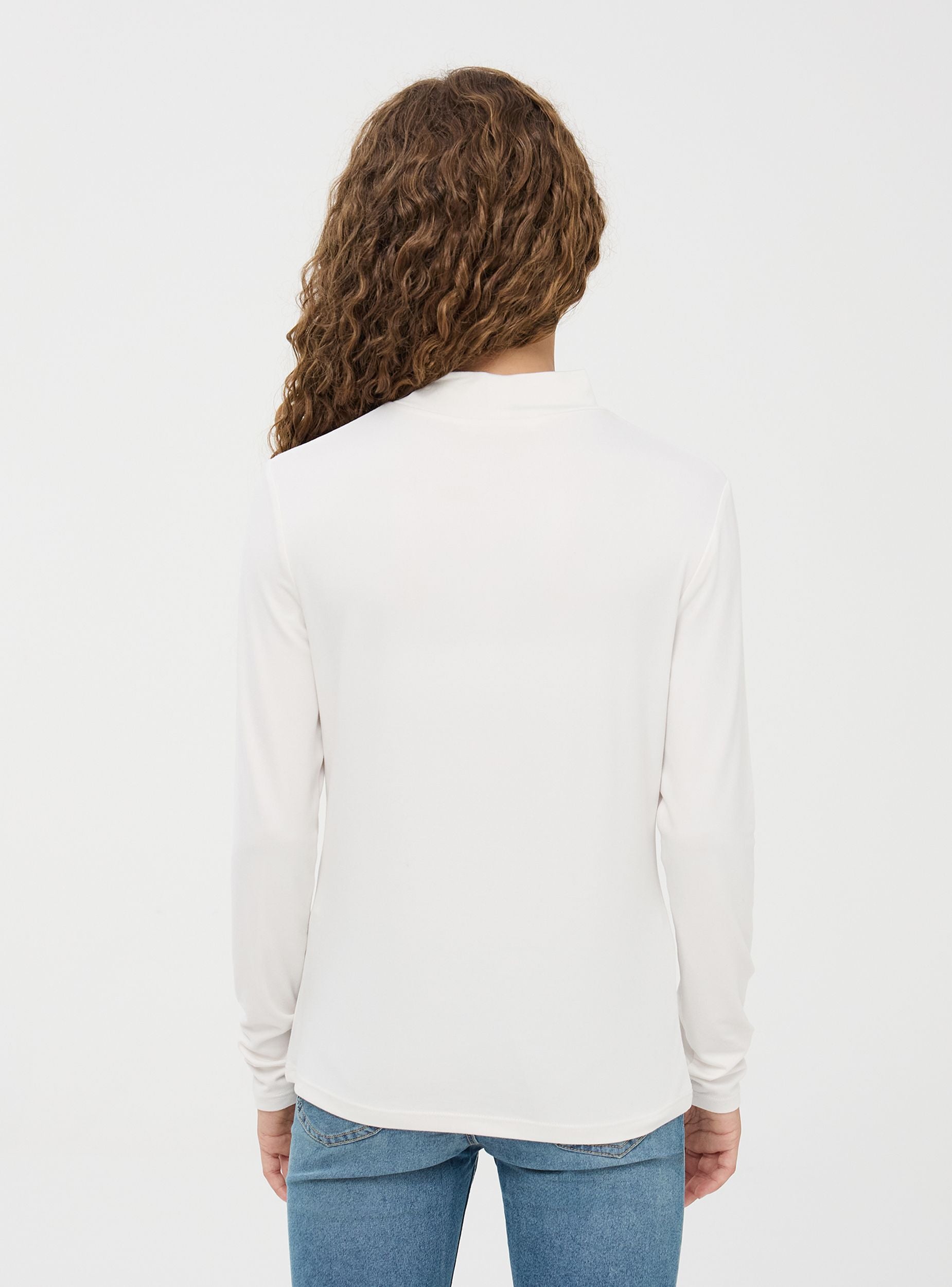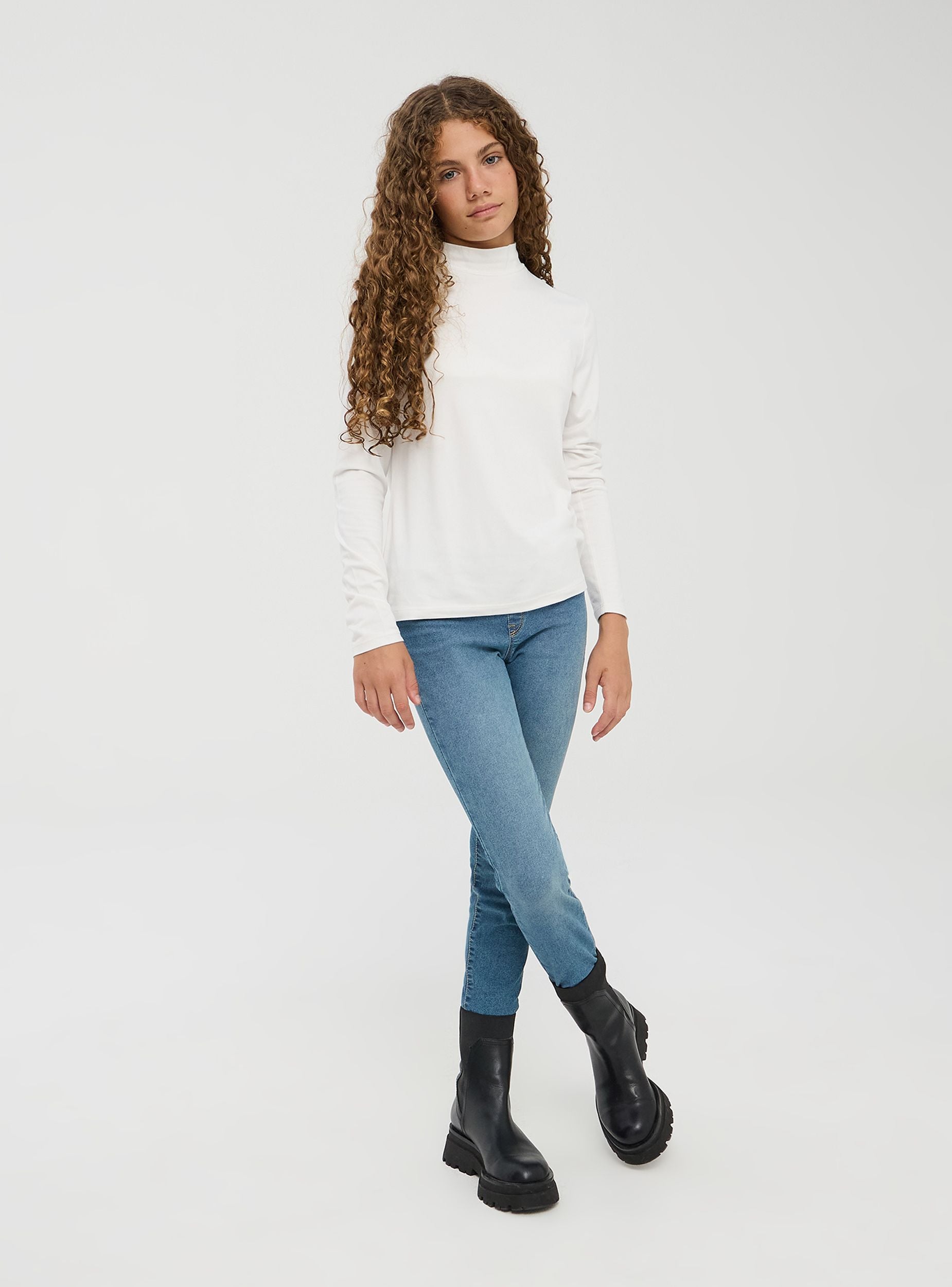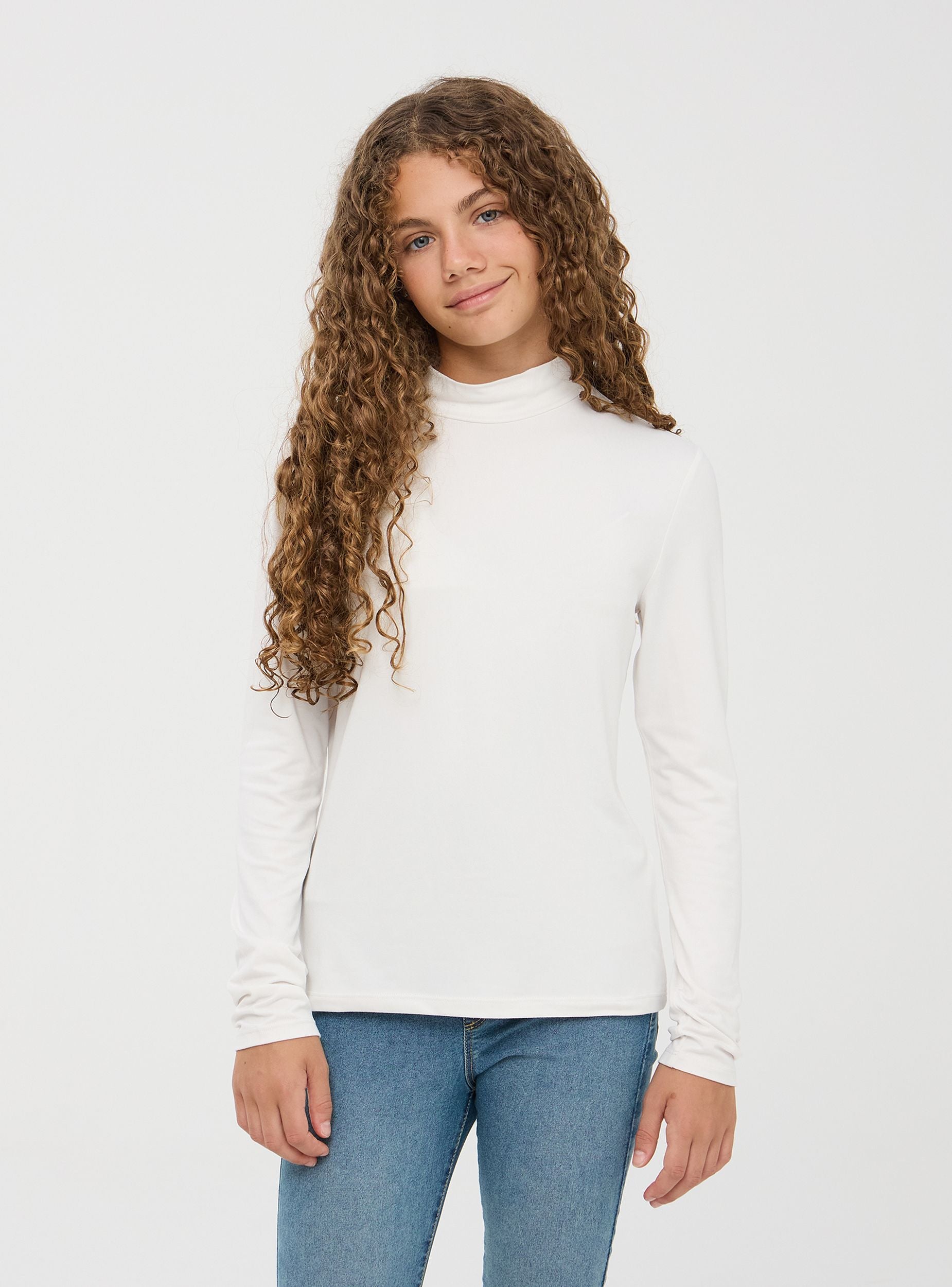 Long-sleeved girls' top with a high collar, featuring a simple and minimalist design. Its comfortable fit and essential cut make it ideal for everyday wear. Perfect for wearing both at school and in leisure time, this top easily pairs with jeans, trousers, or skirts, offering a clean and versatile look. Suitable for cooler days, it guarantees comfort and style on every occasion.Details