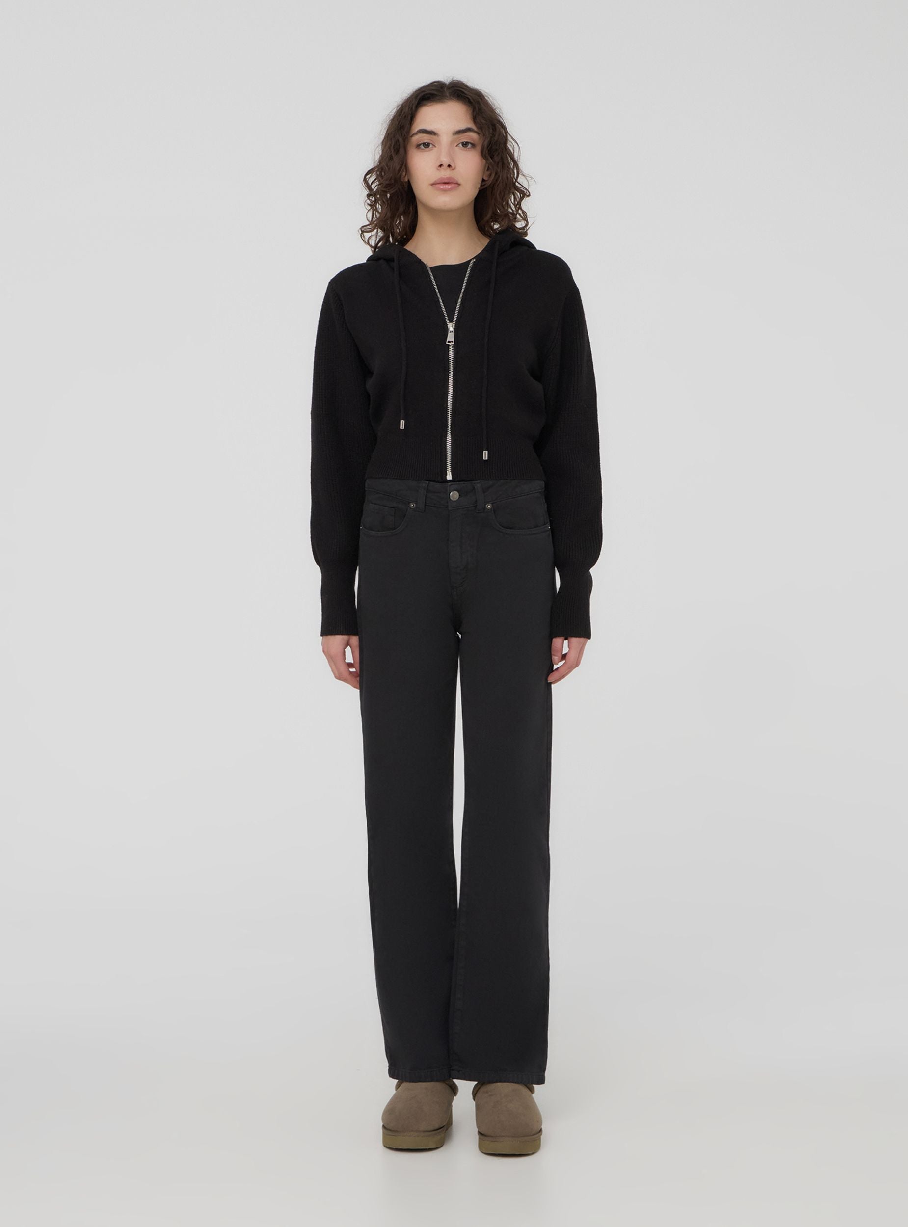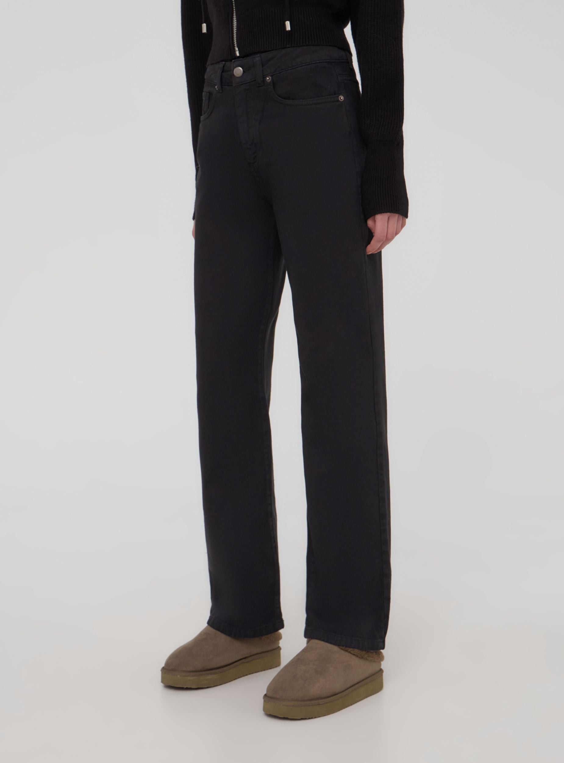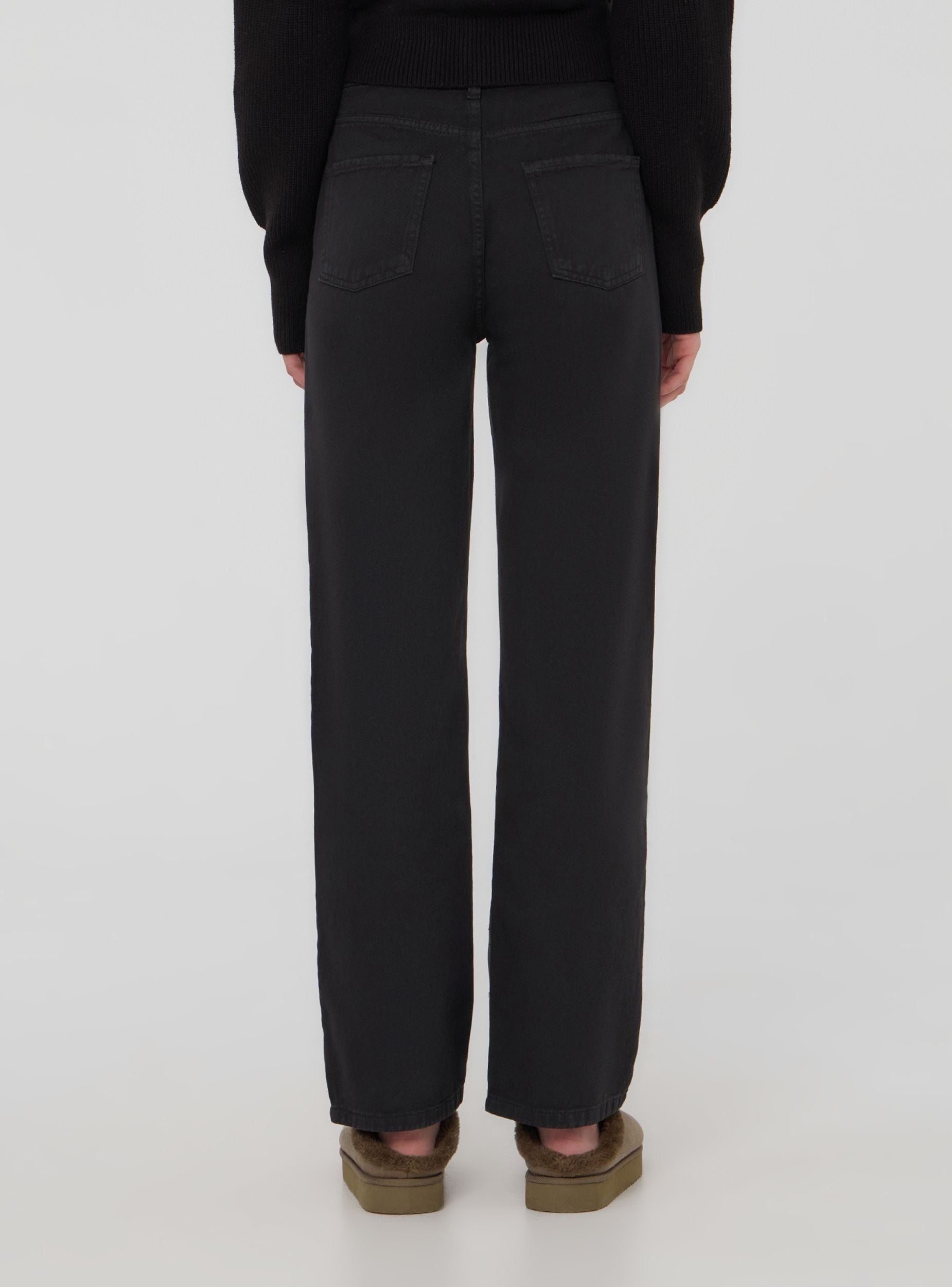 Women's straight-cut trousers, ideal for a casual and versatile look. Made from cotton drill, they offer a robust and comfortable texture. They feature a button closure, practical belt loops for use with belts, and functional pockets. The solid colour makes them perfect for pairing with various style combinations, ensuring a flawless outfit every time.