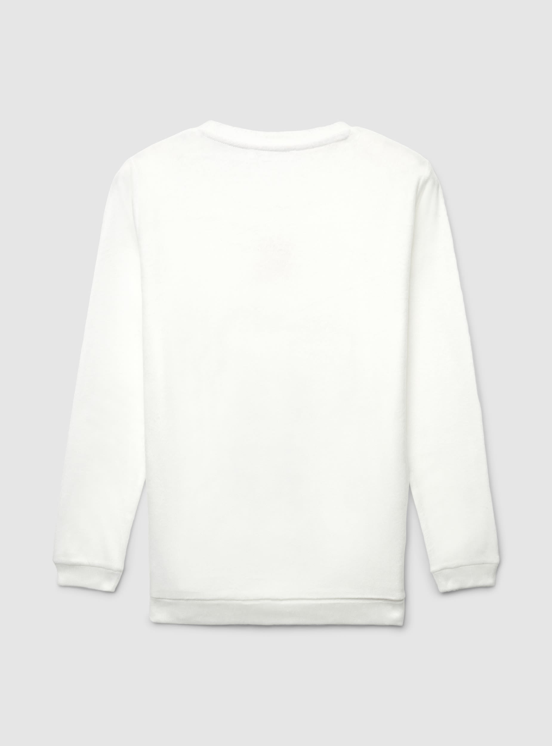 Women's pajama set with long-sleeved top and round neckline, adorned with the phrase "Free Hugs" and raised teddy bear appliqués, and long striped trousers. Comfortable fit, perfect for relaxing evenings and weekends at home. Ideal with non-slip socks or a dressing gown for a cosy look.