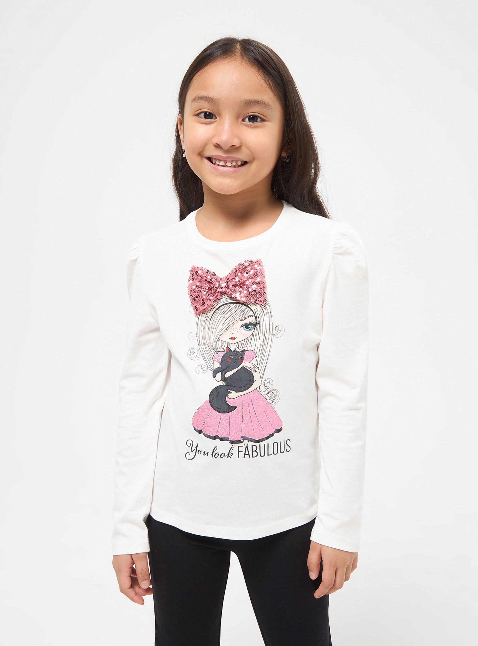 T-shirt da bambina a manica lunga. Modello girocollo in tinta unita e stampa con dettagli glitter e paillettes. Vestibilità regular.