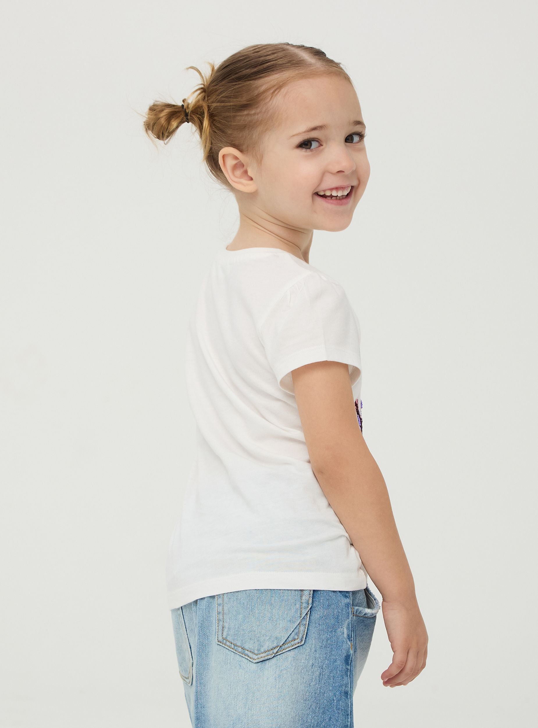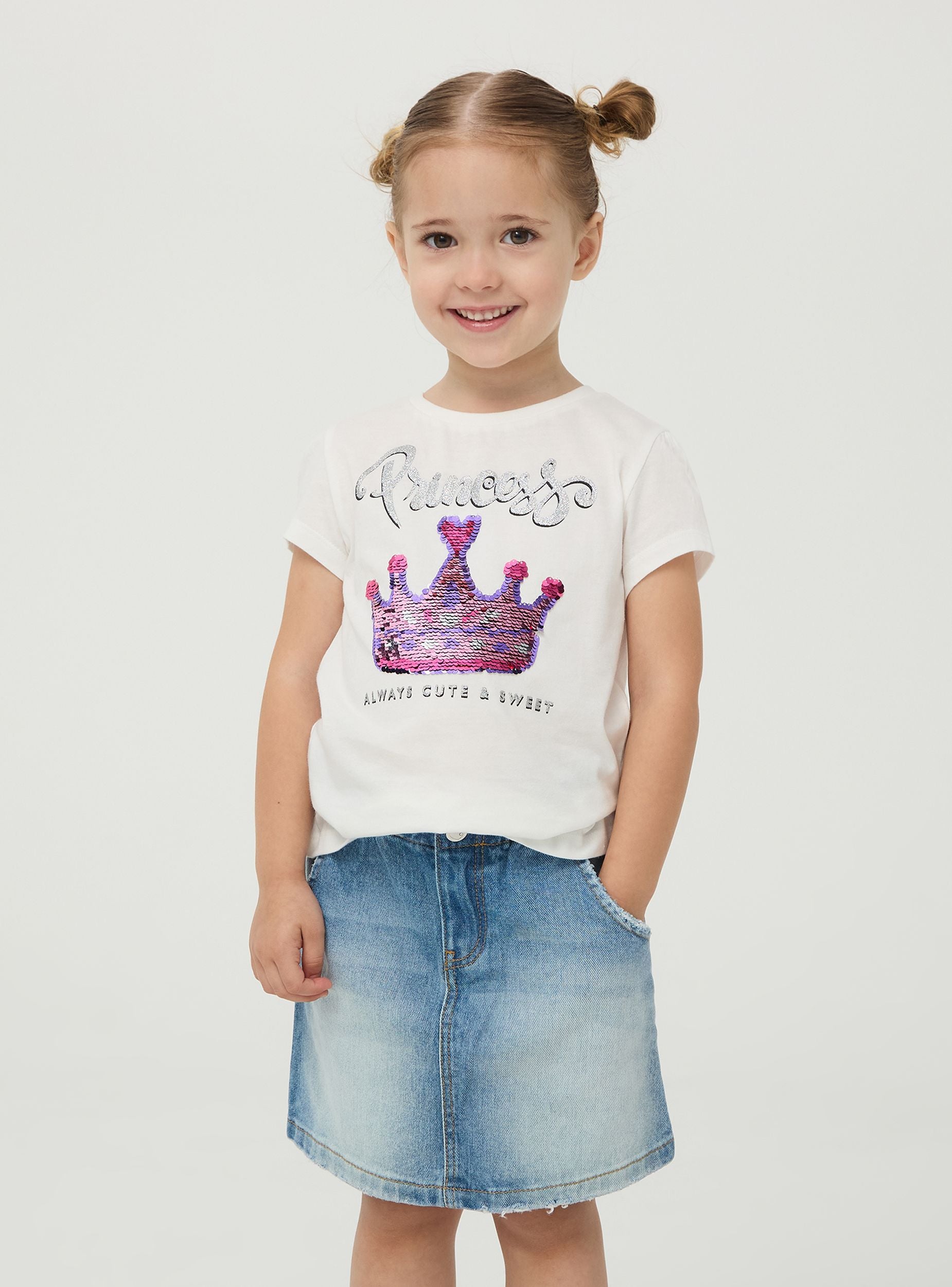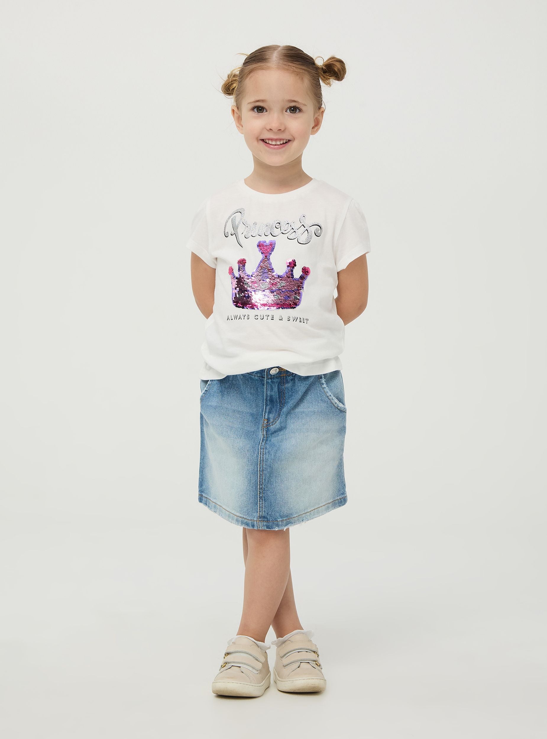 Girl's t-shirt in cotton jersey with crown print and sequins. Round neck model with short sleeves. Casual piece perfect for everyday looks. Regular fit.