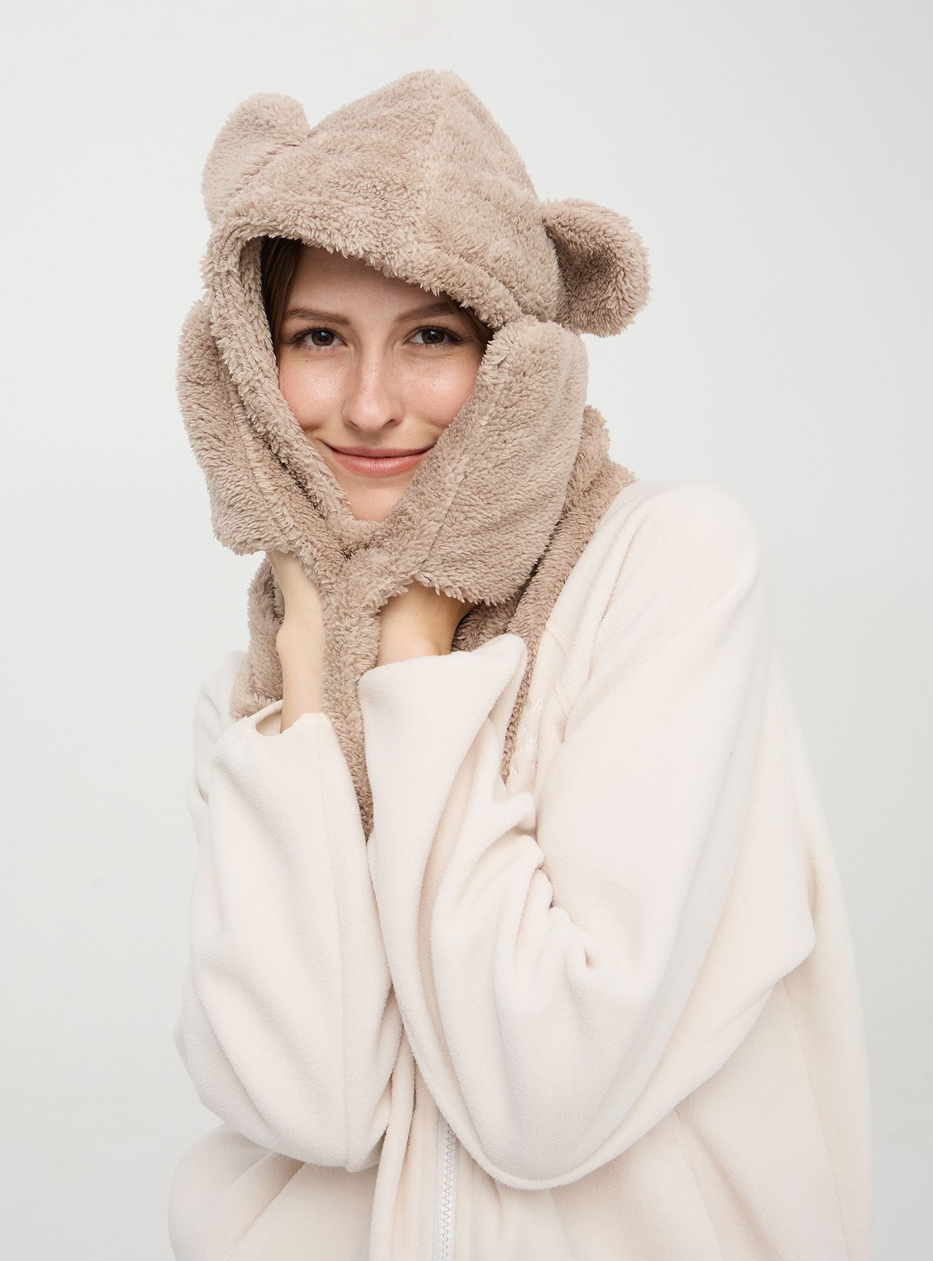 Women's sherpa bear hat that combines a comfortable integrated scarf. The hat features 3D applied ears. The scarf is long and wraps around the neck to provide extra protection from the cold. The design is intended to keep you warm and safe during cold days, adding a playful and fun touch to the winter wardrobe.Details