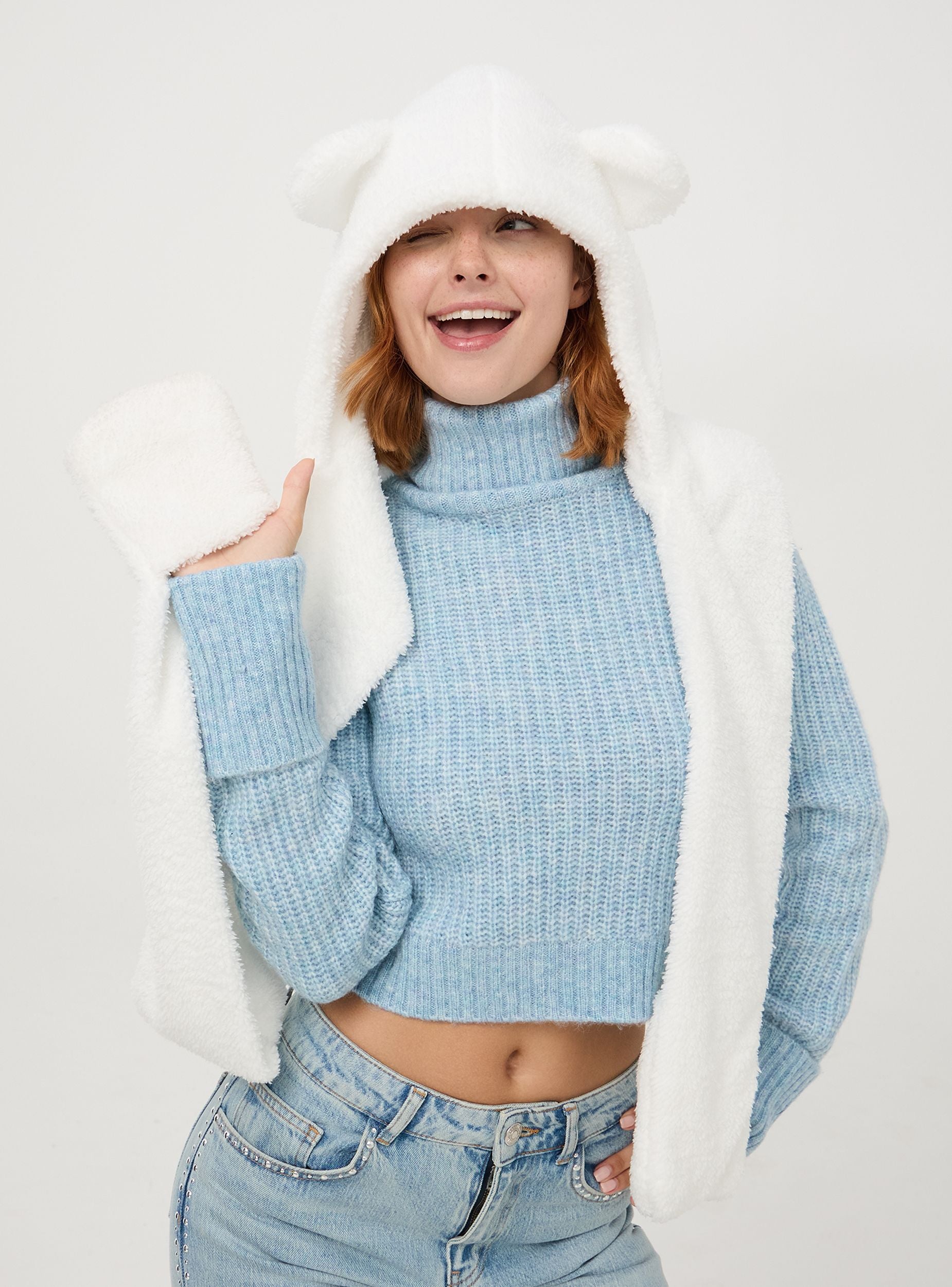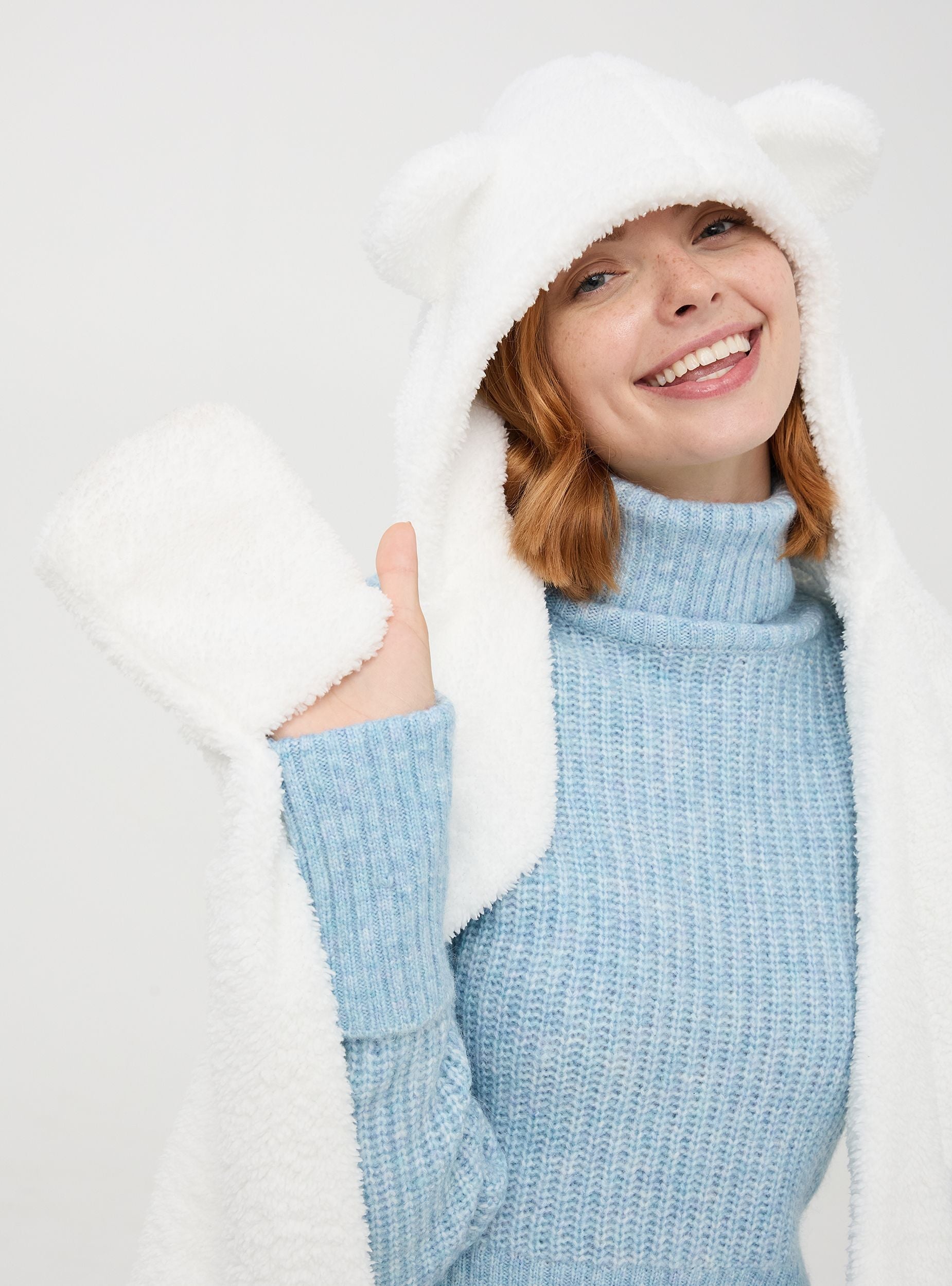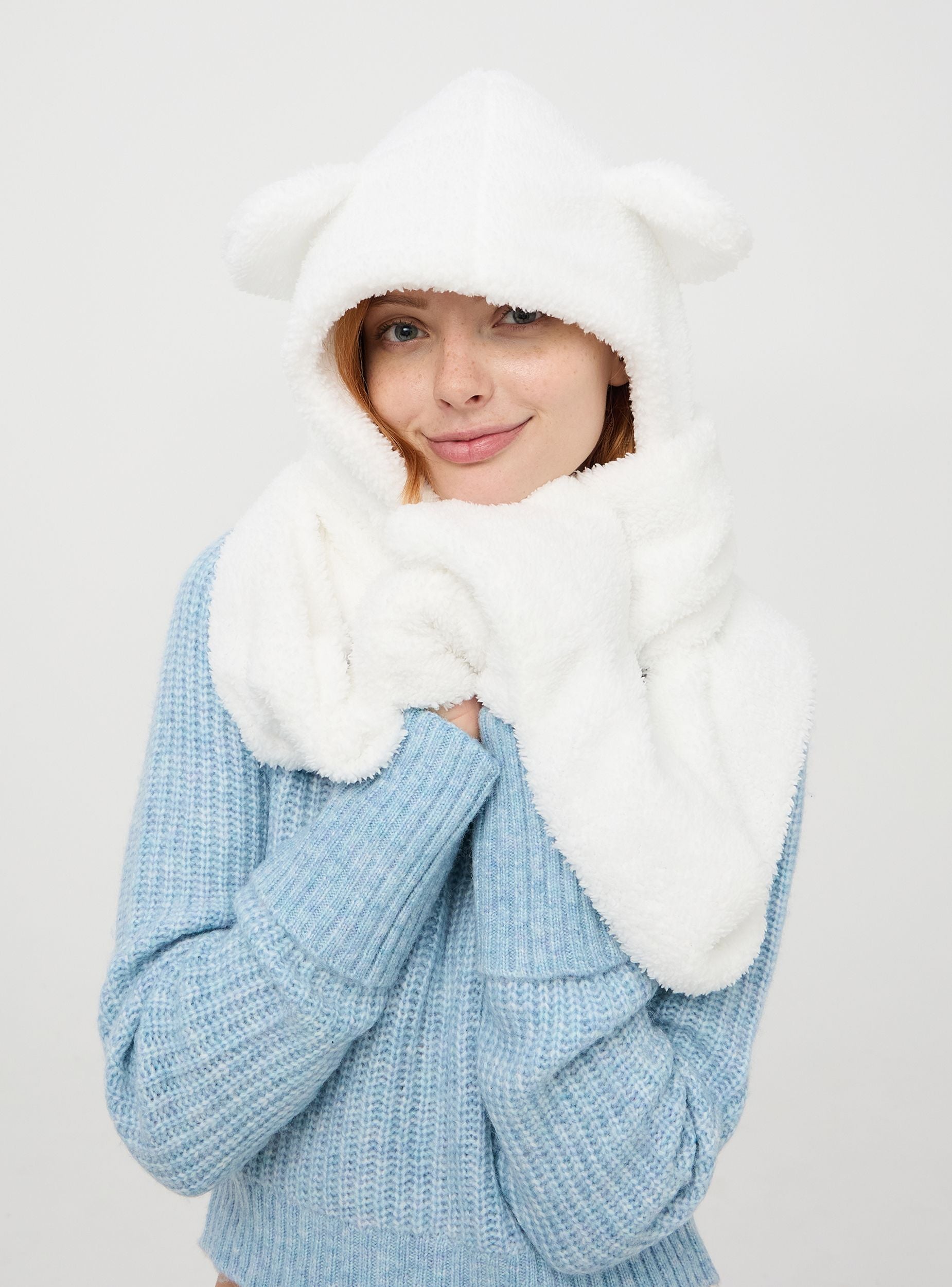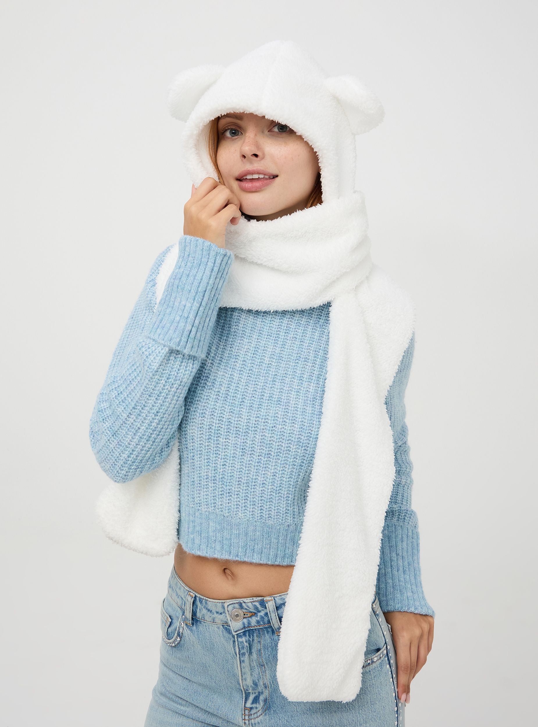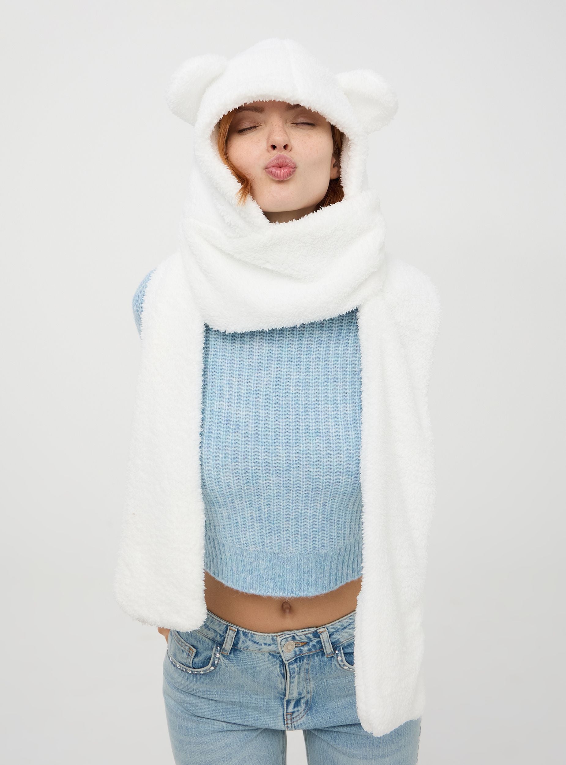 Women's sherpa bear hat that combines a comfortable integrated scarf. The hat features 3D applied ears. The scarf is long and wraps around the neck to provide extra protection from the cold. The design is intended to keep you warm and safe during cold days, adding a playful and fun touch to the winter wardrobe.Details