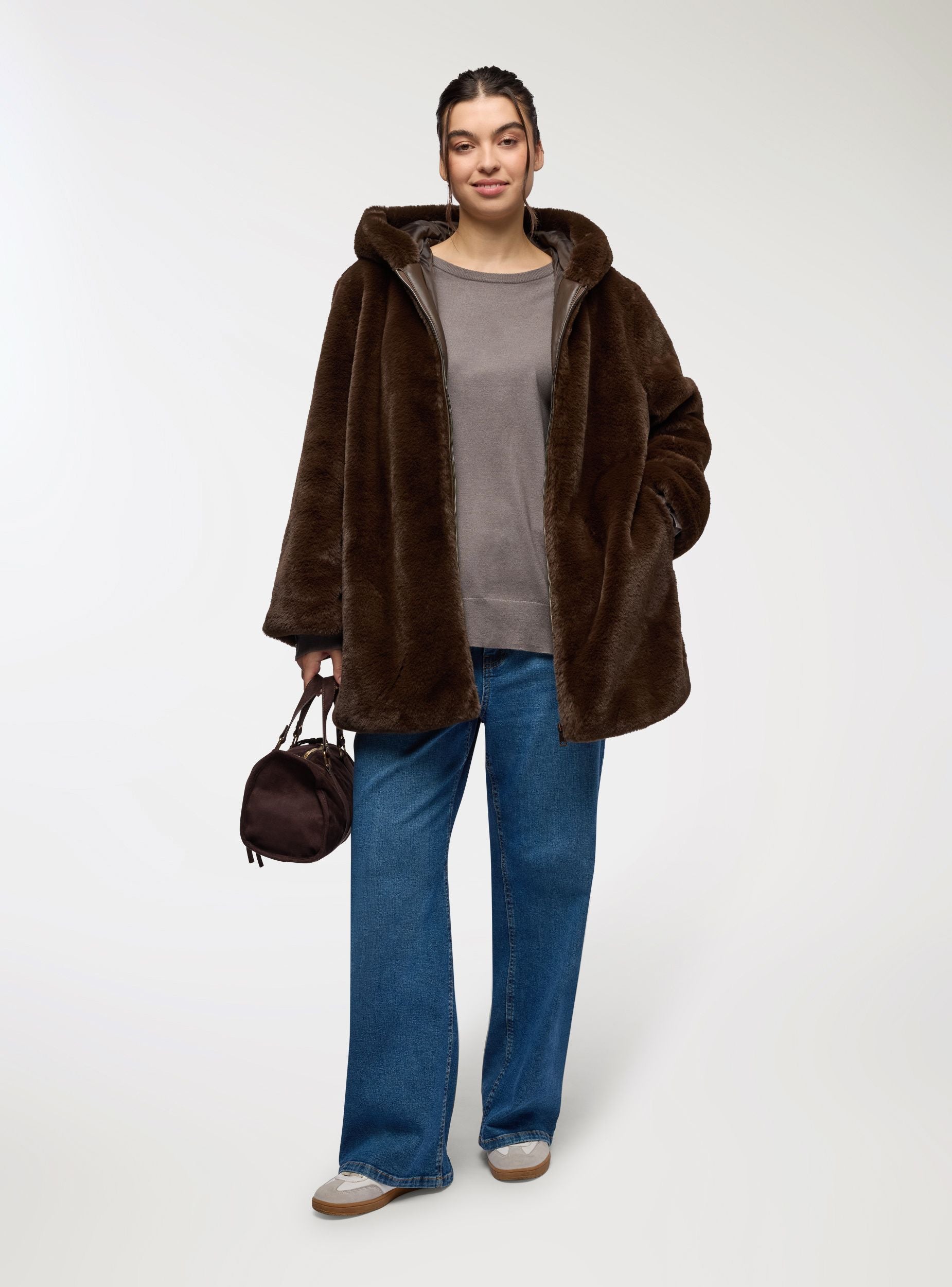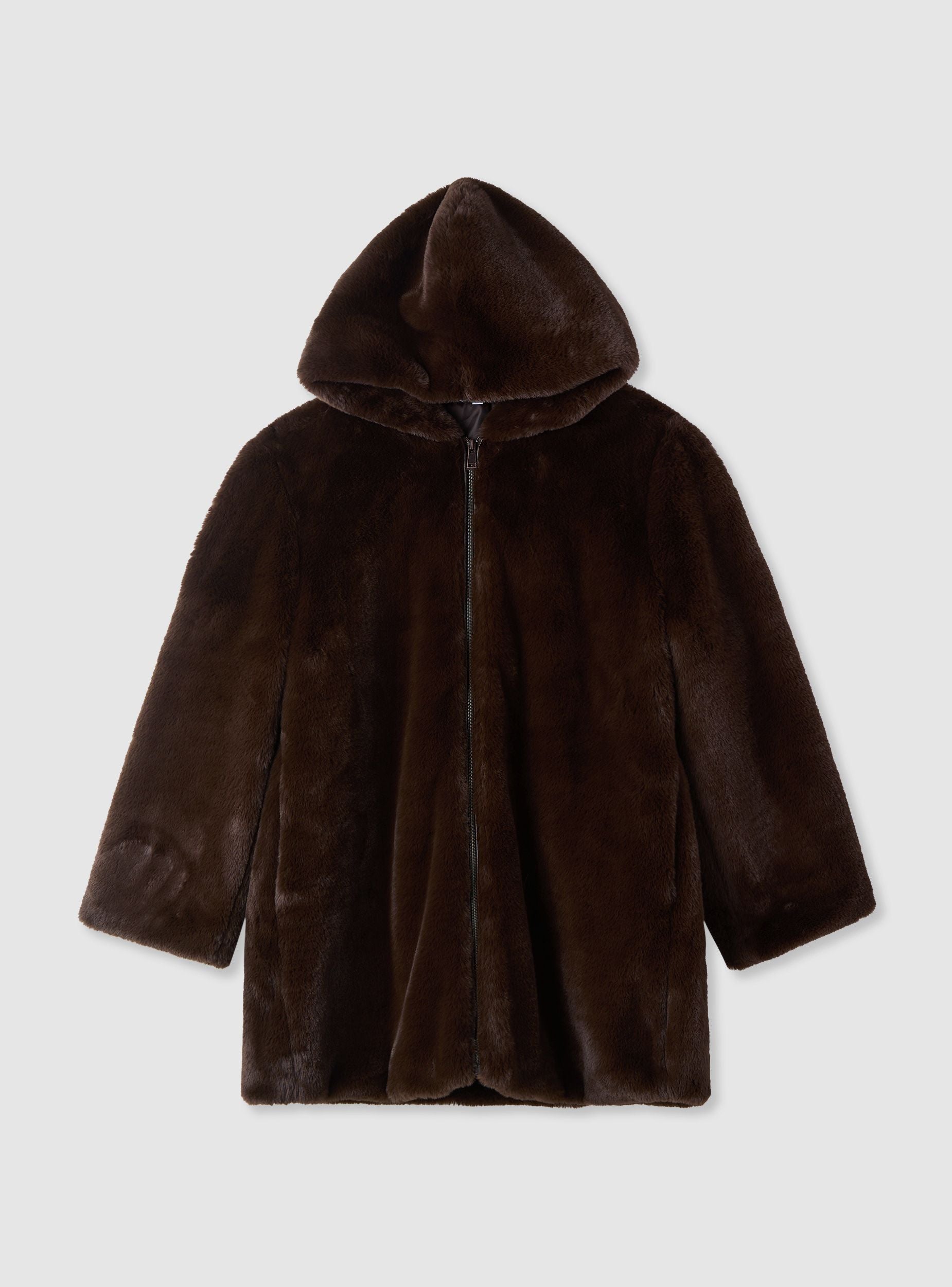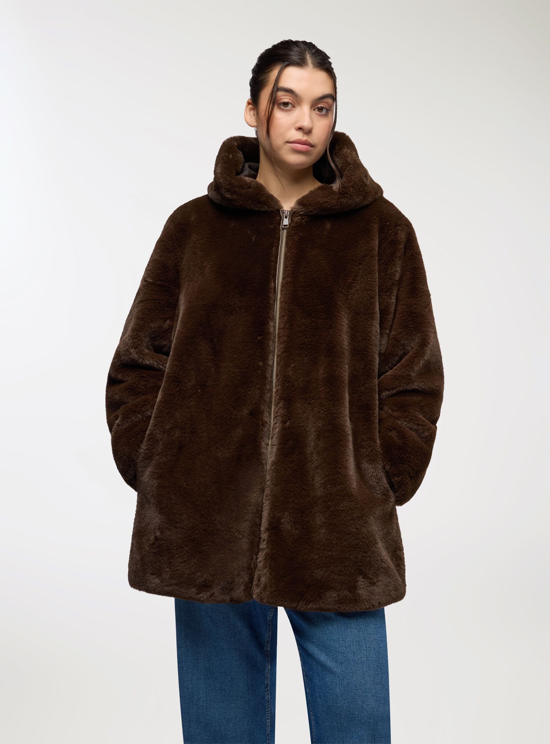 Women's coat in faux fur with a hood, ideal for facing cold days in style. The zip closure ensures practicality, while the hooded design offers protection from the wind. Perfect for casual and urban combinations, it stands out for its versatility and comfort. An essential piece for the winter wardrobe.