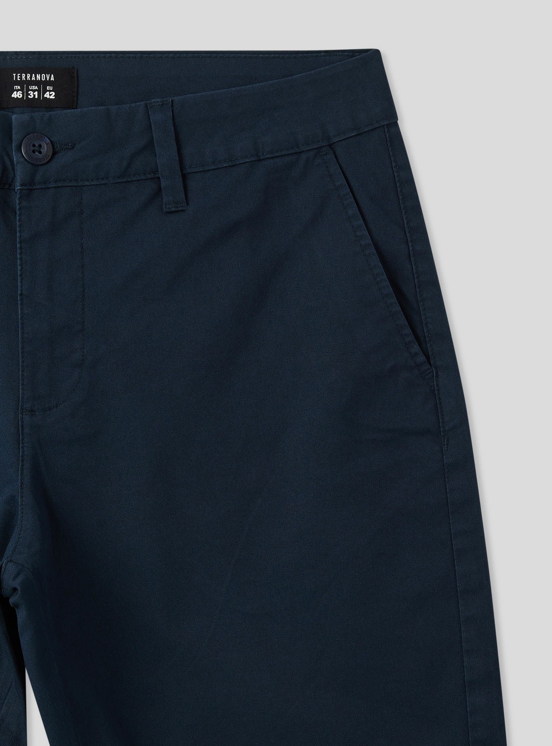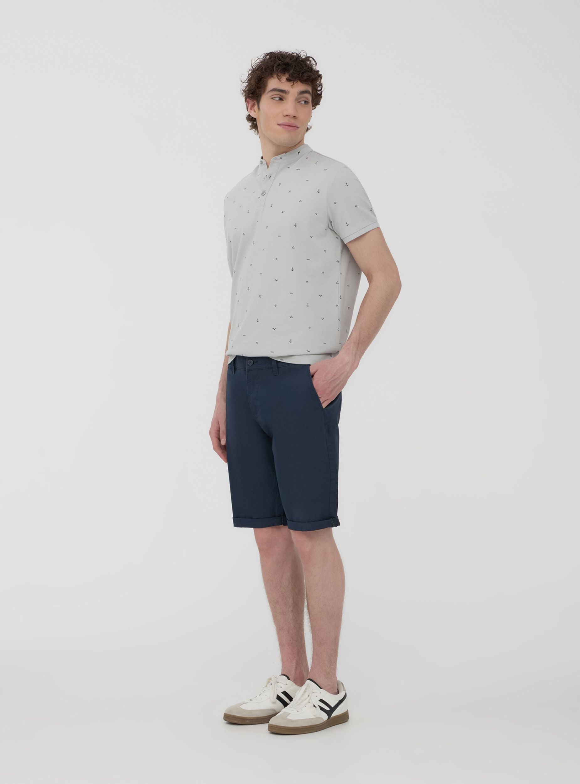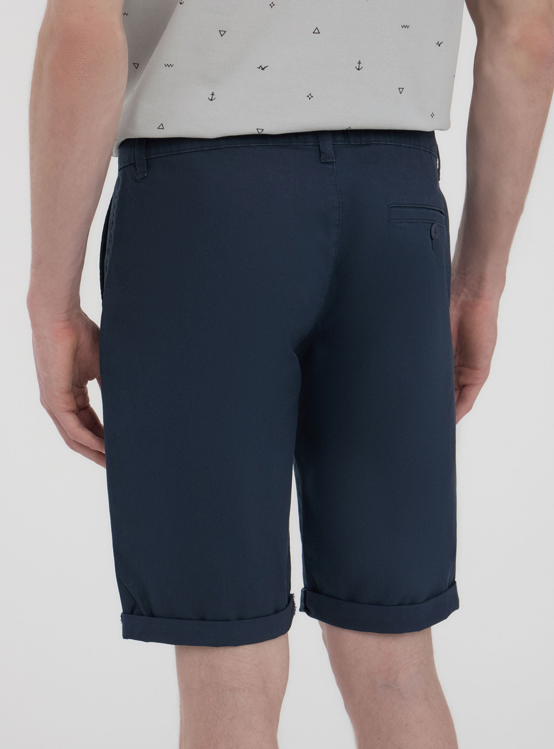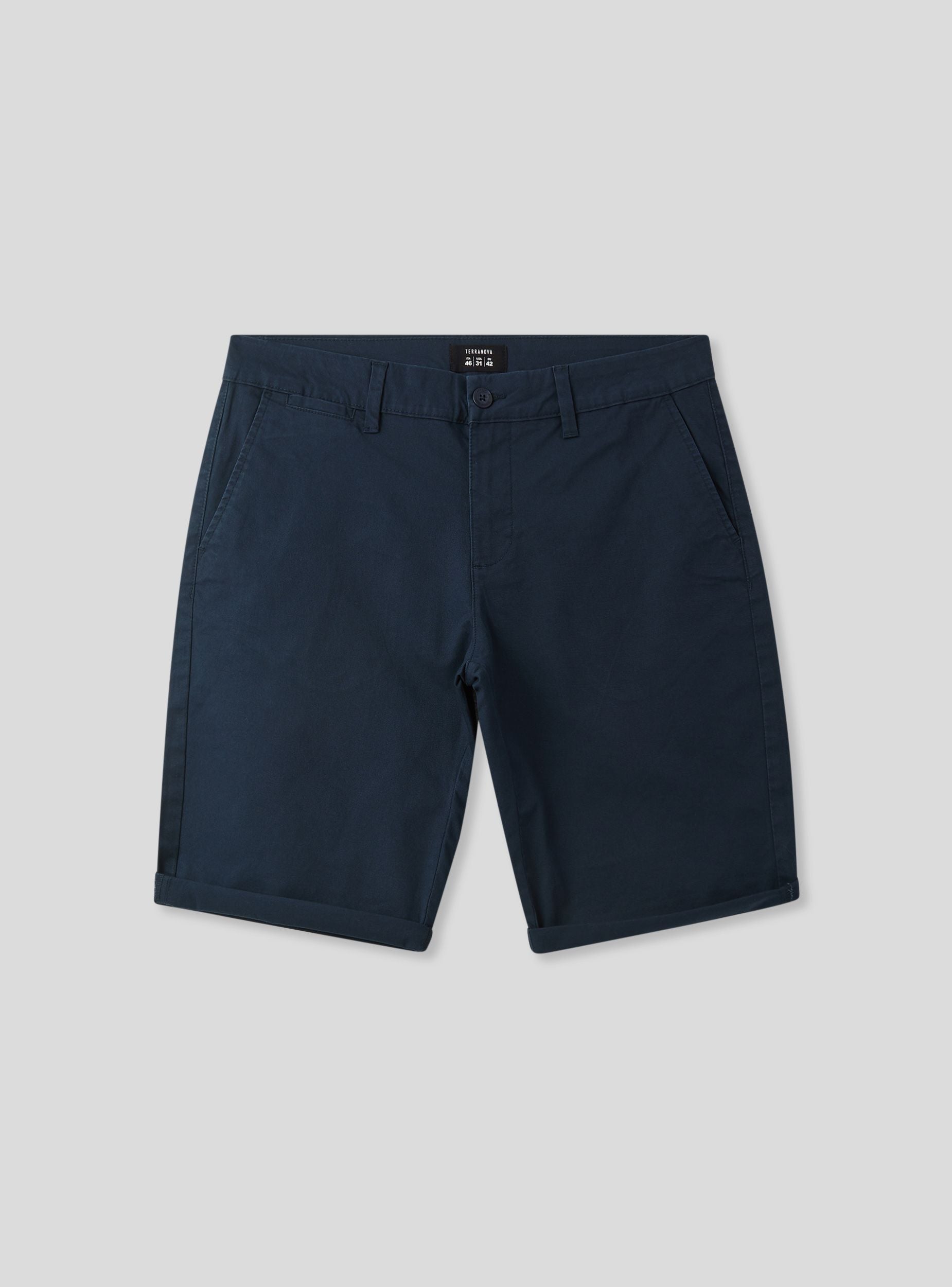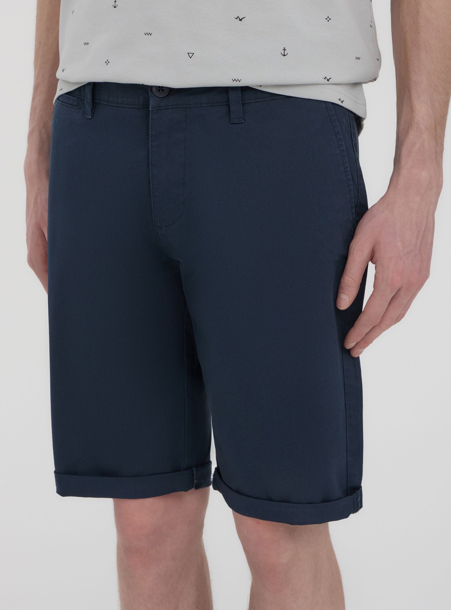 Men's solid-colour shorts with a chino design, perfect for a casual yet polished look. Featuring practical side pockets, they offer ample space for storing small items. The front closure is with a button and zip. Ideal for wearing on warm days, these shorts combine practicality and style, adapting to various informal occasions. The minimalist design makes them versatile for different outfits.Details