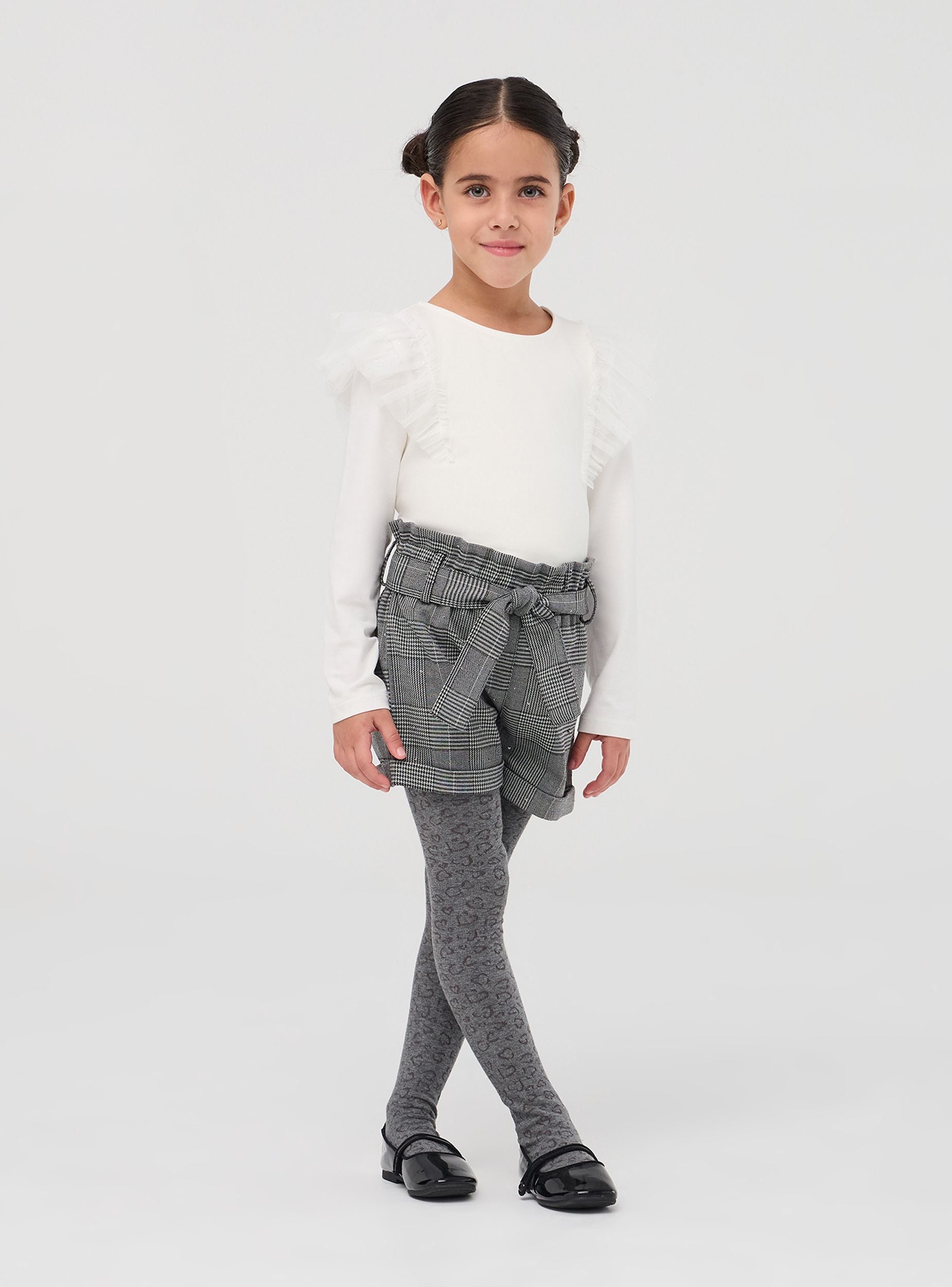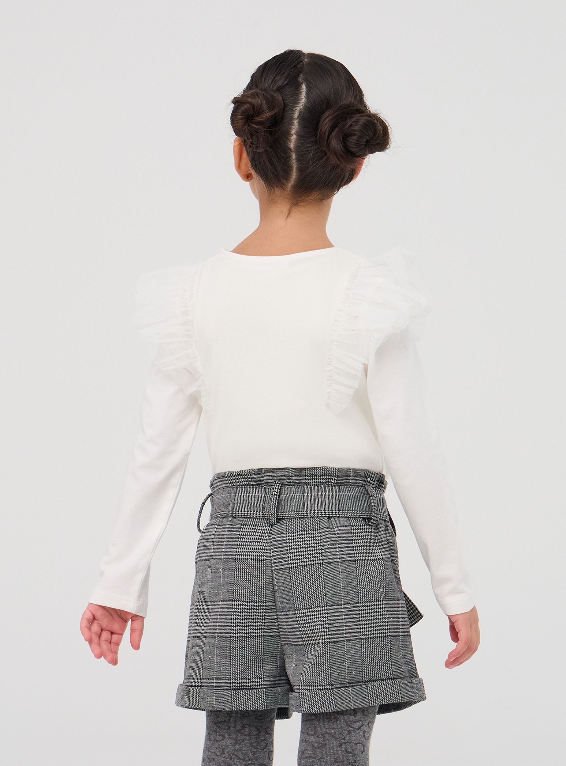 Long-sleeved girls' top with a round neck, enriched with voluminous tulle ruffles on the shoulders that add a touch of elegance and femininity to the design. The fit is comfortable, perfect for everyday activities. Ideal for special occasions such as parties, birthdays, or school events, this top can be paired with skirts, smart trousers or leggings to create a refined and fashionable look, while always maintaining the necessary comfort for little ones.