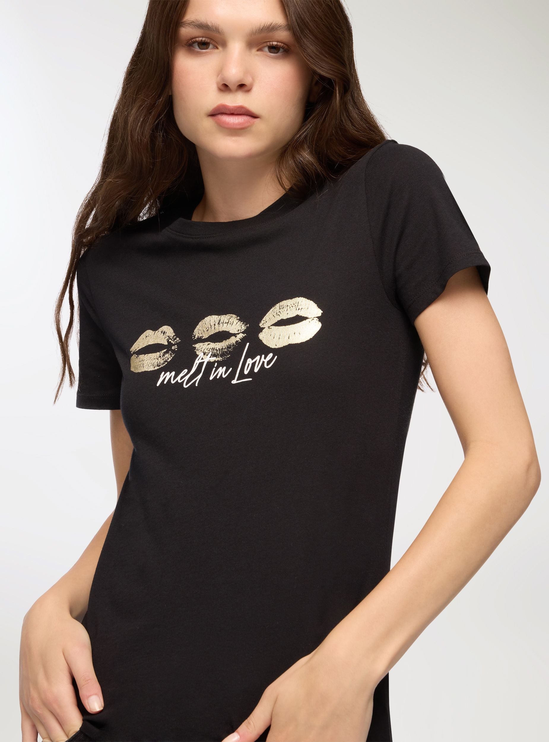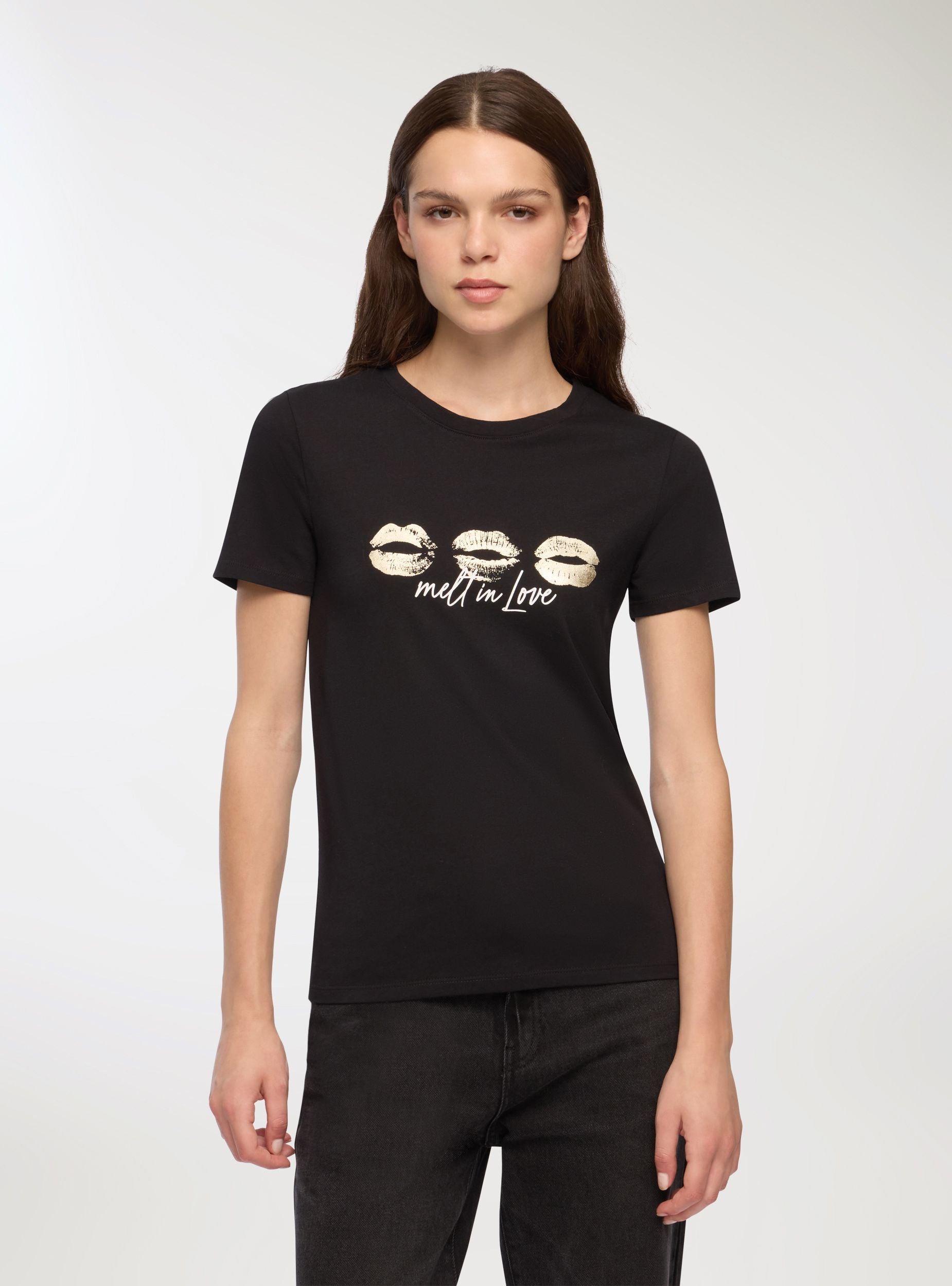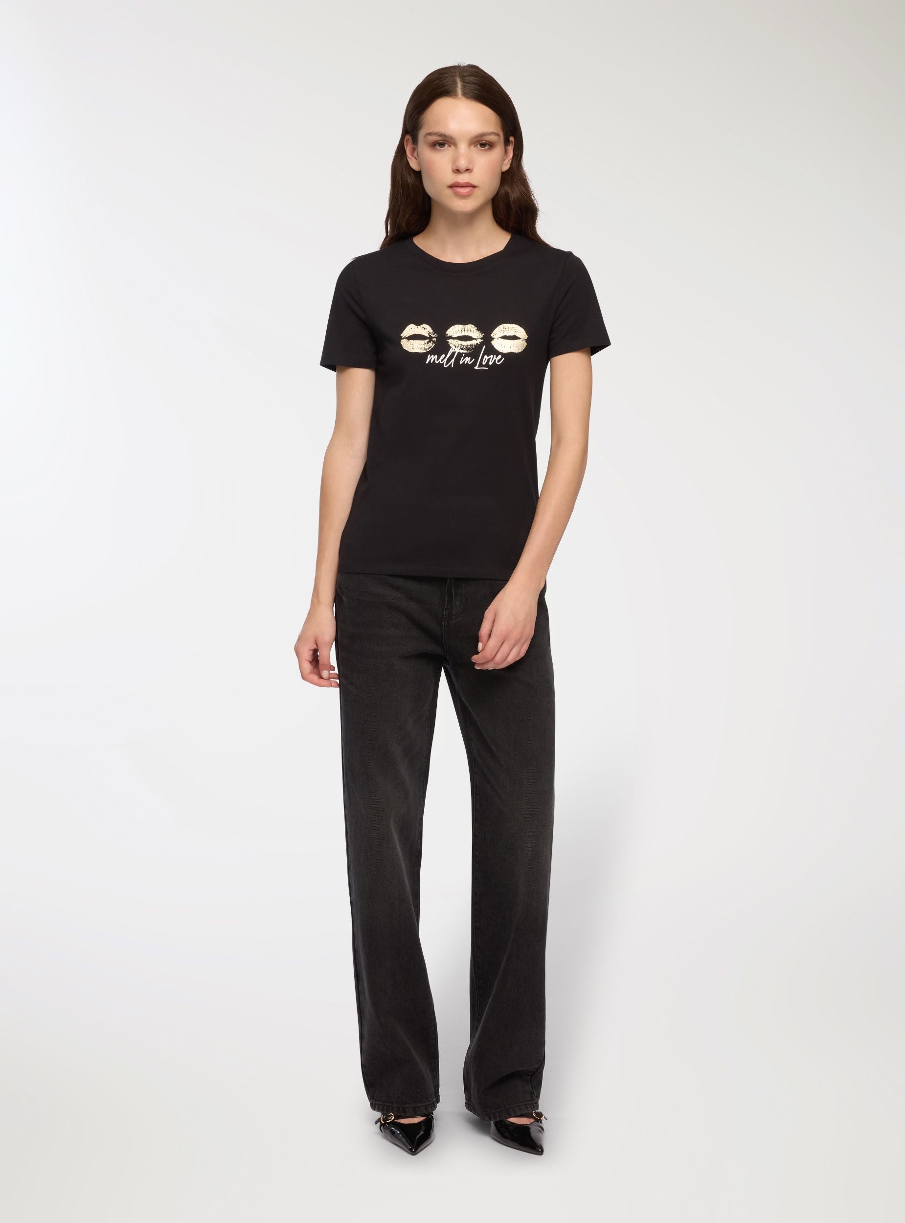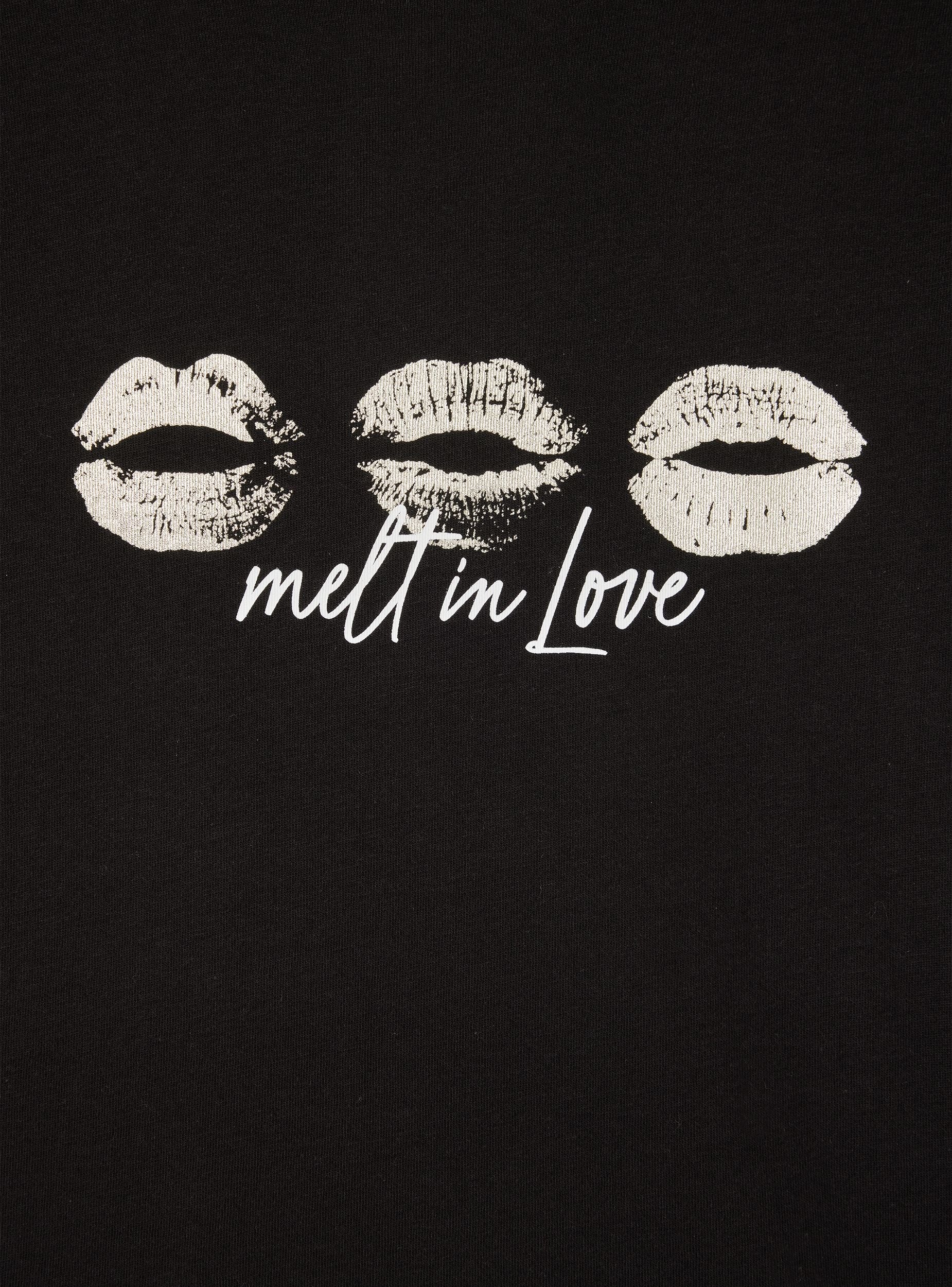 Women's T-shirt with a print of lips and the phrase "melt in love" on the front. Short-sleeved, crew neck design, ideal for a casual and modern look. Perfect to pair with jeans or trousers for an everyday or informal outfit. Regular fit that ensures comfort and style.