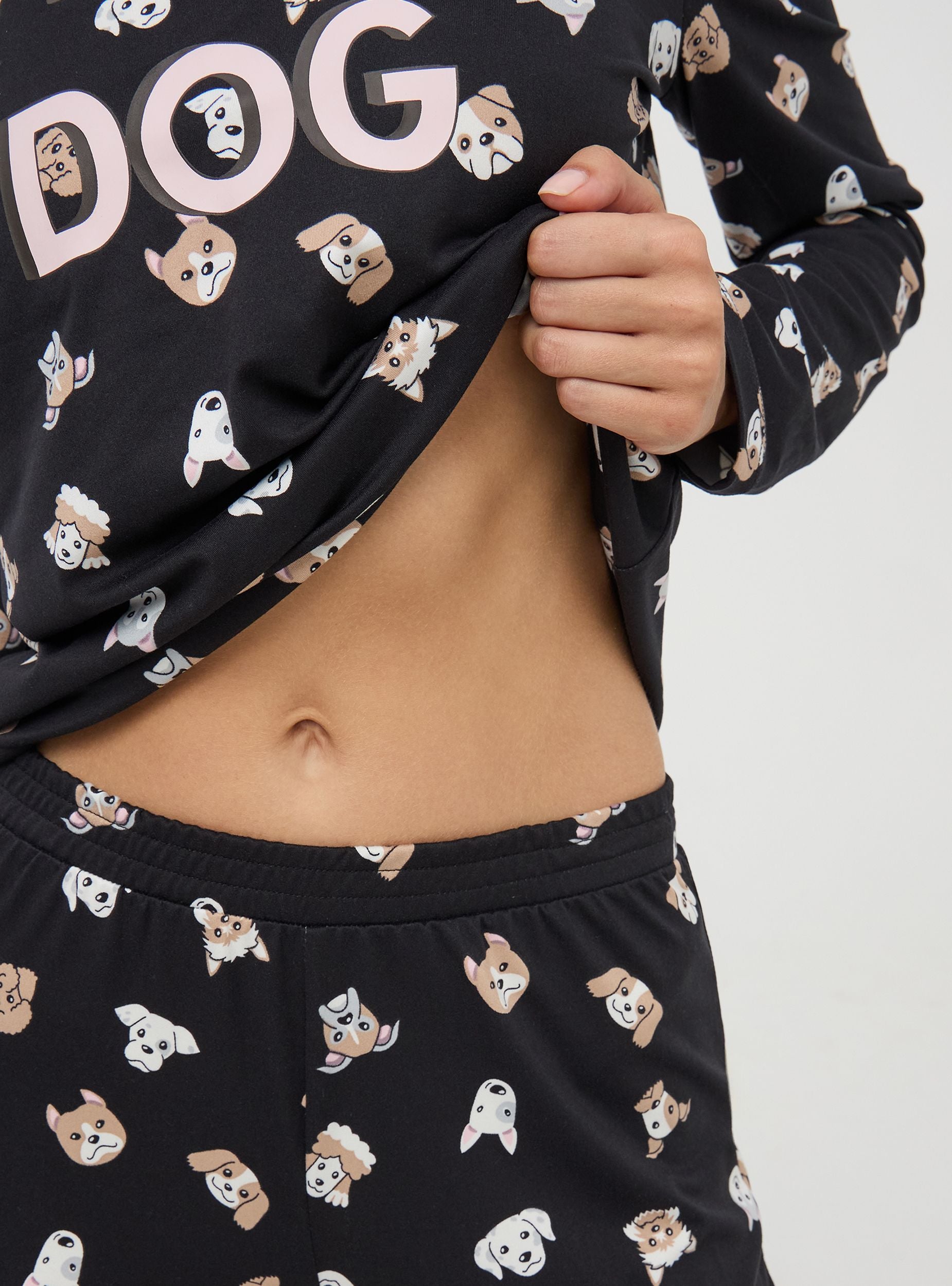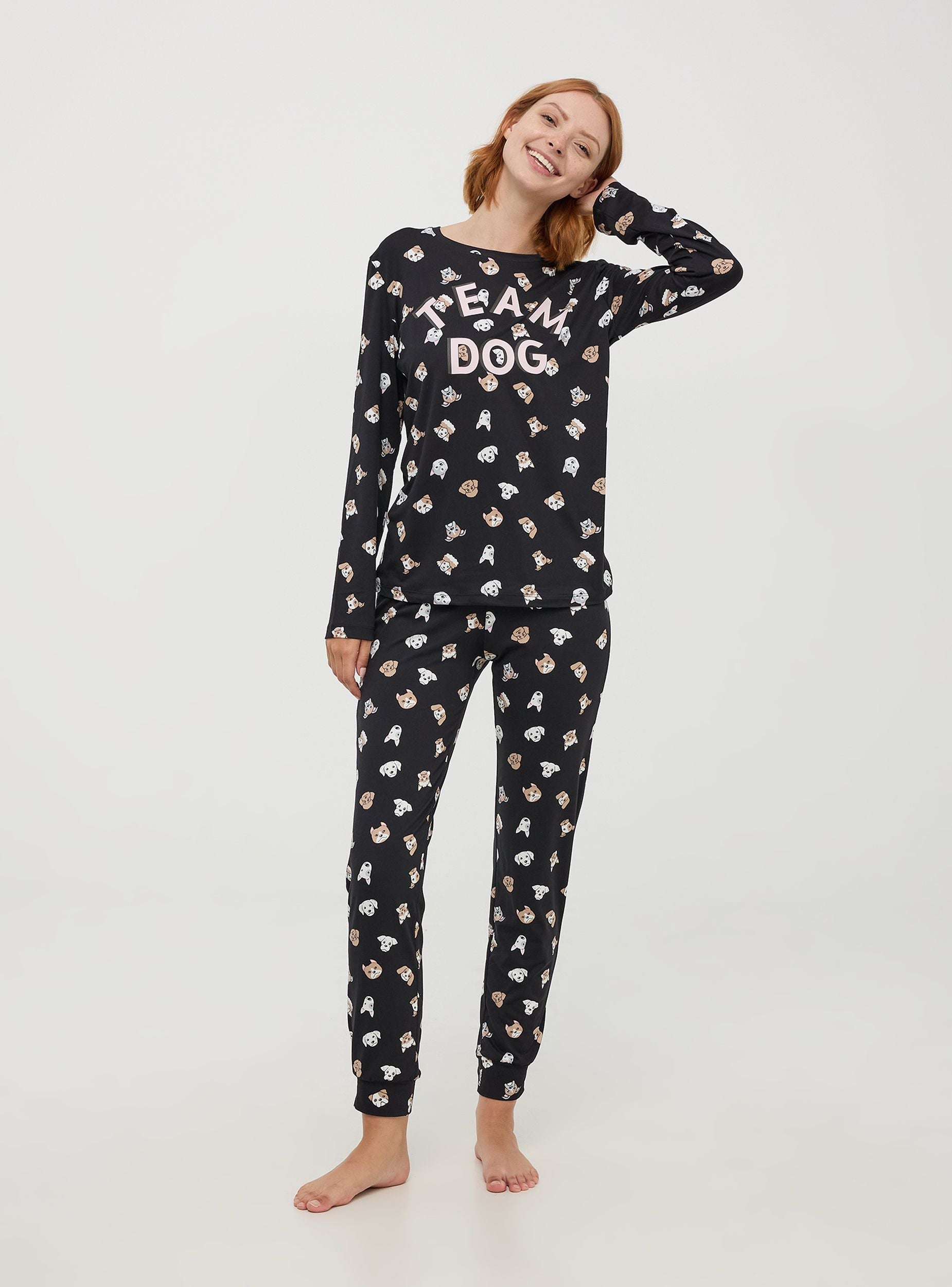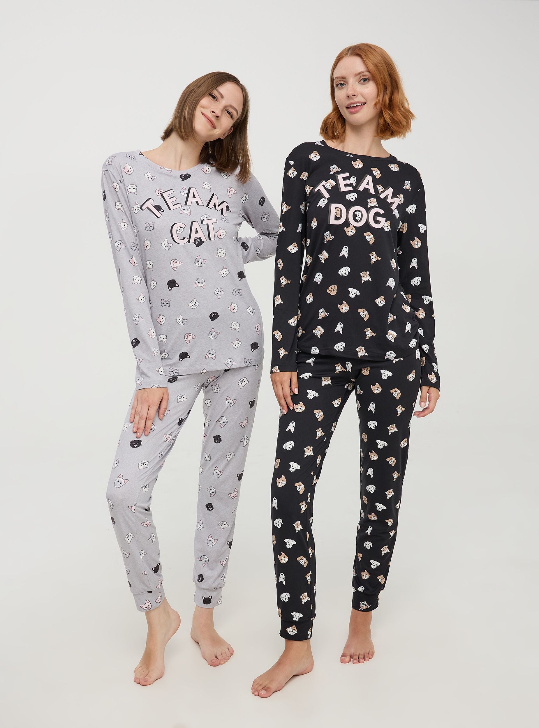 Heavy women's two-piece pyjama consisting of a long-sleeved top and long trousers, both featuring lovely puppy prints and the phrase "Team Dog" on the chest. The fit is relaxed, perfect for comfortable lounging. Equipped with an elastic waistband for a perfect fit.Details