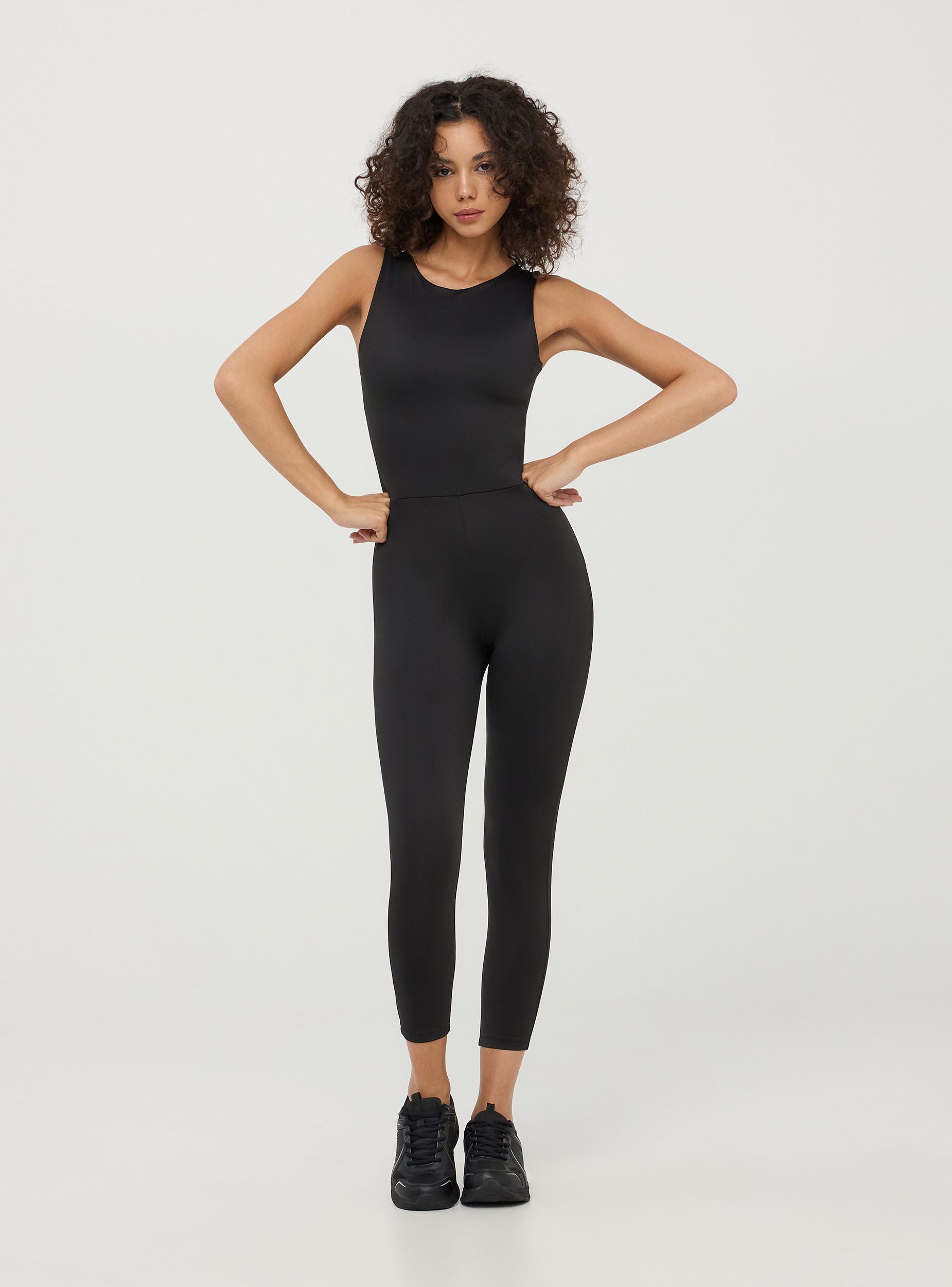 Women's sports suit made from stretch fabric, designed to offer comfort and freedom of movement during physical activity. The suit is solid-coloured and features a fitted design that enhances the silhouette. The front of the suit has a round neckline and wide straps, ensuring complete coverage and secure support. At the back, the suit is characterised by an elegant cut-out detail, adding a touch of style to the garment. Ideal for gym workouts, yoga, or outdoor activities, this sports suit is designed for those seeking a balance between functionality and fashion. The minimalist design also makes it perfect for casual wear, paired with a sports jacket or an oversized sweatshirt. Active line.