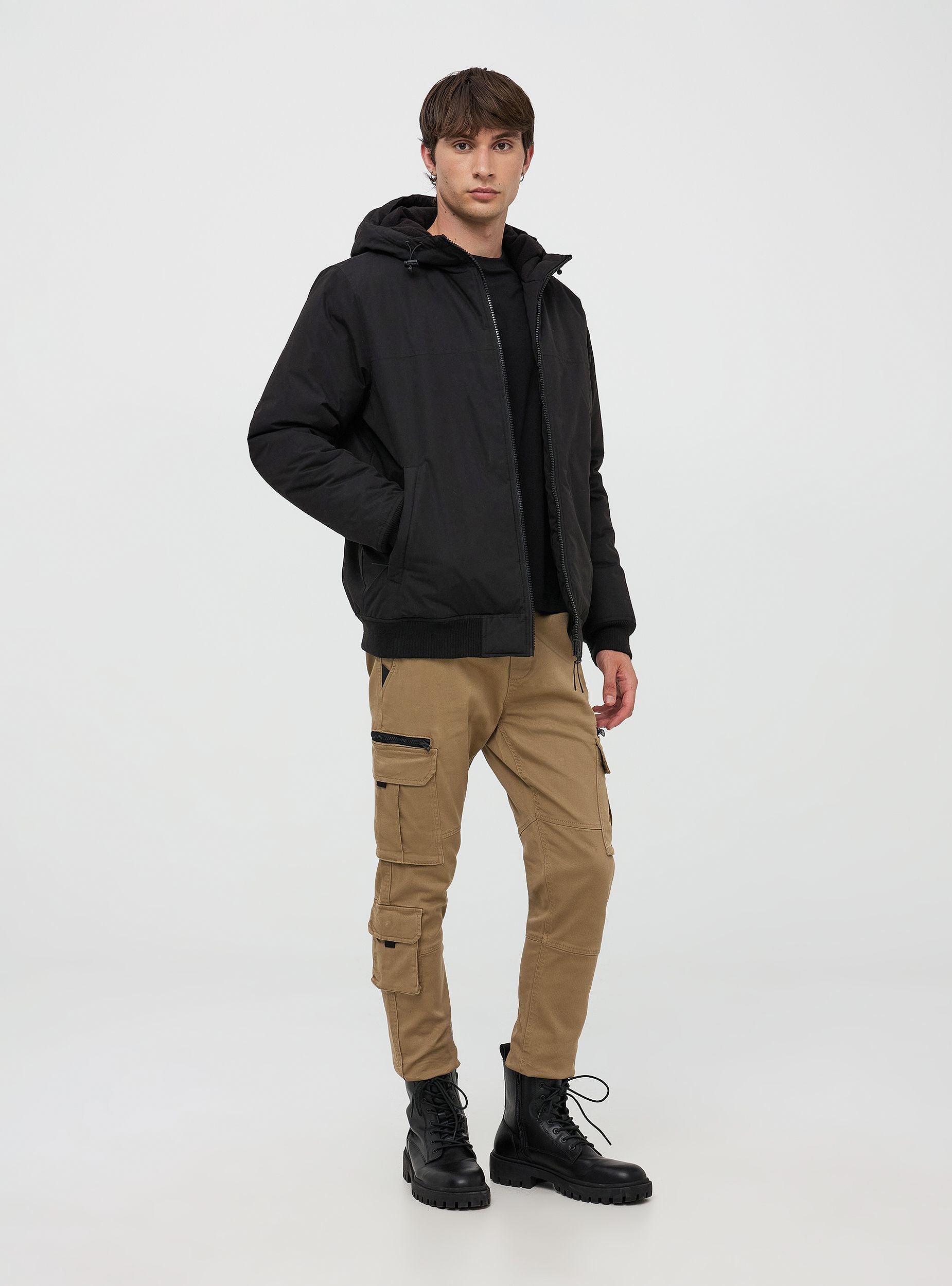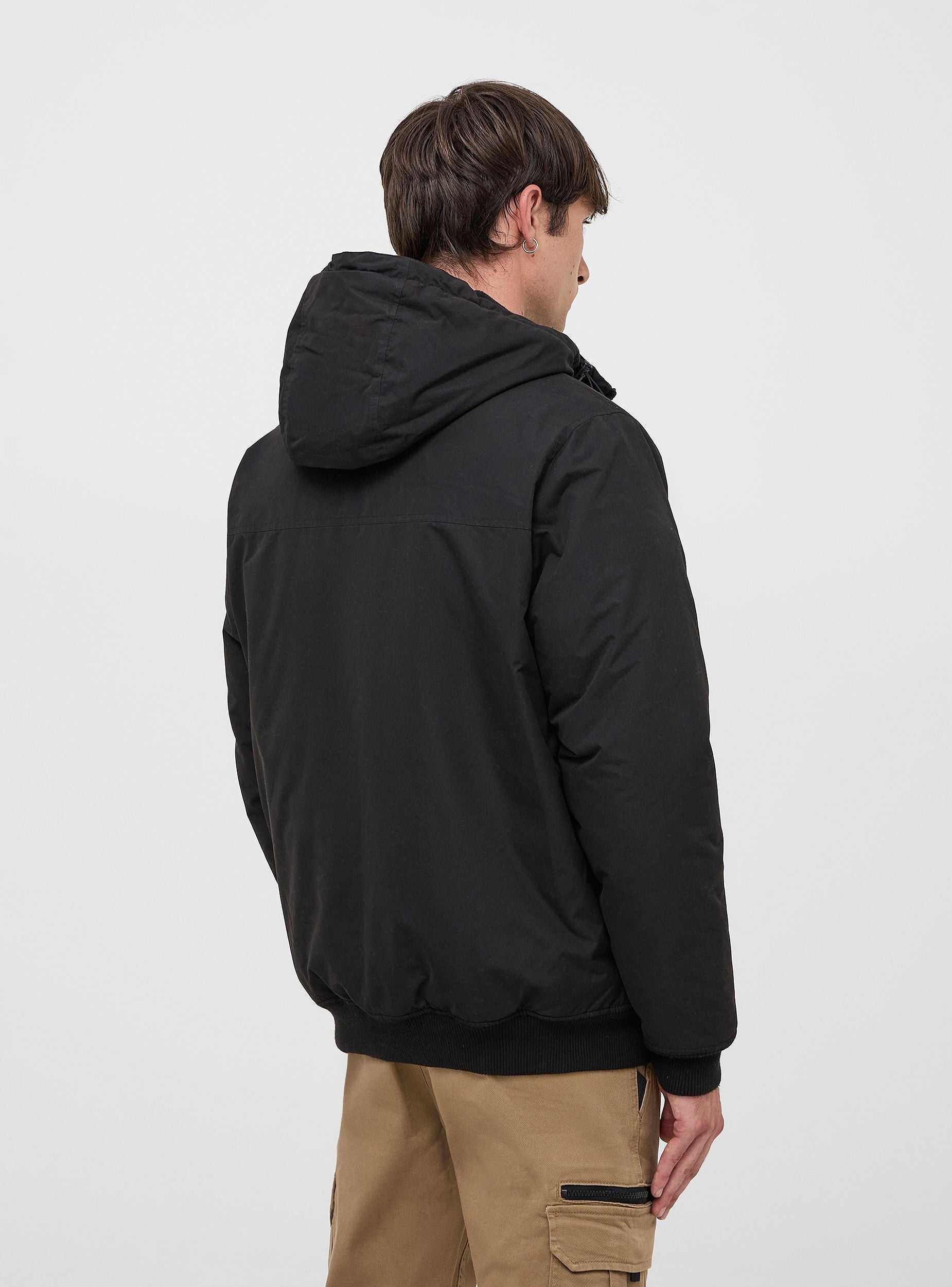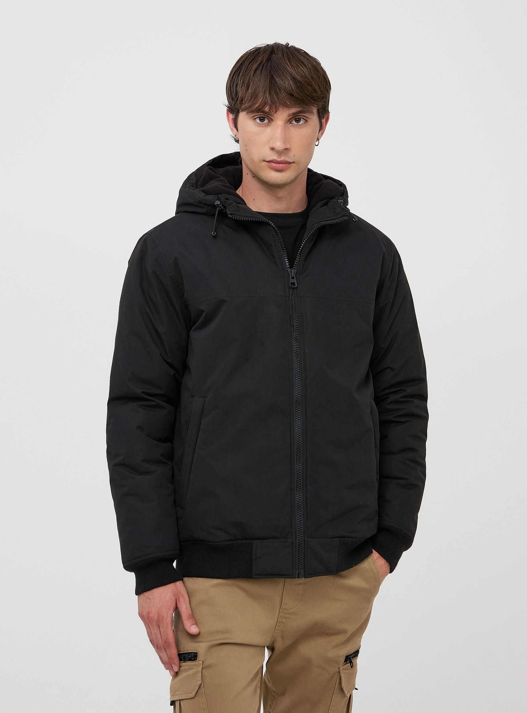 Men's padded jacket made from water-resistant material with a high collar and hood featuring a drawstring and stopper, characterised by a front zip closure and elasticated cuffs. The essential and functional design is completed by a small inner pocket and two outer zip pockets, ideal for securely storing small items. The adjustable hood offers extra protection against wind and rain, while the ribbed hem and cuffs ensure a comfortable fit. This jacket is perfect for cold and windy days in the city, during outdoor activities, or for a casual and sporty look. It can be paired with jeans and sneakers for a practical and fashionable outfit. Wear it for walks, travel, or leisure time, ensuring comfort and style on every occasion.Details