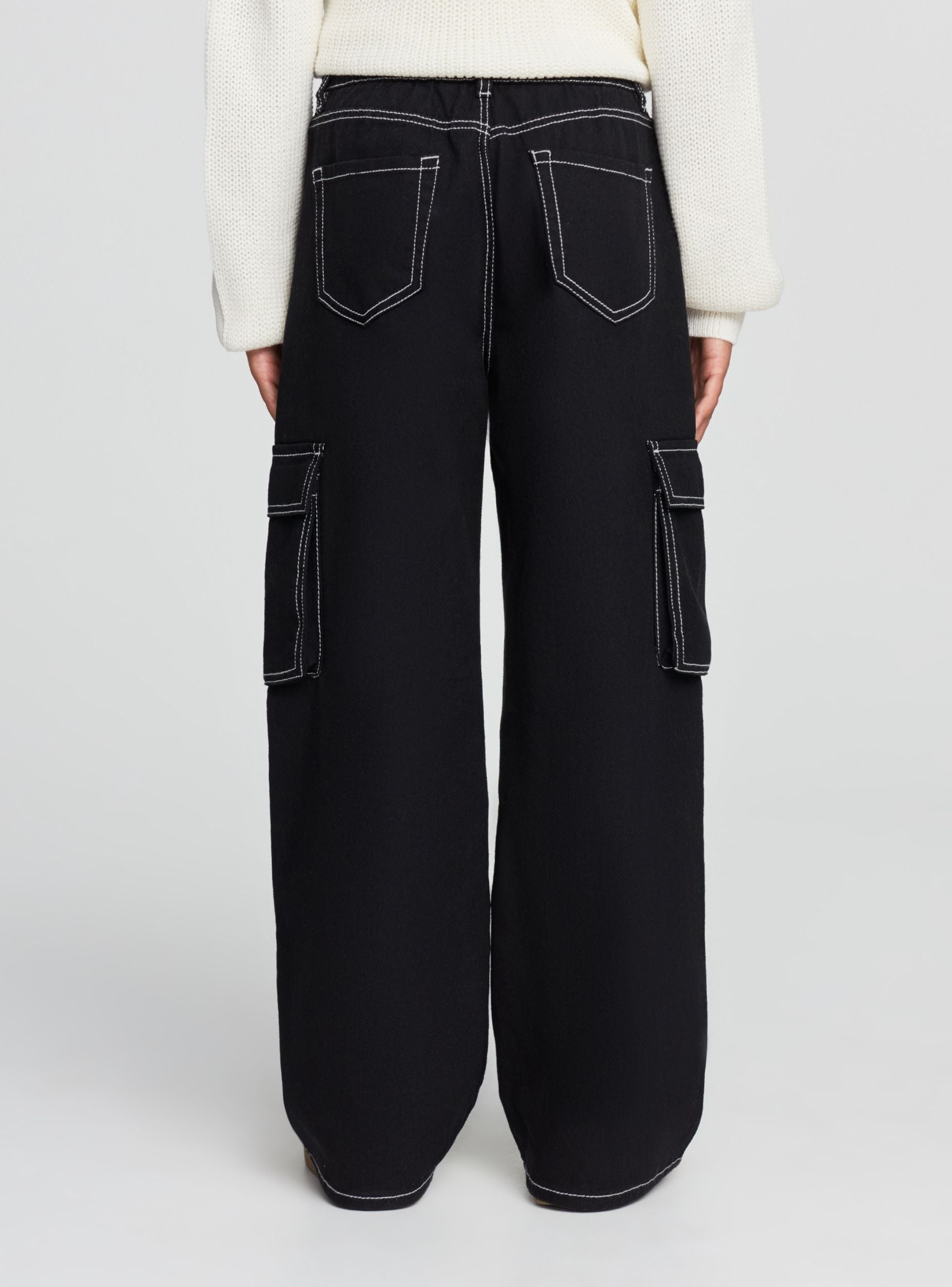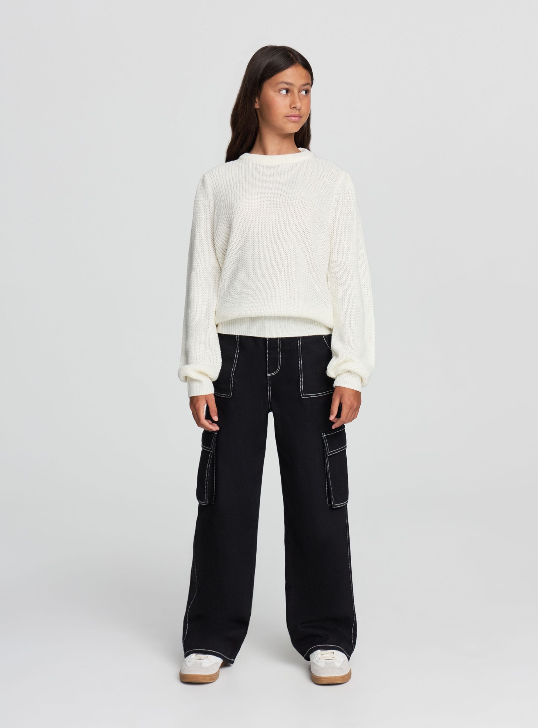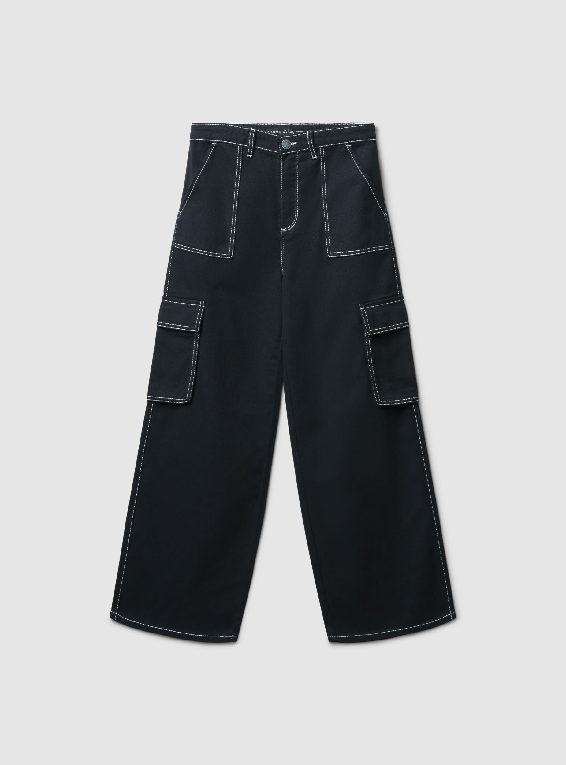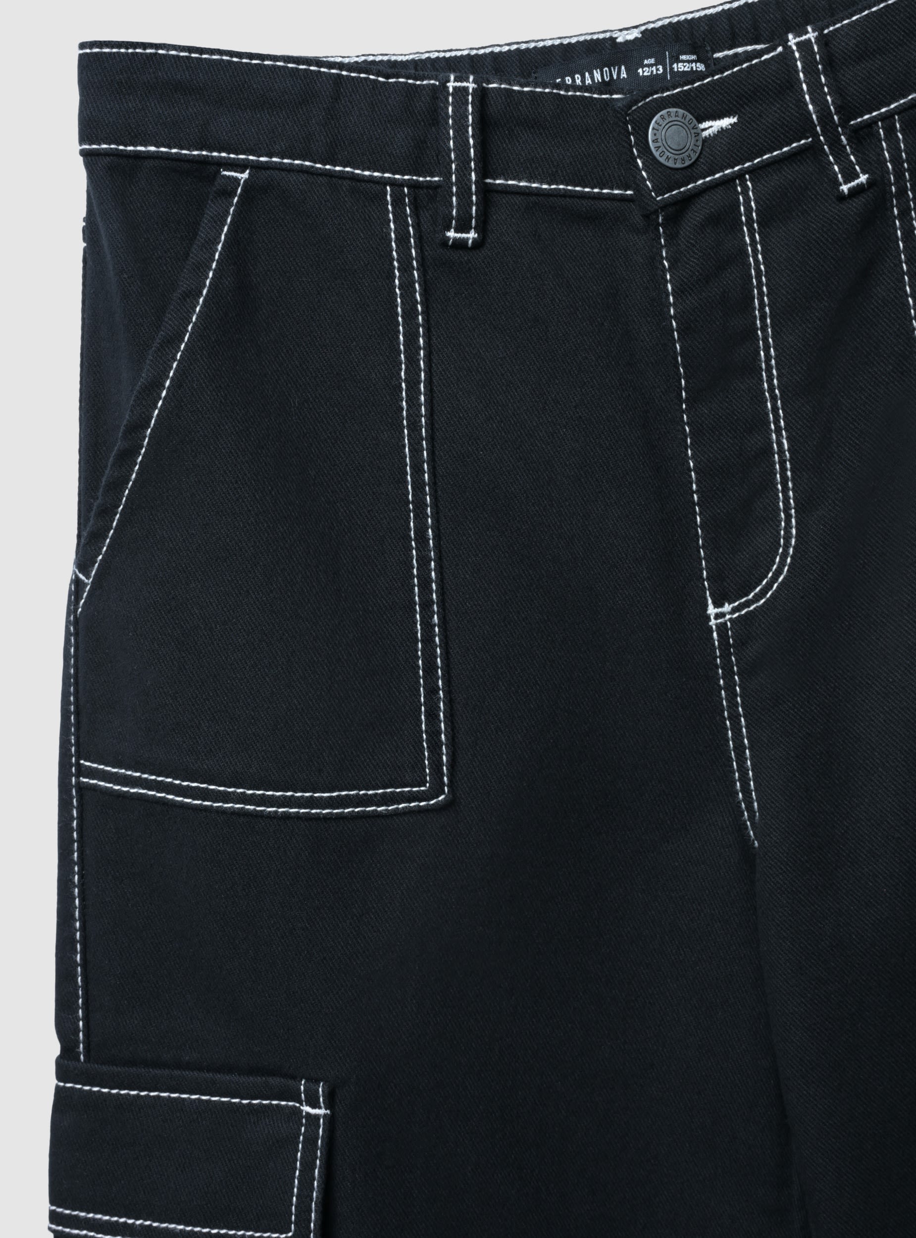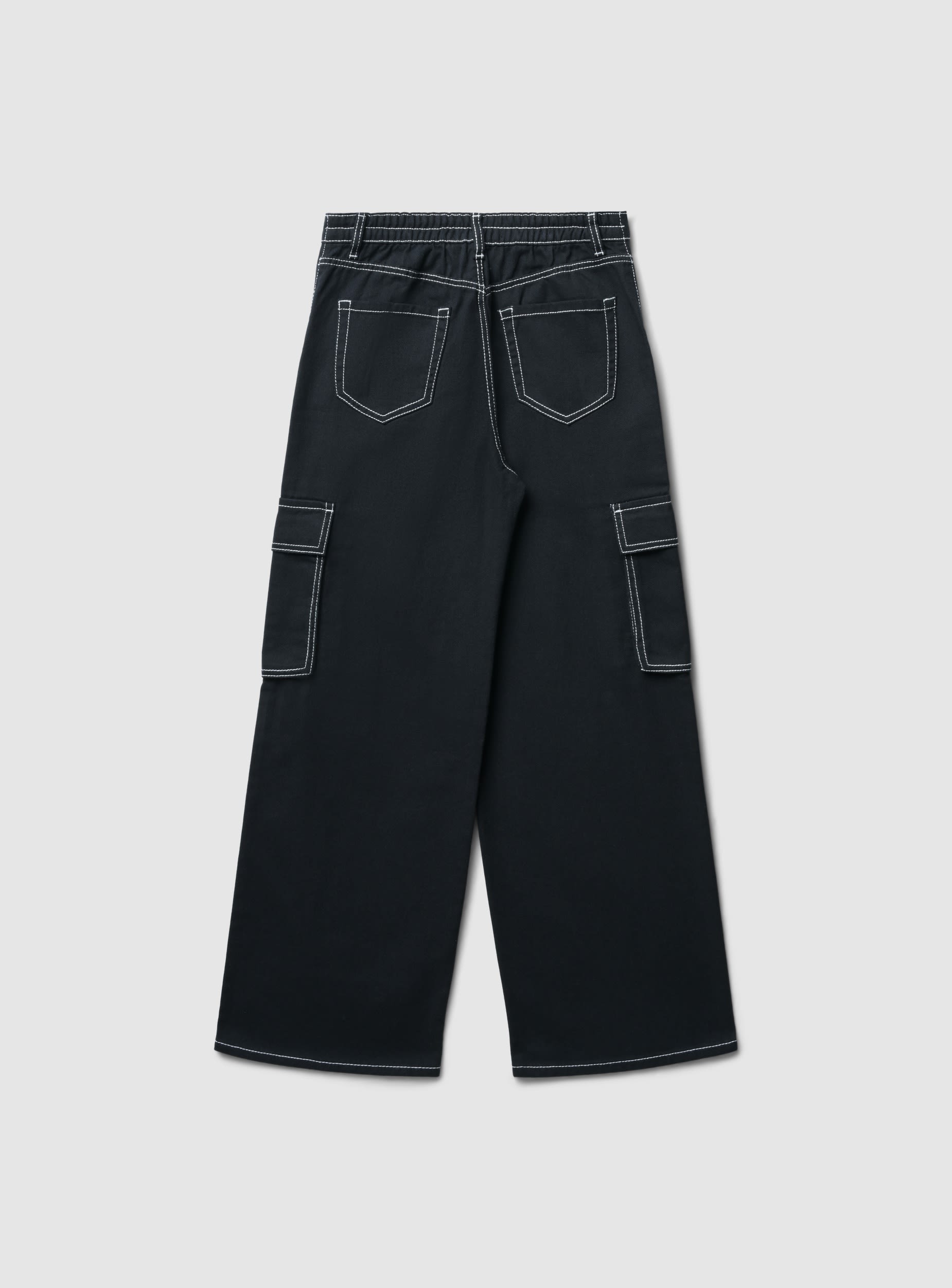 Girls' long pants with a cargo design and a loose fit. Equipped with side and back pockets, they offer practicality and style for a casual and modern look. Ideal to pair with t-shirts or sweatshirts, they are perfect for a comfortable and fashionable outfit. The closure features a button and zipper. Belt loops add a functional and versatile touch.