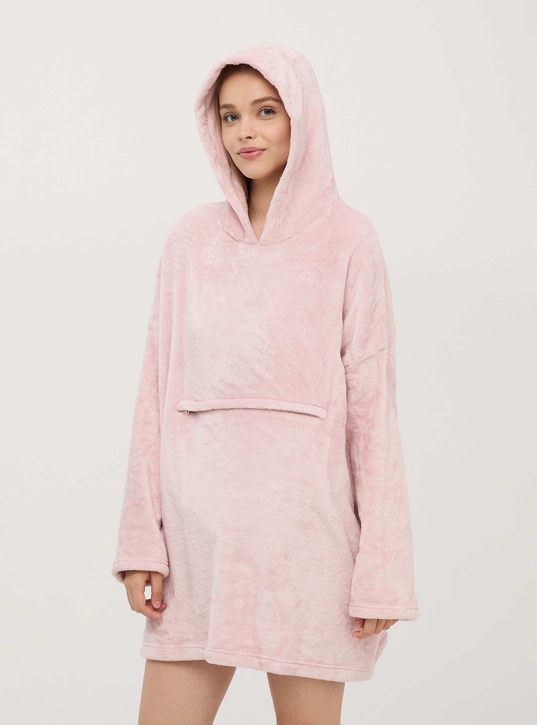 Wide women's sweatshirt in soft fleece, with a hood and a large heart-shaped front pocket that allows the sweatshirt to be folded and perfectly inserted inside it. This particular packaging adds a touch of originality and elegant presentation, making it also a great gift idea.