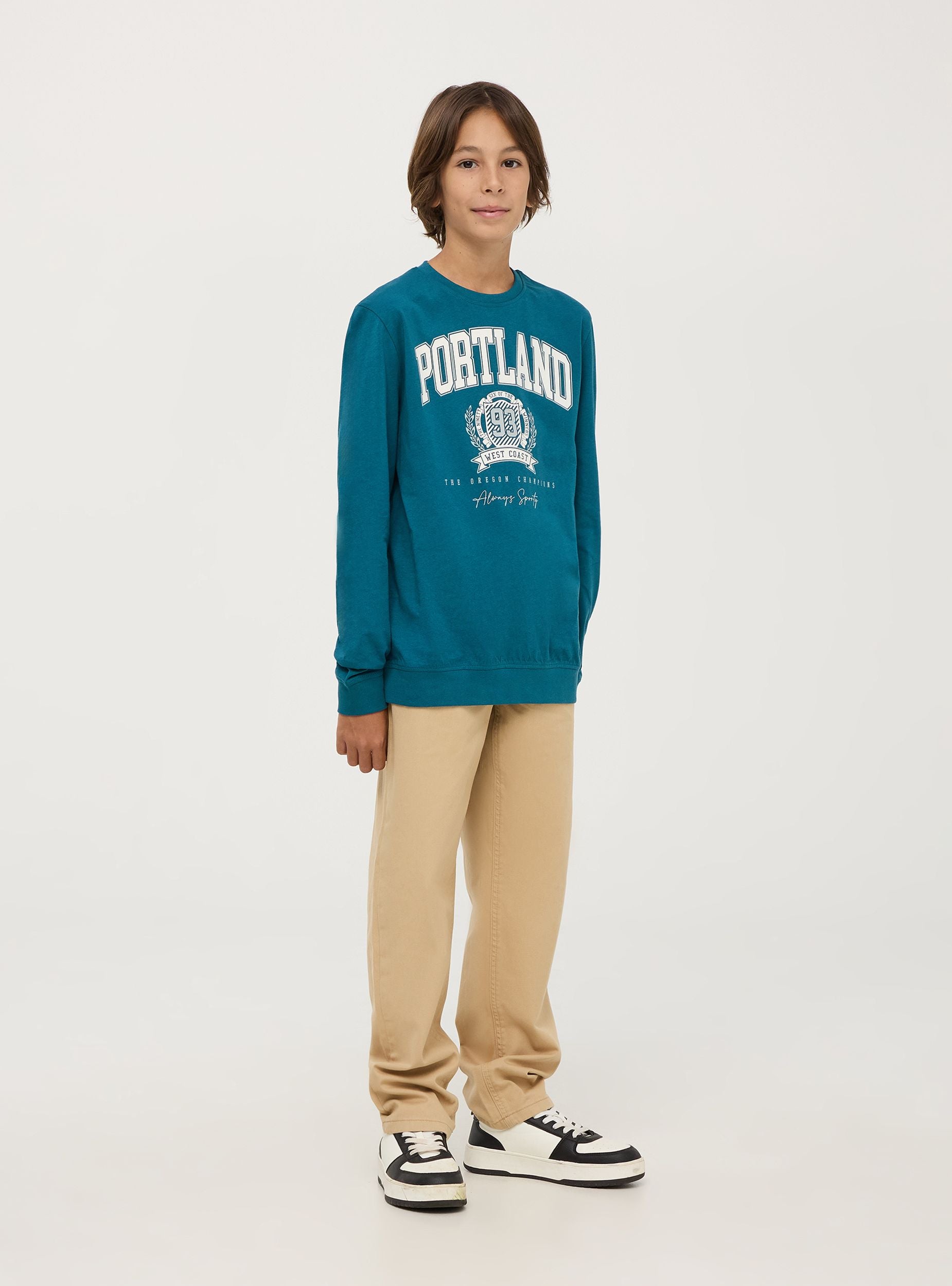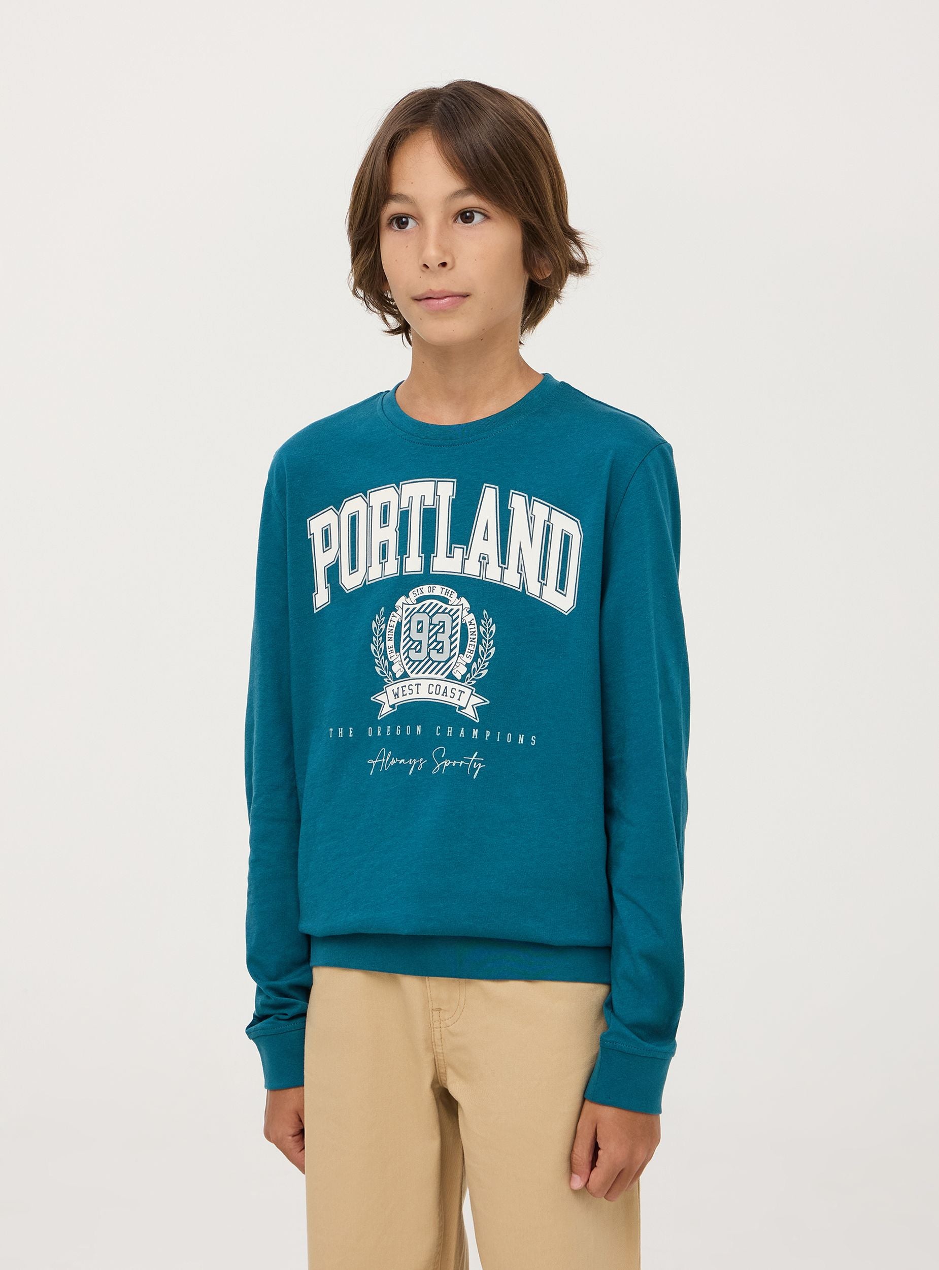 Long-sleeved children's t-shirt in soft cotton with a front print of "Portland" in college style on the front. Ribbed cuffs, hem and crew neck for a comfortable fit. Ideal for everyday activities and for a casual and sporty look, perfect for school and leisure time.Details