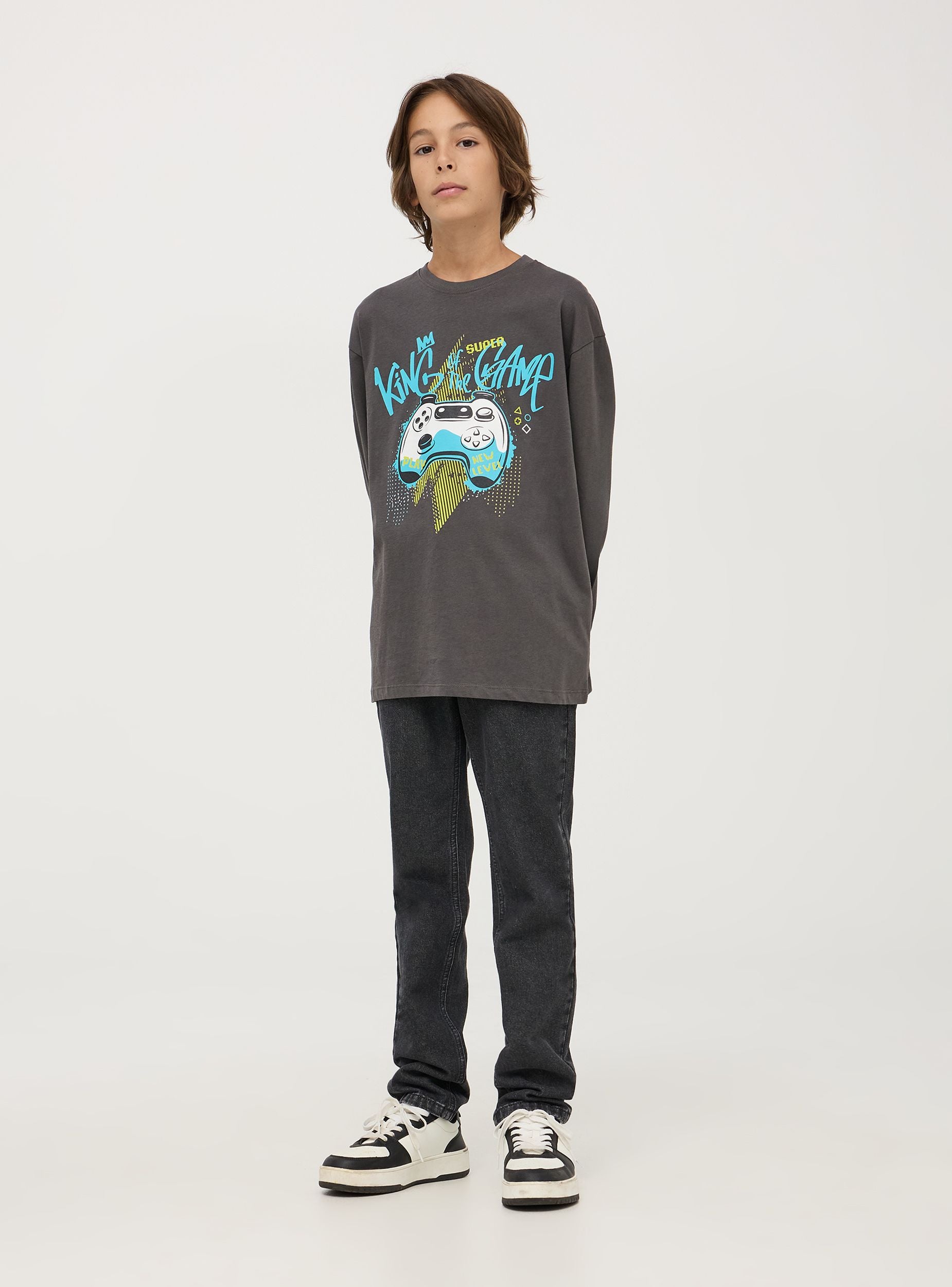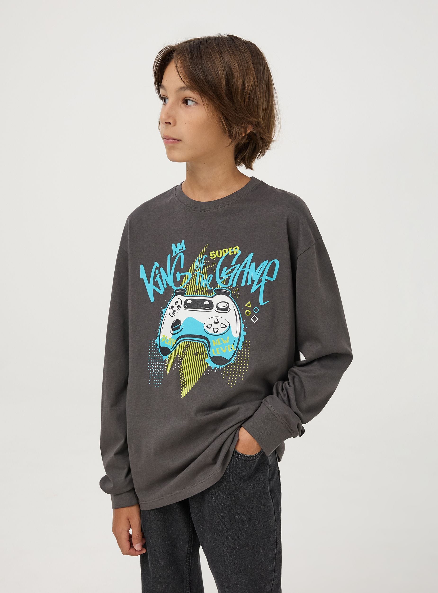 Long-sleeved t-shirt for children with a vibrant central print "King of the Game". The graphic features a game controller. The garment offers a comfortable and casual fit, perfect for leisure time and school days.Details